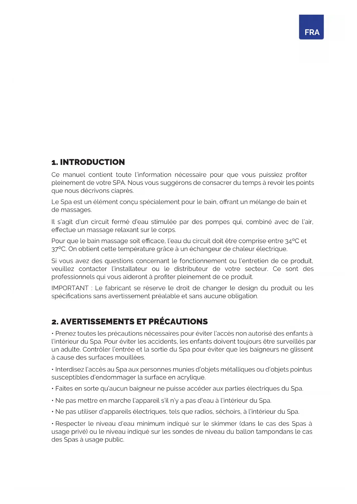 Ce manuel contient toute l’information nécessaire pour que vous puissiez proter pleinement de votre SPA. Nous vous suggérons de consacrer du temps à revoir les points que nous décrivons ciaprès. Le Spa est un élément conçu spécialement pour le bain, orant un mélange de bain et de massages. Il s’agit d’un circuit fermé d’eau stimulée par des pompes qui, combiné avec de l’air, eectue un massage relaxant sur le corps. Pour que le bain massage soit ecace, l’eau du circuit doit être comprise entre 34ºC et 37ºC. On obtient cette température grâce à un échangeur de chaleur électrique. Si vous avez des questions concernant le fonctionnement ou l’entretien de ce produit, veuillez contacter l’installateur ou le distributeur de votre secteur. Ce sont des professionnels qui vous aideront à proter pleinement de ce produit. IMPORTANT : Le fabricant se réserve le droit de changer le design du produit ou les spécications sans avertissement préalable et sans aucune obligation.