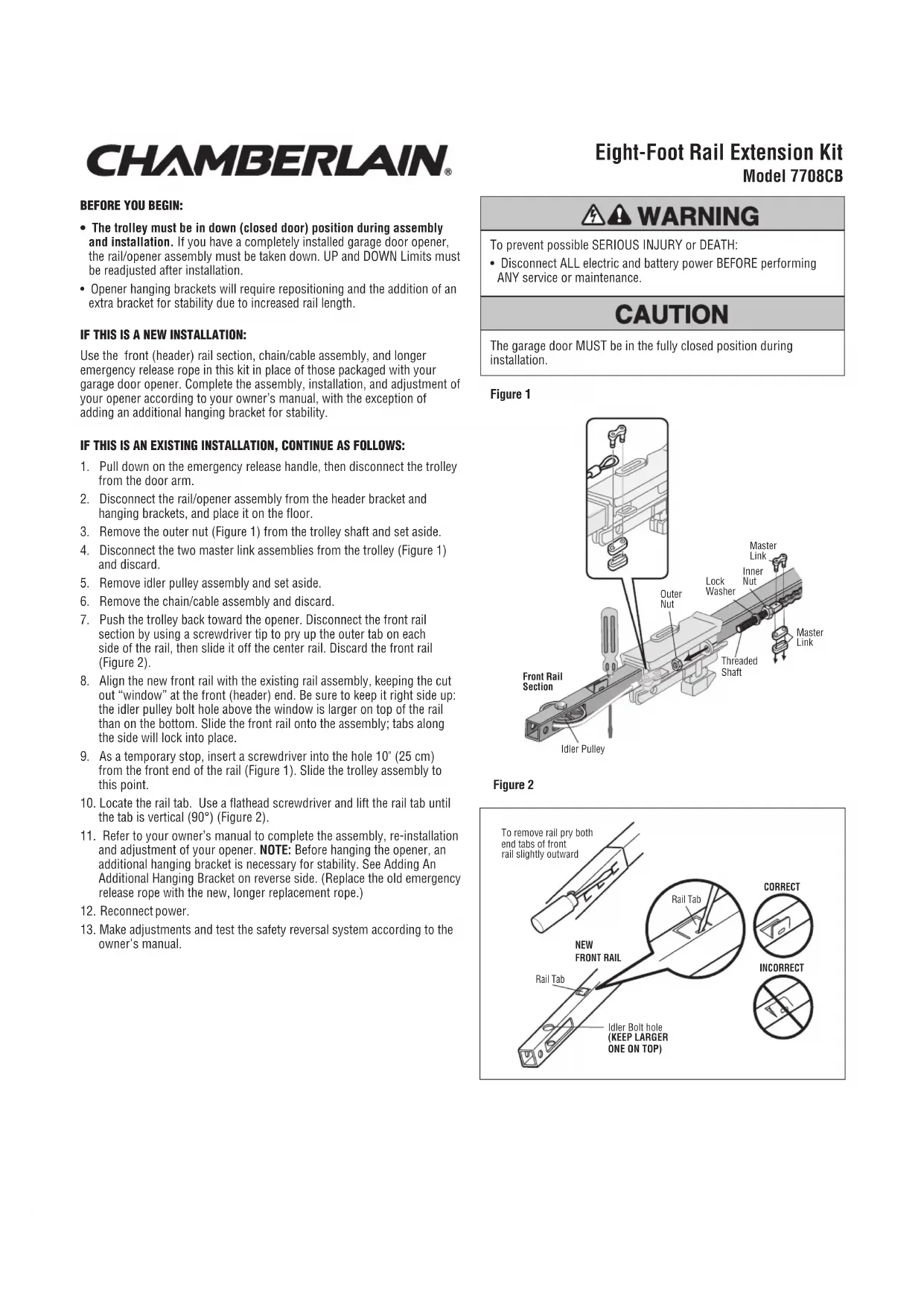 - Débranchez TOUTE alimentation électrique et piles AVANT d’effectuer TOUT entretien ou maintenance. La porte de garage DOIT être complètement fermée pendant l’installation. ATTENTION ATTENTION AVERTISSEMENT AVERTISSEMENT AVERTISSEMENTAVERTISSEMENT AVERTISSEMENT AVERTISSEMENT AVERTISSEMENT AVERTISSEMENT ATTENTIONATTENTION ATTENTION AVERTISSEMENT AVERTISSEMENT AVERTISSEMENT AVERTISSEMENT AVERTISSEMENT AVERTISSEMENT AVERTISSEMENT Figure 1 Figure 2 Trou de boulon de poulie - guide (GARDER LE GROS TROU SUR LE DESSUS)NOUVEAU RAIL AVANTPour retirer le rail, faire levier sur les deux languettes d'extrémité du rail avant légèrement vers l'extérieur. BON MAUVAISL’ongletdu railL’ongletdu railMaillon de raccordÉcrouextérieurÉcrou intérieur Rondelle-freinMaillon de raccordRail avantTige filetéePouliePour éviter d’éventuelles BLESSURES GRAVES par suite de la chute d’un ouvre-porte de garage, fixer l’ouvre-porte SOLIDEMENT aux solives du garage. On DOIT utiliser des ancrages de béton si les supports sont posés dans la maçonnerie. ATTENTION ATTENTION AVERTISSEMENTAVERTISSEMENT AVERTISSEMENT AVERTISSEMENT AVERTISSEMENT AVERTISSEMENT AVERTISSEMENT AVERTISSEMENT