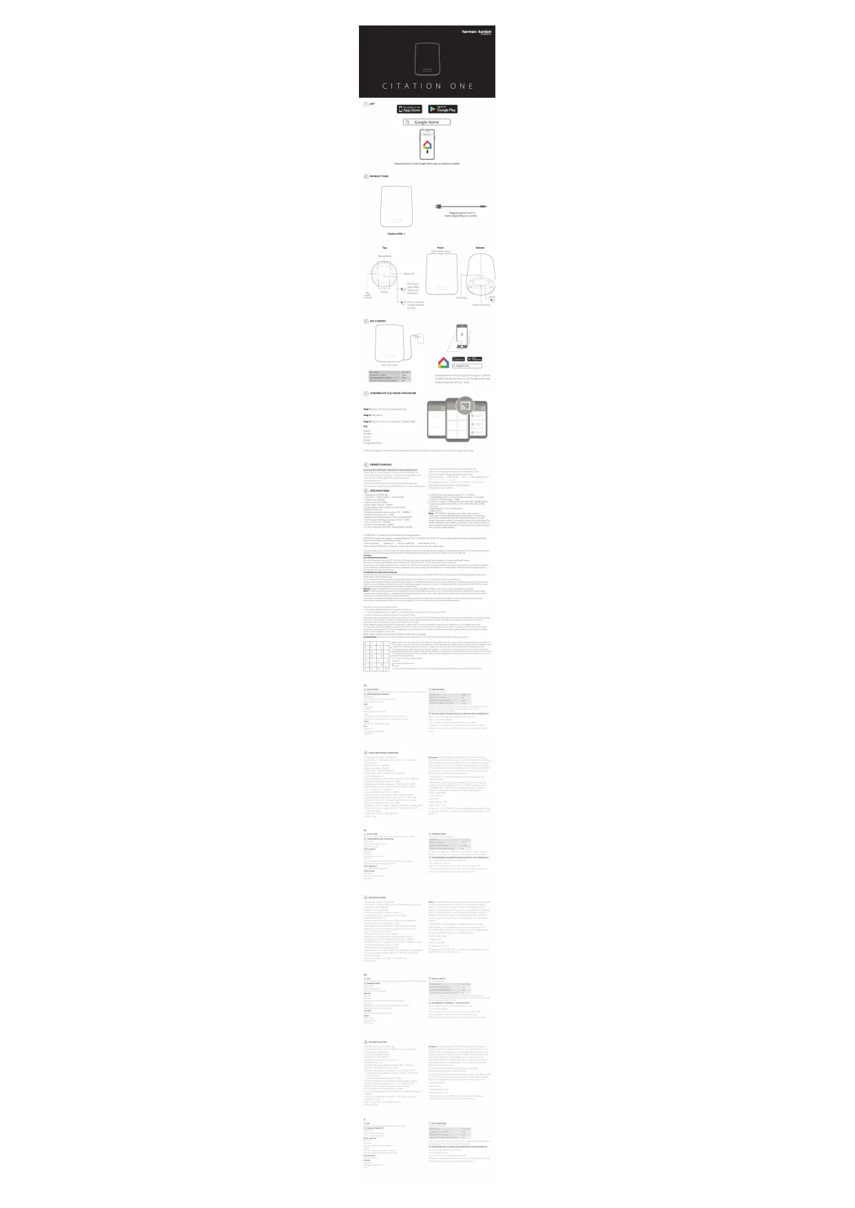 Mettez-la sous tension Téléchargez et lancez l’application Google Home sur votre téléphone ou votre tablette. Configurez votre appareil dans l’application Google Home. *Activer le Bluetooth (iPhone/iPad). INSTRUCTIONS POUR ÉCOUTER DE LA MUSIQUE AVEC CHROMECAST Étape 1 : Ouvrez une application compatible avec Chromecast Étape 2 : Lancez de la musique Étape 3 : Cliquez sur l’icône Cast et sélectionnez « Citation ONE »