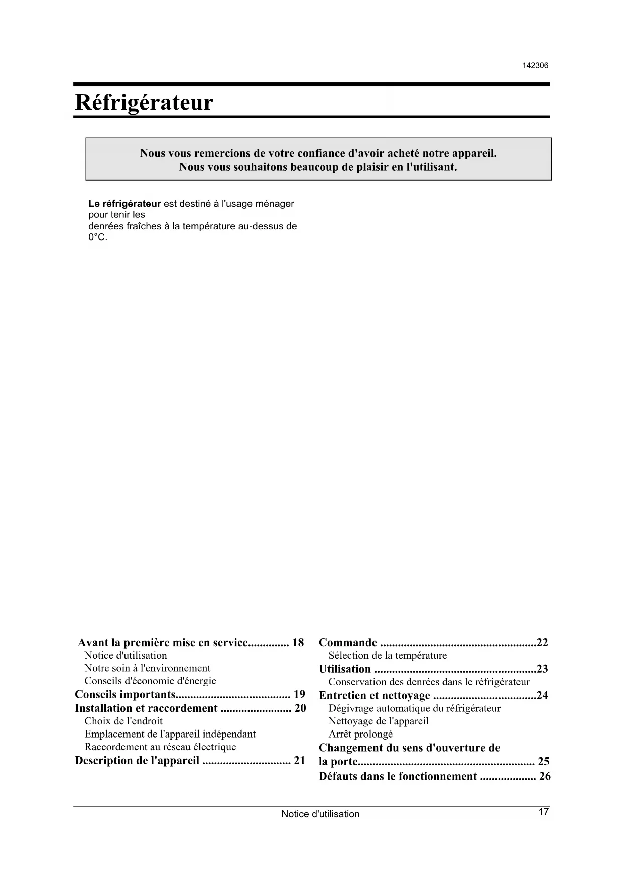 - Réfrigérateur Nous vous remercions de votre confiance d'avoir acheté notre appareil. Nous vous souhaitons beaucoup de plaisir en l'utilisant. Le réfrigérateur est destiné à l'usage ménager pour tenir les denrées fraîches à la température au-dessus de 0°C. Avant la première mise en service p. 18