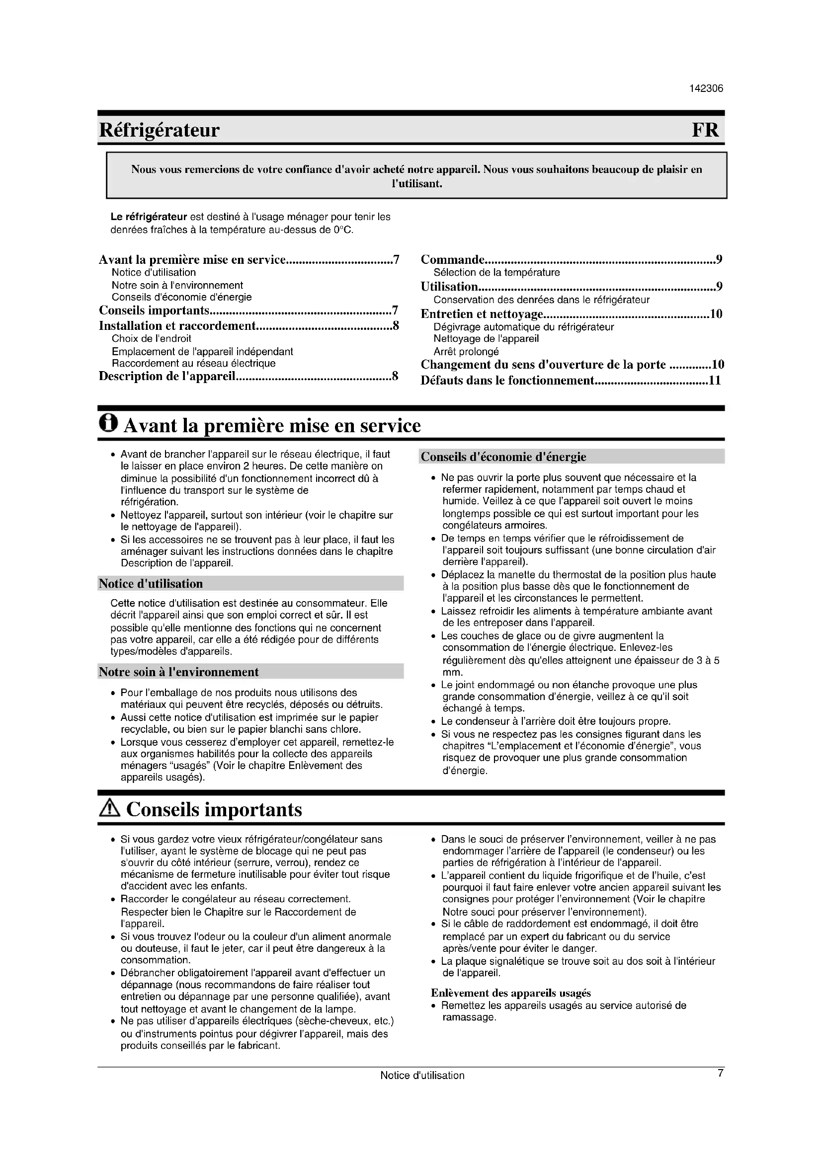 - Notice d'utilisation Notre soin à l'environnement Conseils d'économie d'énergie Conseils importants p. 7