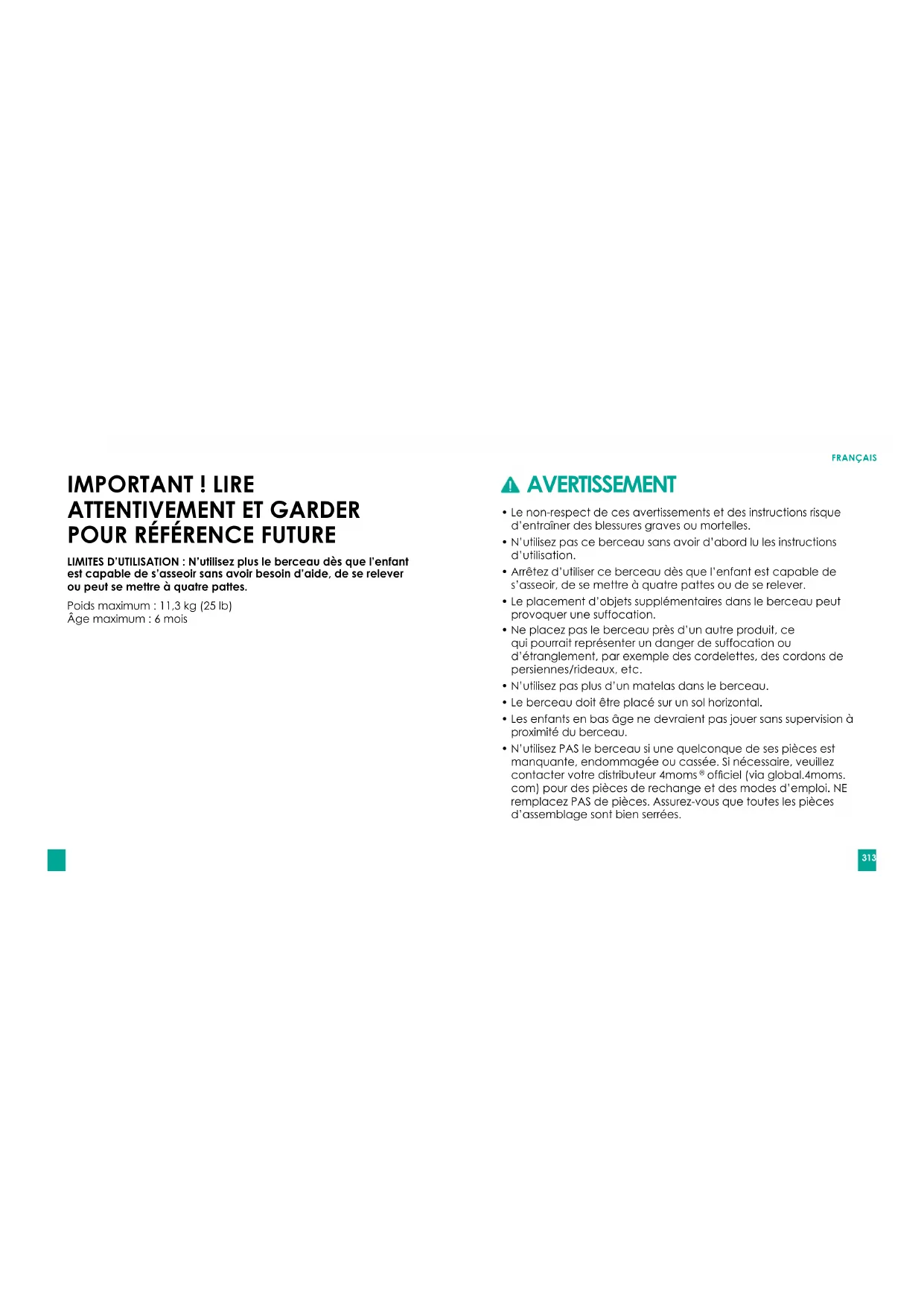 LIMITES D’UTILISATION : N’utilisez plus le berceau dès que l’enfant est capable de s’asseoir sans avoir besoin d’aide, de se relever ou peut se mettre à quatre pattes. Poidsmaximum:11,3kg(25lb) Âge maximum : 6 mois AVERTISSEMENT