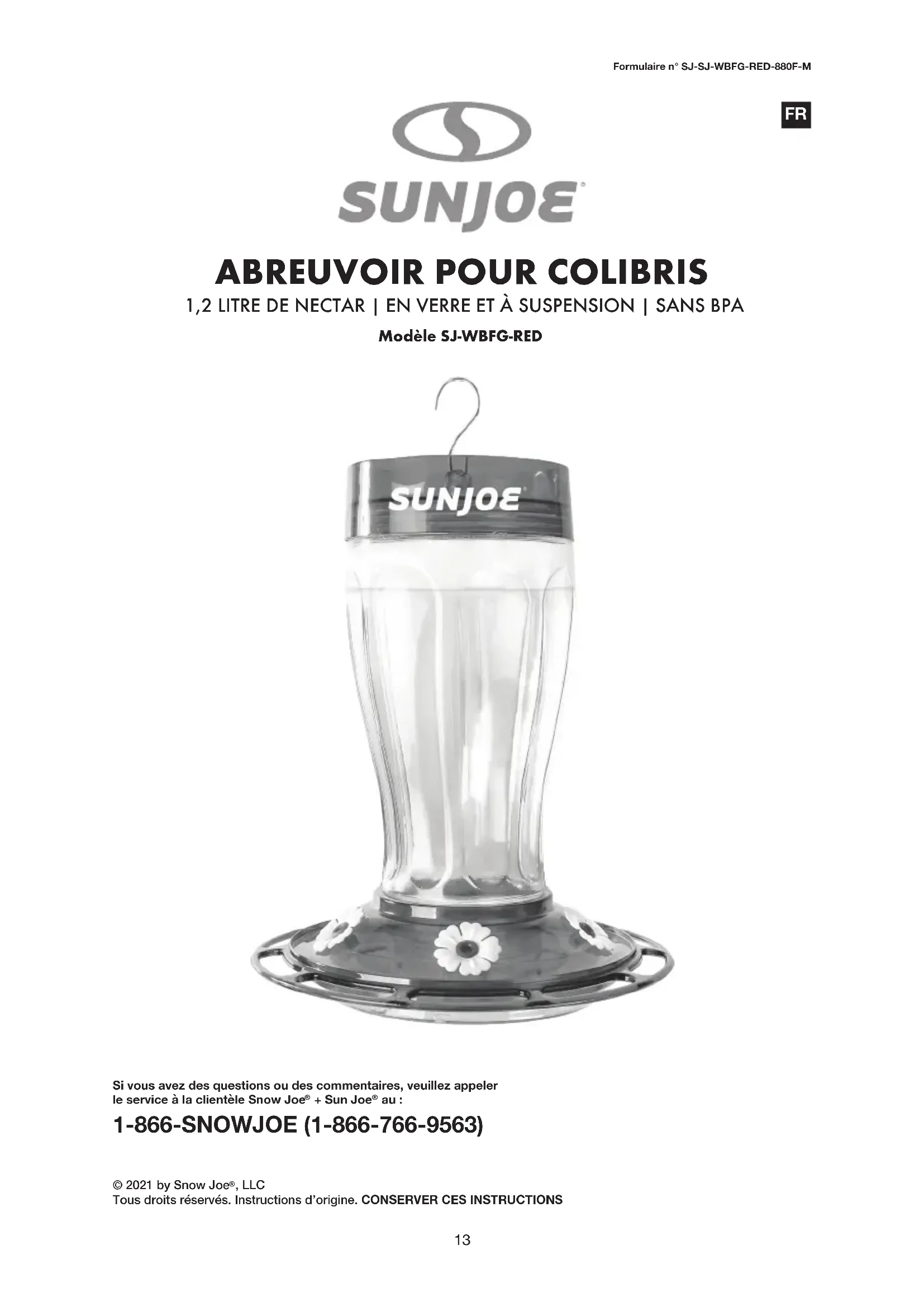 1,2 LITRE DE NECTAR | EN VERRE ET À SUSPENSION | SANS BPA Modèle SJ-WBFG-RED13 Si vous avez des questions ou des commentaires, veuillez appeler le service à la clientèle Snow Joe + Sun Joe au : 1-866-SNOWJOE (1-866-766-9563) © 2021 by Snow Joe , LLCTous droits réservés. Instructions d’origine. CONSERVER CES INSTRUCTIONS Formulaire n° SJ-SJ-WBFG-RED-880F-M