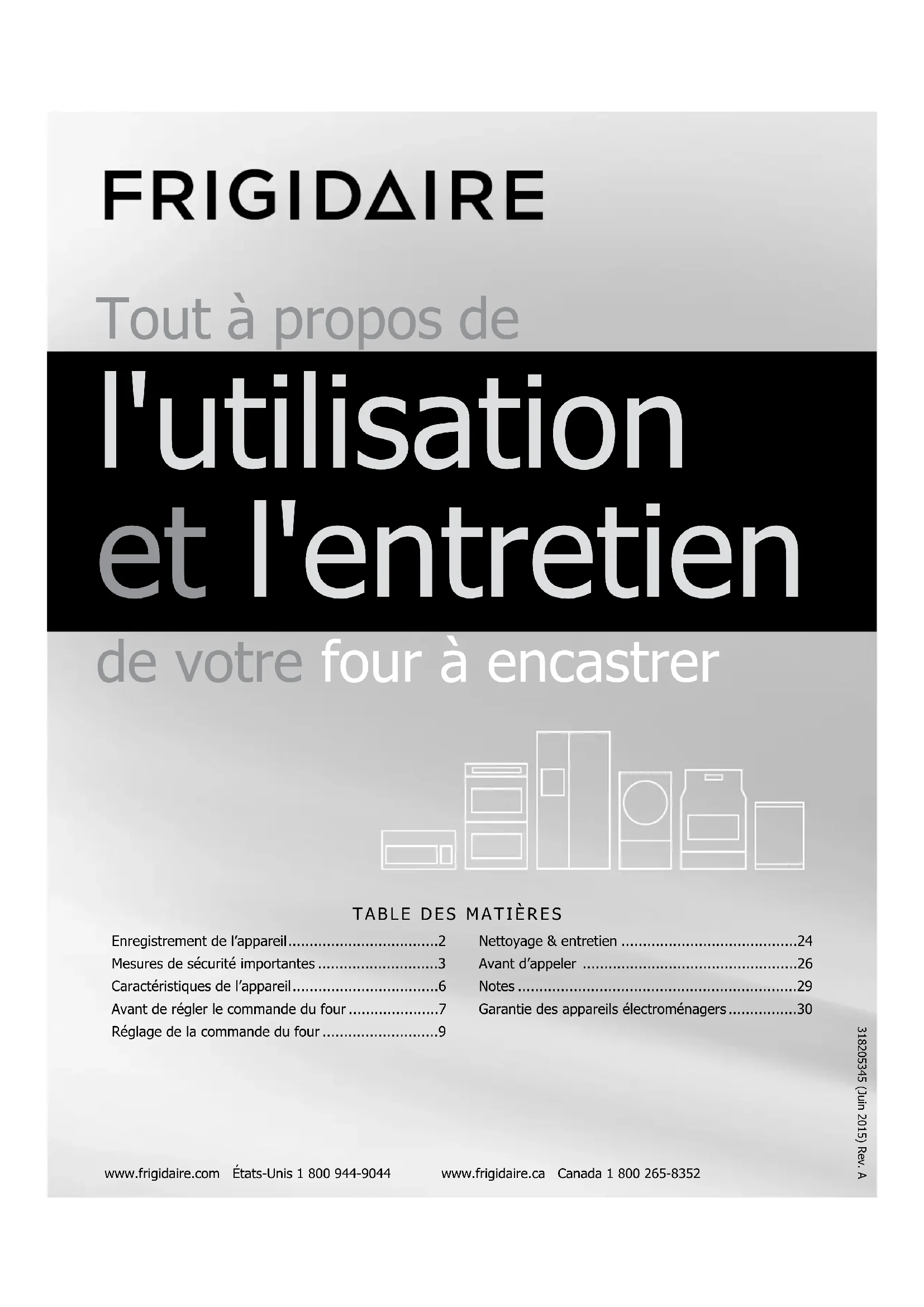 - www.frigidaire.com États-Unis 1 800 944-9044 www.frigidaire.ca Canada 1 800 265-8352 Tout à propos de l'utilisation et l'entretien de votre four à encastrer 318205345 (Juin 2015) Rev. A Enregistrement de l’appareil p. 2