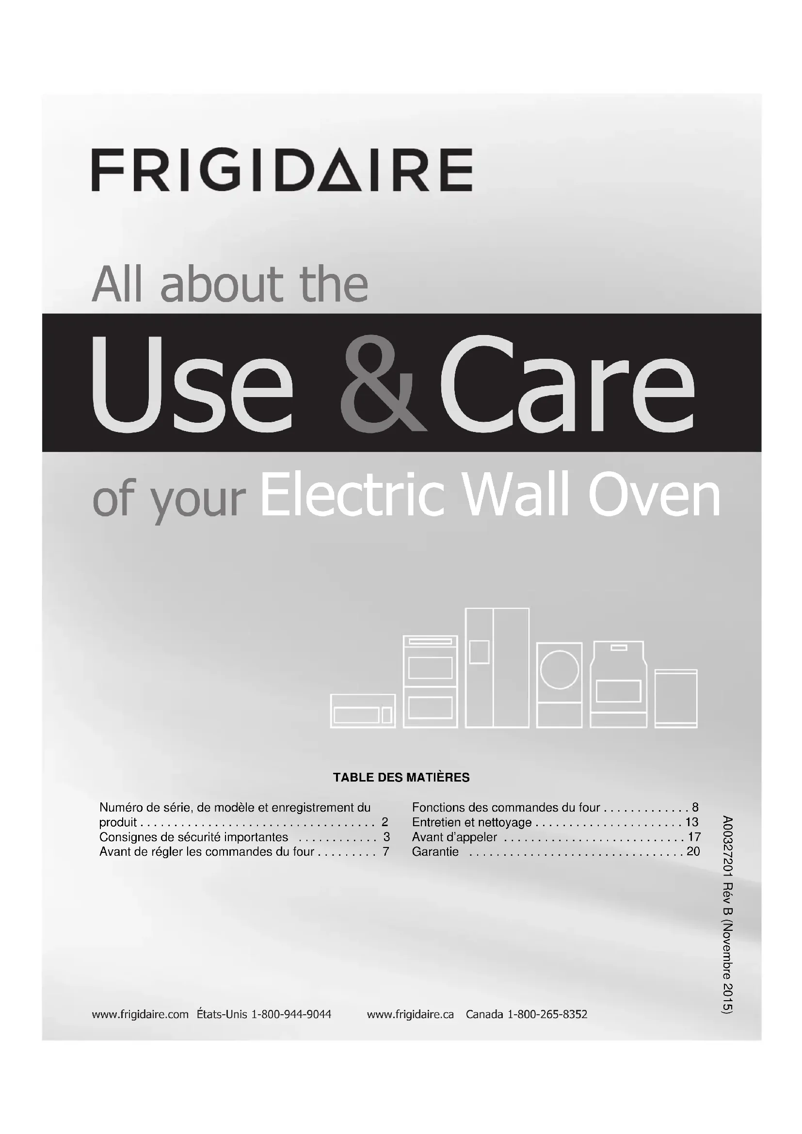 - Garantie Besoin d’aide? Visitez le site Web de Frigidaire à l’adresse www.frigidaire.com Avant de contacter le service à la clientèle, il vous est possible d’effectuer un certain nombre de choses qui pourront nous aider à mieux vous servir. Lisez ce manuel d’utilisation et d’entretien. Il contient des instructions qui vous permettent d’utiliser et d’entretenir correctement votre cuisinière. Si vous avez reçu une cuisinière endommagée Communiquez immédiatement avec le détaillant (ou le fabricant) qui vous a vendu la cuisinière. Économisez temps et argent. Reportez-vous à la section « Avant d’appeler » à la page 17. Les renseignements contenus dans cette section vous aideront à résoudre les problèmes qui pourraient survenir. Si une réparation est requise, il suffit d’un appel téléphonique pour l’obtenir. Appelez le service à la clientèle Frigidaire au 1-800-944-9044. Enregistrement du produit L’enregistrement de votre produit nous permet de mieux vous servir. Enregistrez votre produit en ligne sur http://www.frigidaire.com ou en nous envoyant la carte d’enregistrement du produit par la poste. Inscrivez les numéros de modèle et de série dans l’espace ci-dessous Date d’achat Numéro de modèle Frigidaire Numéro de série Frigidaire Emplacement du numéro de série Emplacement du numéro de série : ouvrez la porte du four et regardez sur le côté gauche du cadre de la cuisinière NUMÉRO DE SÉRIE, DE MODÈLE ET ENREGISTREMENT DU PRODUIT Des questions? Pour joindre sans frais le service de soutien technique aux États-Unis et au Canada, téléphonez au 1-800-944-9044. Pour obtenir de l’aide et des renseignements en ligne sur les produits, rendez-vous à l’adresse http://www.frigidaire.com. Merci d’avoir choisi Frigidaire. Important : ce guide d’utilisation et d’entretien fait partie de notre engagement à vous satisfaire et à vous fournir un produit de qualité pendant toute la durée de vie de votre nouvel appareil. Nous considérons votre achat comme le début d’une relation. Pour vous assurer que nous pourrons continuer à vous servir, veuillez inscrire sur cette page les renseignements importants concernant ce produit.3 Conservez ces instructions pour une future utilisation.MISES EN GARDE ET AVERTISSEMENTSLisez toutes les instructions avant d’utiliser cet appareil.Ce guide contient des instructions et des symboles importants concernant la sécurité. Veuillez porter une attention particulière à ces symboles et respecter toutes les directives.Ne tentez pas d’installer ou d’utiliser votre appareil avant d’avoir lu les mesures de sécurité contenues dans ce manuel. Ces mesures de sécurité sont identifiées par le mot AVERTISSEMENT ou MISE EN GARDE selon le type de risque.DÉFINITIONS Voici le symbole d’avertissement concernant la sécurité. Il sert à vous mettre en garde contre les risques potentiels de blessures corporelles. Respectez toutes les mesures de sécurité qui accompagnent ce symbole afin de prévenir les blessures voire la mort.Indique une situation potentiellement dangereuse qui, si elle n’est pas évitée, pourrait entraîner des blessures graves, voire la mort.Indique une situation potentiellement dangereuse qui, si elle n’est pas évitée, pourrait causer des blessures mineures ou modérées.Fournit des renseignements sur l’installation, le fonctionnement, l’entretien ou tout autre renseignement important qui n’implique aucun danger.Indique une courte référence informelle qui sert à rafraîchir la mémoire ou pour une utilisation ultérieure. AVERTISSEMENT ATTENTION IMPORTANT NOTE Rangement à l’intérieur de l’appareil ou sur l’appareil : les articles inflammables ne doivent pas être rangés dans le four ou près des brûleurs de surface. Cela inclut les articles en papier, en plastique et en tissu comme les livres de cuisine, les ustensiles en plastique et les chiffons, ainsi que tout liquide inflammable. Ne rangez pas de produits explosifs comme des bombes aérosol sur le four ou à proximité de celui-ci. AVERTISSEMENT p. 20
