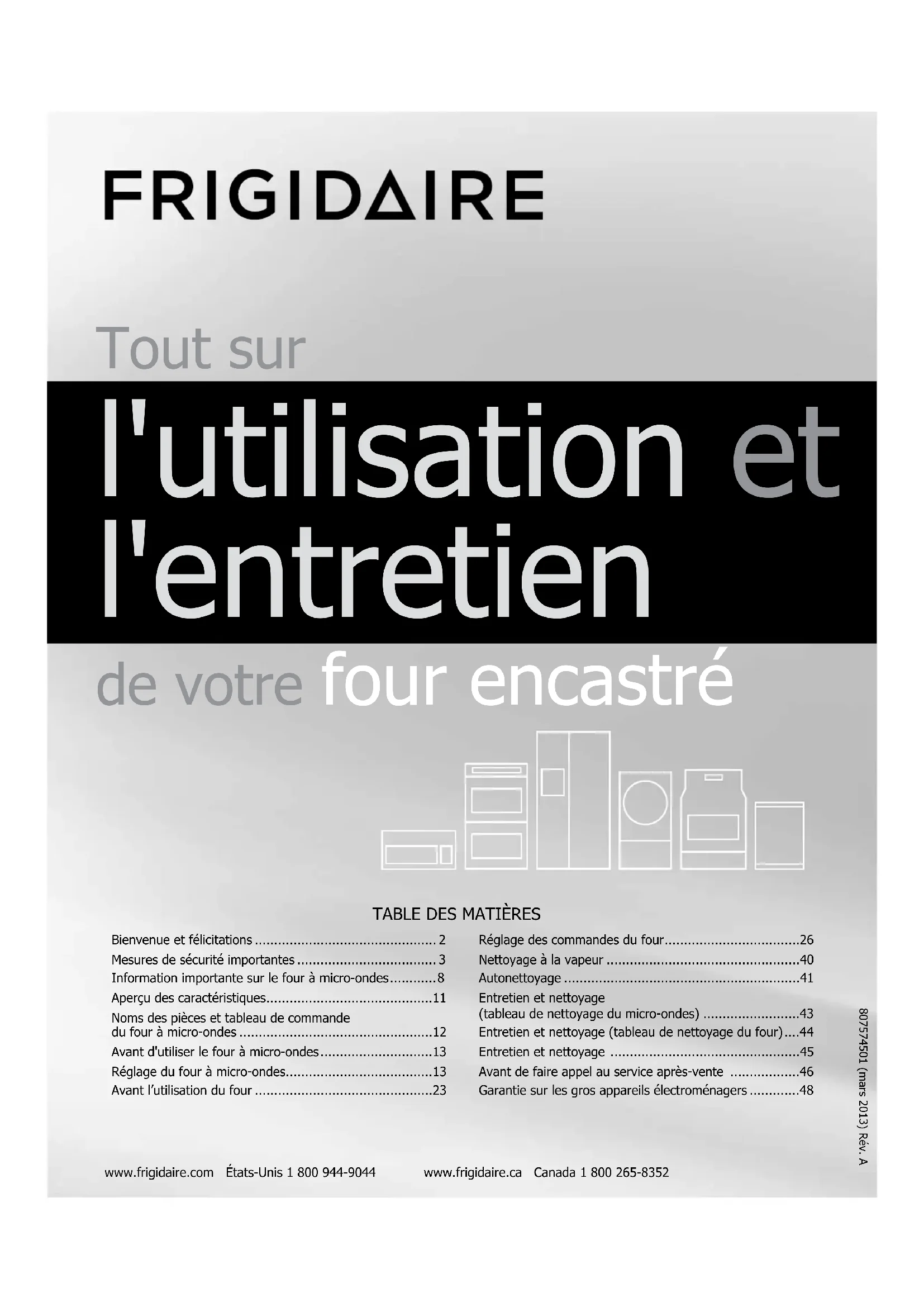 - www.frigidaire.com États-Unis 1 800 944-9044 www.frigidaire.ca Canada 1 800 265-8352 Tout sur l'utilisation et l'entretien de votre four encastré 807574501 (mars 2013) Rév. A Bienvenue et félicitations p. 2