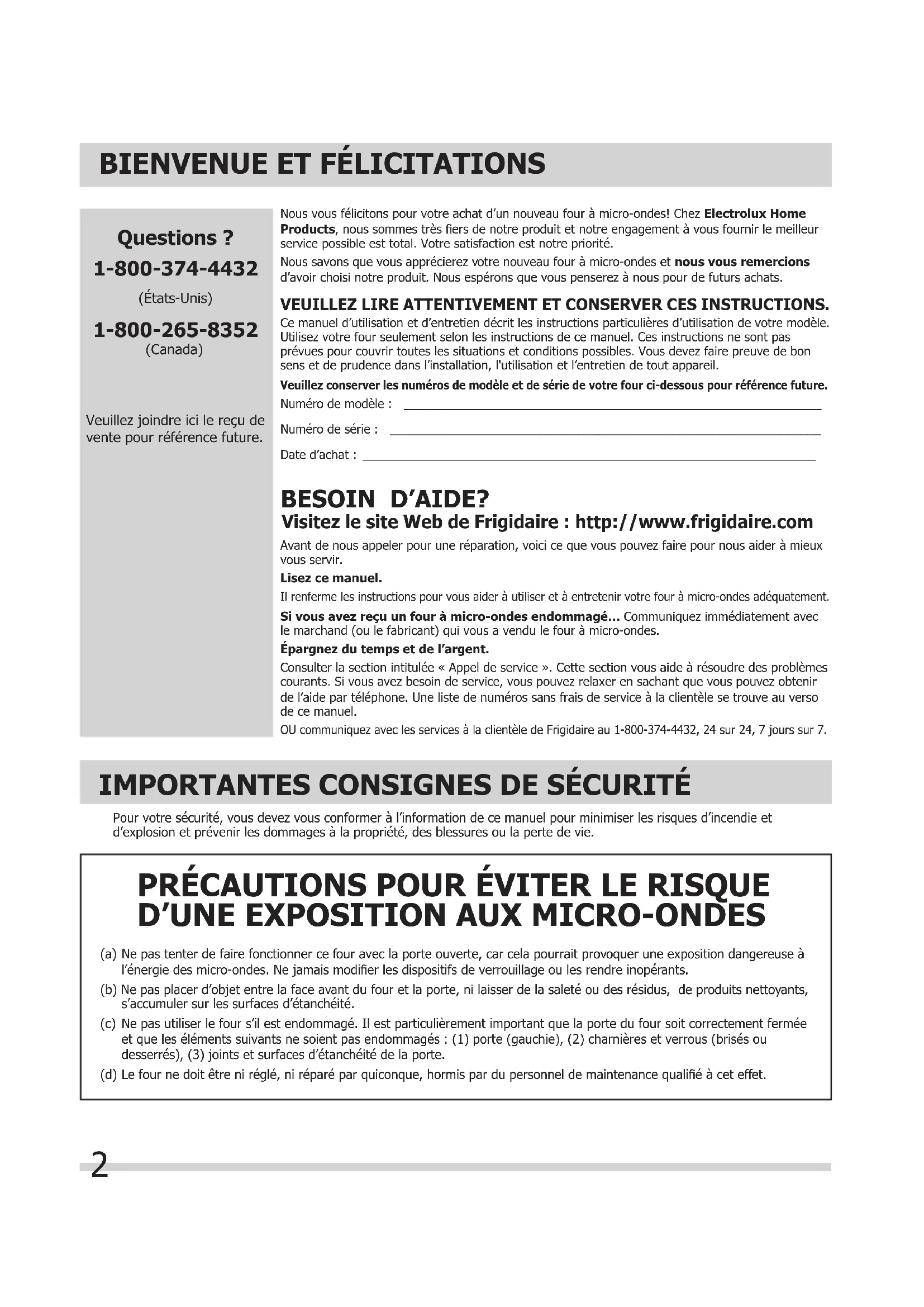 Avant de nous appeler pour une réparation, voici ce que vous pouvez faire pour nous aider à mieux vous servir.Lisez ce manuel.Il renferme les instructions pour vous aider à utiliser et à entretenir votre four à micro-ondes adéquatement.Si vous avez reçu un four à micro-ondes endommagé… Communiquez immédiatement avec le marchand (ou le fabricant) qui vous a vendu le four à micro-ondes.Épargnez du temps et de l’argent.Consulter la section intitulée « Appel de service ». Cette section vous aide à résoudre des problèmes courants. Si vous avez besoin de service, vous pouvez relaxer en sachant que vous pouvez obtenir de l’aide par téléphone. Une liste de numéros sans frais de service à la clientèle se trouve au verso de ce manuel.OU communiquez avec les services à la clientèle de Frigidaire au 1-800-374-4432, 24 sur 24, 7 jours sur 7. BESOIN D’AIDE? Visitez le site Web de Frigidaire : http://www.frigidaire.com Nous vous félicitons pour votre achat d’un nouveau four à micro-ondes! Chez Electrolux Home Products, nous sommes très fi ers de notre produit et notre engagement à vous fournir le meilleur service possible est total. Votre satisfaction est notre priorité. Nous savons que vous apprécierez votre nouveau four à micro-ondes et nous vous remercions d’avoir choisi notre produit. Nous espérons que vous penserez à nous pour de futurs achats.VEUILLEZ LIRE ATTENTIVEMENT ET CONSERVER CES INSTRUCTIONS.Ce manuel d’utilisation et d’entretien décrit les instructions particulières d’utilisation de votre modèle. Utilisez votre four seulement selon les instructions de ce manuel. Ces instructions ne sont pas prévues pour couvrir toutes les situations et conditions possibles. Vous devez faire preuve de bon sens et de prudence dans l’installation, l'utilisation et l’entretien de tout appareil. Veuillez conserver les numéros de modèle et de série de votre four ci-dessous pour référence future.Numéro de modèle : ______________________________________________________________Numéro de série : ________________________________________________________________Date d’achat : _________________________________________________________________ OR7NEWModelFR-4.inddFr2OR7NEWModelFR-4.inddFr2 09.4.2811:59:39AM09.4.2811:59:39AM 1-800-374-44323