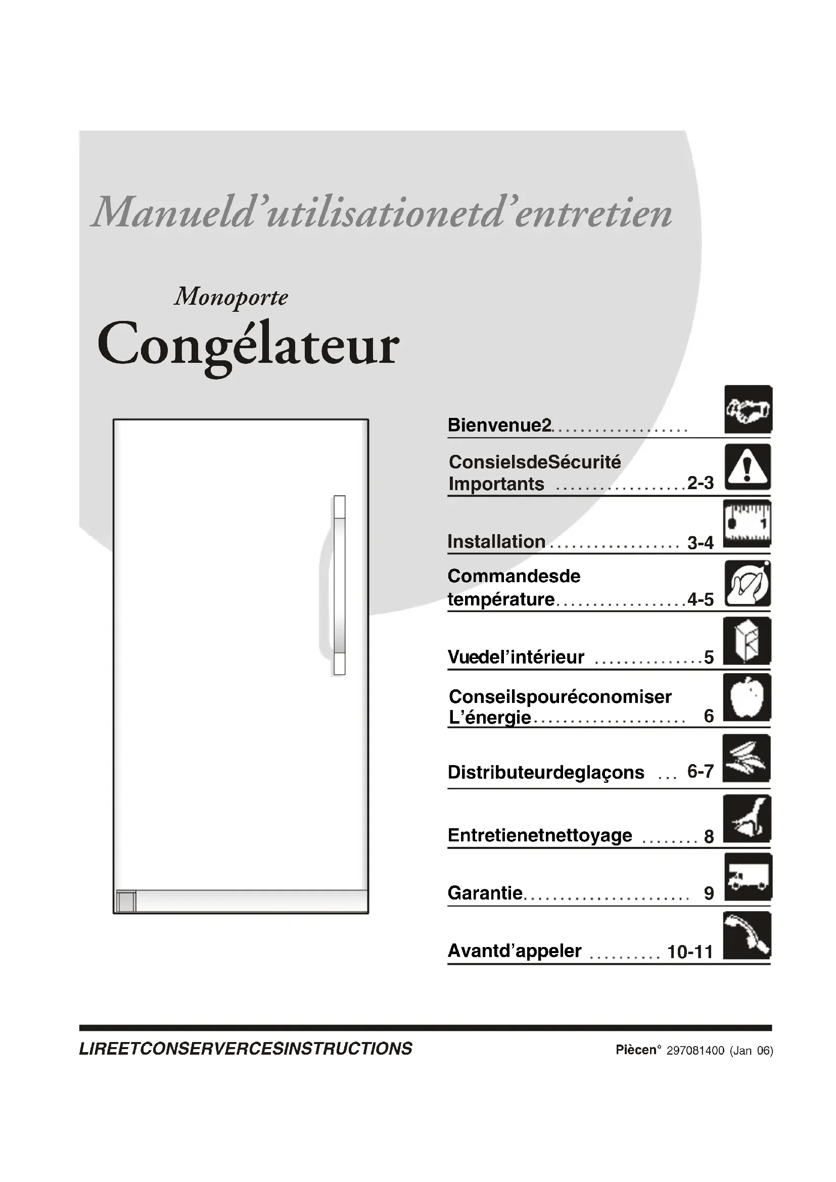 LIRE ET CONSER VER CES INSTR UCTIONS Manuel d ’utilisation et d ’entretien Congélateur Monoporte Pièce n° 297055200 (0508) Bienvenue 2 2-3 3-4 4-5