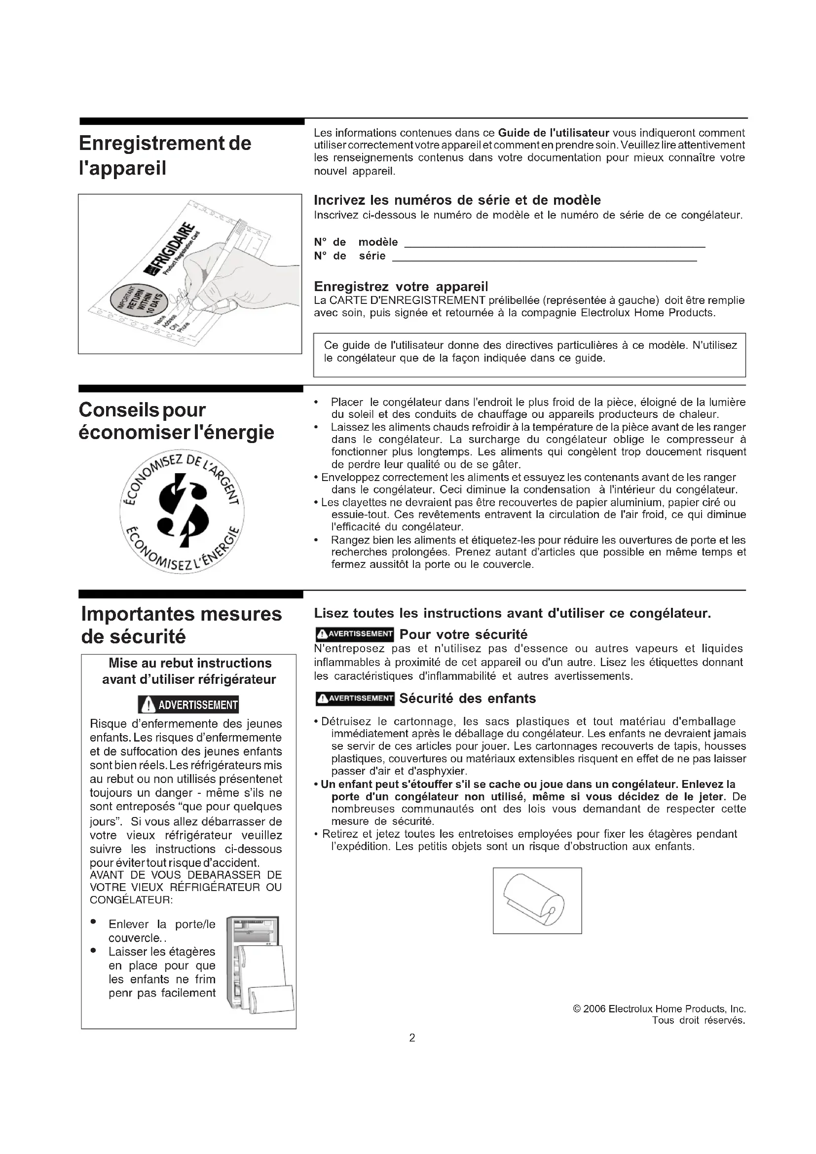Enregistrement de l'appareil © 2006 Electrolux Home Products, Inc. Tous droit réservés. Les informations contenues dans ce Guide de l'utilisateur vous indiqueront comment utiliser correctement votre appareil et comment en prendre soin. Veuillez lire attentivement les renseignements contenus dans votre documentation pour mieux connaître votre nouvel appareil. Incrivez les numéros de série et de modèle Inscrivez ci-dessous le numéro de modèle et le numéro de série de ce congélateur. N° de modèle ________________________________________________ N° de série ________________________________________________ Enregistrez votre appareil La CARTE D'ENREGISTREMENT prélibellée (représentée à gauche) doit être remplie avec soin, puis signée et retournée à la compagnie Electrolux Home Products. Conseils pour économiser l'énergie
