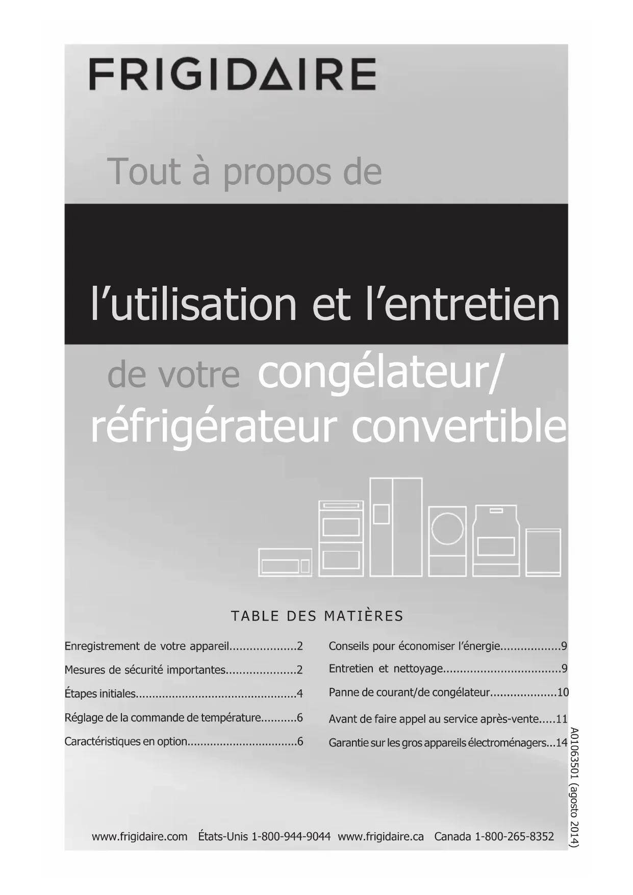 - www.frigidaire.com États-Unis 1-800-944-9044 www.frigidaire.ca Canada 1-800-265-8352 Tout à propos de l’utilisation et l’entretien de votre congélateur/ réfrigérateur convertible Enregistrement de votre appareil p. 2
