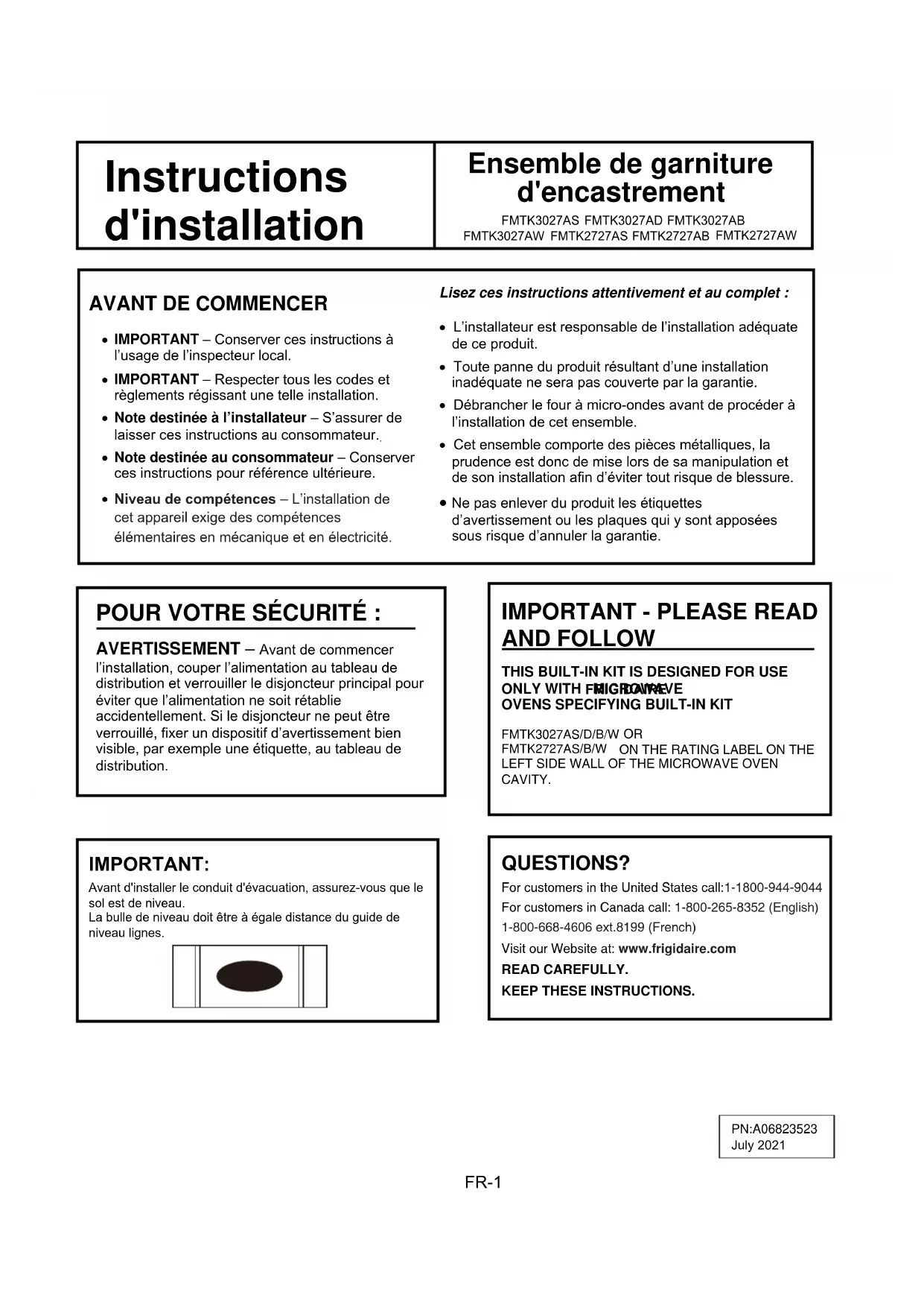 Front Frame Assembly Bottom Mounting Rail Exhaust Duct Illustration 1 17 po (432 mm) 1/4 po (438 mm) 3/4 po (629 mm) 25 po (635 mm) 20 po (508 mm) Vis AVis B Peut être intégré dans une structure du Cabinet, mais de cuisson, ou au four pas pour une utilisation à côté (dans les 2 pieds ) d ' une cuisinière au gaz ou électrique, table FR-2 d’au moins 7,6 cm (3 po) entre la paroi du four et le four à 27po 18 1/8 (460 mm)26 15/16 (684 mm) 1 9/16 (40 mm)18 1/8 (460 mm)29 15/16 (759 mm)1 9/16 (40 mm) 30po Dimensions Ensemble de garniture ensembleHauteurLargeur Profondeur Illustration 2 3"Min (3.9X8.0 mm) (4.0X20 mm) Numéro de modèle Couleur La description FMBS2227AB Noire Four micro onde SS Kit de garniture 30'' Noir SS Kit de garniture 30'' Noire Kit de garniture 30'' Blanche Kit de garniture 30'' SS Kit de garniture 27'' Noire Kit de garniture 27'' Blanche Kit de garniture 27'' FMTK3027AS FMTK3027AD FMTK3027AB FMTK3027AW FMTK2727AS FMTK2727AB FMTK2727AWVis A Instructions d'installation