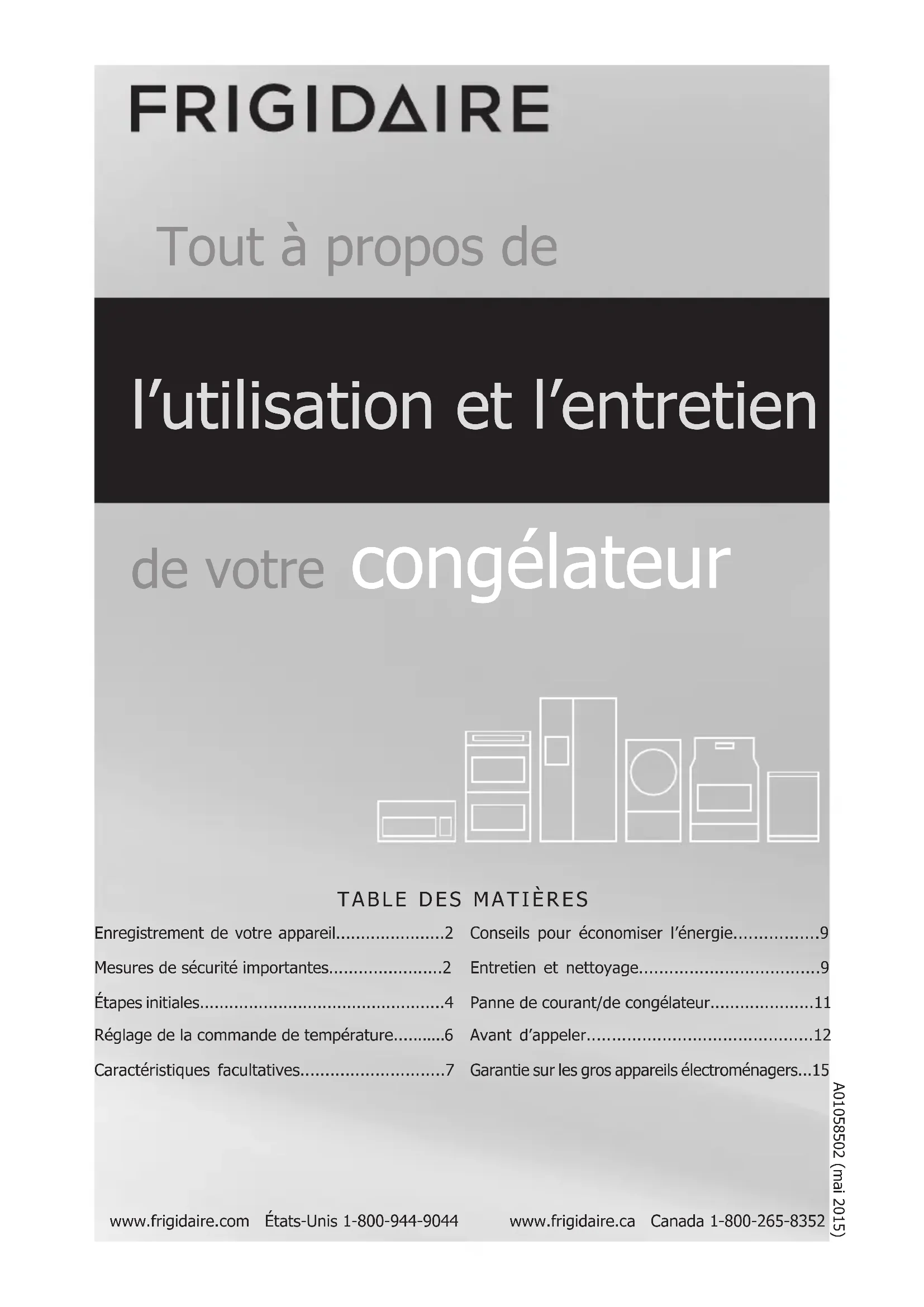 - www.frigidaire.com États-Unis 1-800-944-9044 www.frigidaire.ca Canada 1-800-265-8352 Tout à propos de l’utilisation et l’entretien de votre congélateur Enregistrement de votre appareil p. 2