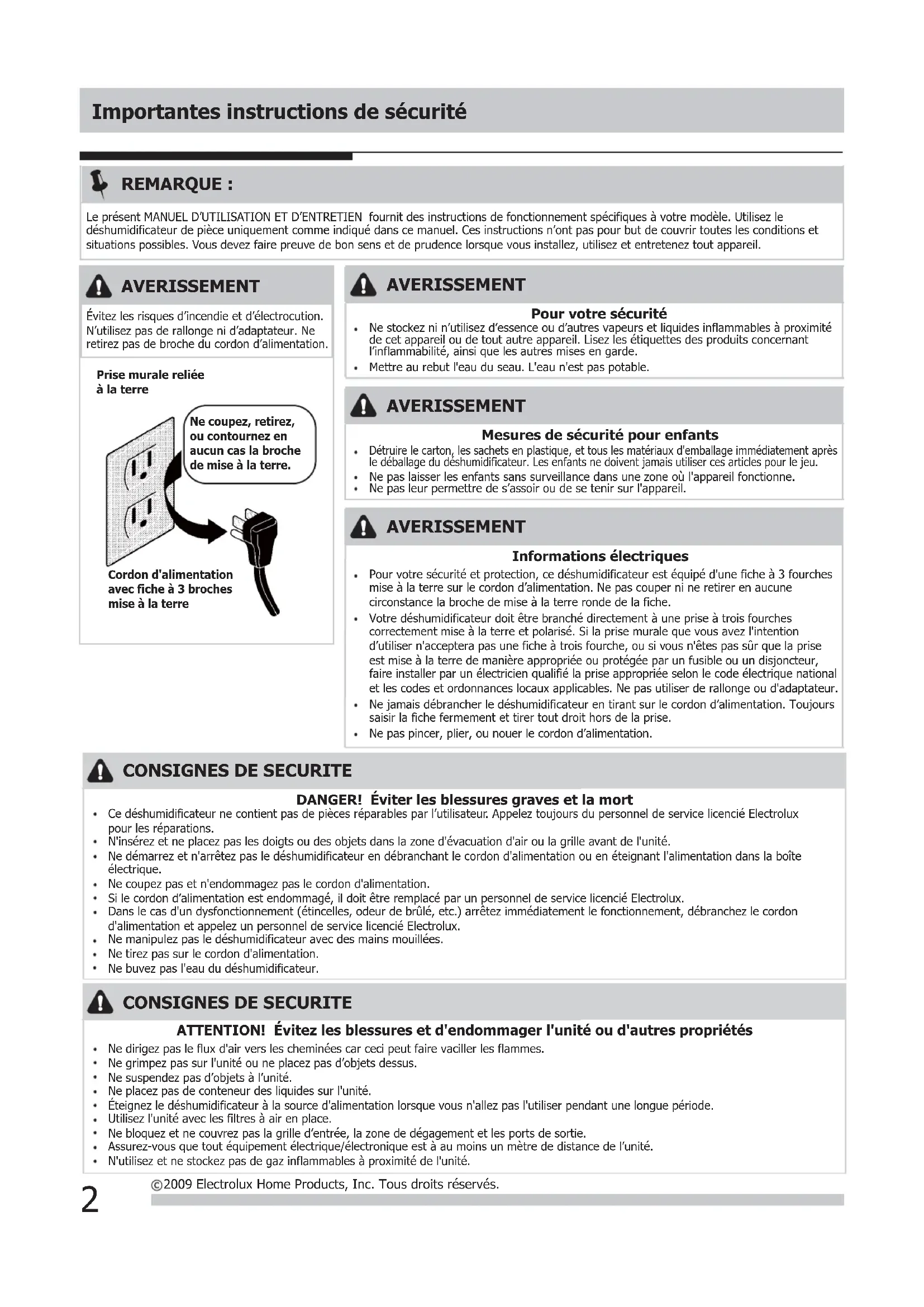 2009 Electrolux Home Products, Inc. Tous droits réservés. AVERISSEMENT Mesures de sécurité pour enfants Détruire le carton, les sachets en plastique, et tous les matériaux d'emballage immédiatement après le déballage du déshumidificateur. Les enfants ne doivent jamais utiliser ces articles pour le jeu.Ne pas laisser les enfants sans surveillance dans une zone où l'appareil fonctionne.Ne pas leur permettre de s’assoir ou de se tenir sur l'appareil.Cordon d'alimentation avec fiche à 3 broches mise à la terrePrise murale reliée à la terreNe coupez, retirez, ou contournez en aucun cas la broche de mise à la terre. AVERISSEMENT Évitez les risques d’incendie et d’électrocution. N’utilisez pas de rallonge ni d’adaptateur. Ne retirez pas de broche du cordon d’alimentation.Pour votre sécurité et protection, ce déshumidificateur est équipé d'une fiche à 3 fourchesmise à la terre sur le cordon d’alimentation. Ne pas couper ni ne retirer en aucune circonstance la broche de mise à la terre ronde de la fiche.Votre déshumidificateur doit être branché directement à une prise à trois fourchescorrectement mise à la terre et polarisé. Si la prise murale que vous avez l'intention d’utiliser n'acceptera pas une fiche à trois fourche, ou si vous n'êtes pas sûr que la prise est mise à la terre de manière appropriée ou protégée par un fusible ou un disjoncteur,faire installer par un électricien qualifié la prise appropriée selon le code électrique national et les codes et ordonnances locaux applicables. Ne pas utiliser de rallonge ou d'adaptateur.Ne jamais débrancher le déshumidificateur en tirant sur le cordon d’alimentation. Toujourssaisir la fiche fermement et tirer tout droit hors de la prise. AVERISSEMENT Informations électriques Ne pas pincer, plier, ou nouer le cordon d’alimentation. AVERISSEMENT Pour votre sécurité Ne stockez ni n’utilisez d’essence ou d’autres vapeurs et liquides inflammables à proximitéde cet appareil ou de tout autre appareil. Lisez les étiquettes des produits concernant l’inflammabilité, ainsi que les autres mises en garde.Mettre au rebut l'eau du seau. L'eau n'est pas potable. REMARQUE : Le présent MANUEL D’UTILISATION ET D’ENTRETIEN fournit des instructions de fonctionnement spécifiques à votre modèle. Utilisez le déshumidificateur de pièce uniquement comme indiqué dans ce manuel. Ces instructions n’ont pas pour but de couvrir toutes les conditions et situations possibles. Vous devez faire preuve de bon sens et de prudence lorsque vous installez, utilisez et entretenez tout appareil.1. Le déshumidificateur doit être utilisé dans une zone fermée pour être le plus efficace. Fermez toutes les portes, fenêtres, et autres ouvertures extérieures à la pièce. L'efficacité du déshumidificateur dépend du taux auquel le nouvel air chargé d’humidité entre dans la pièce.