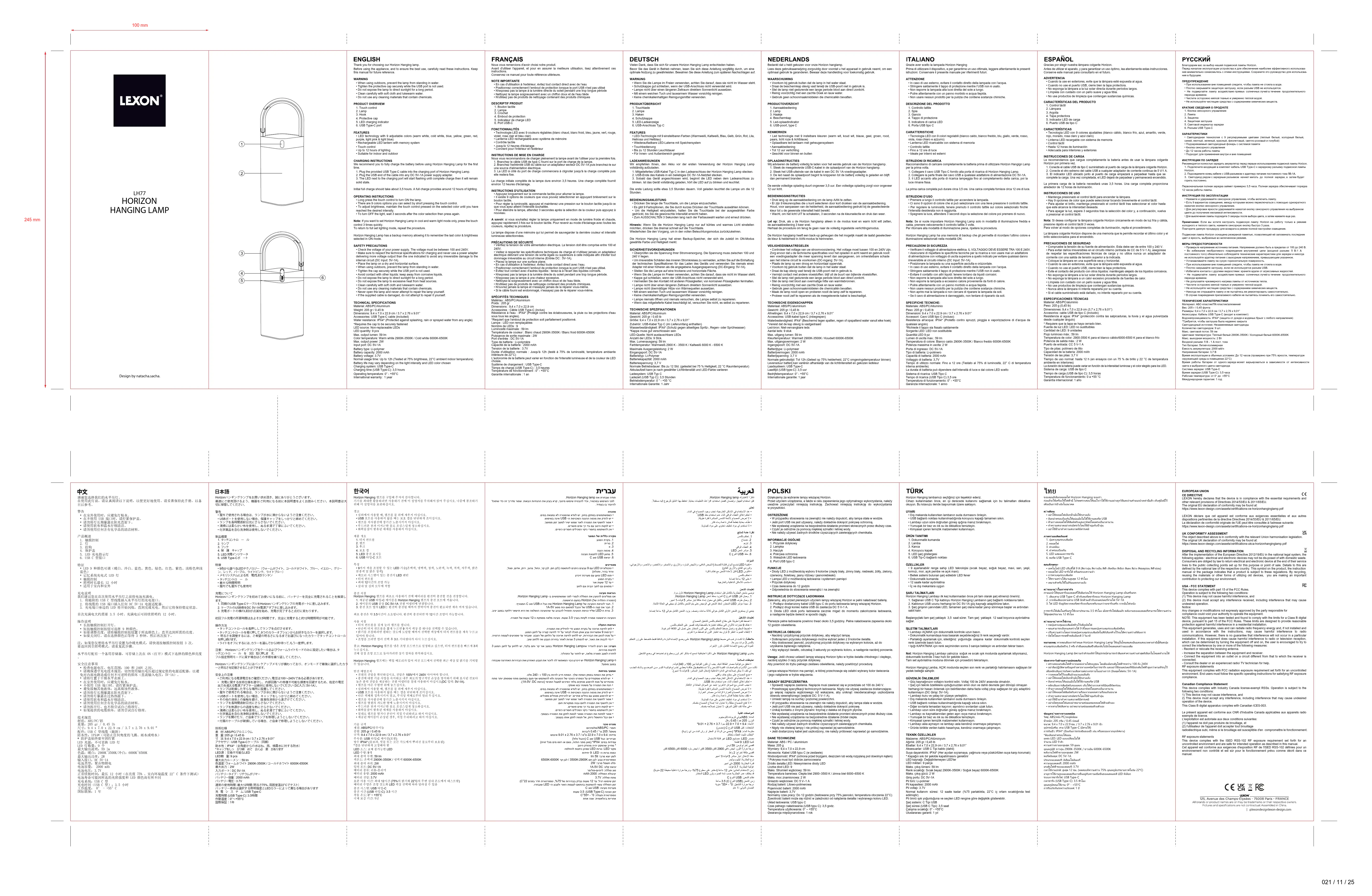 Design by natacha.sacha. 100 mm 245 mm 021 / 11 / 25 @lexondesignlexon-design.com HORIZON HANGING LAMP LH77 Thank you for choosing our Horizon Hanging lamp. Before using the appliance, and to ensure the best use, carefully read these instructions. Keep this manual for future reference.WARNING• When using outdoors, prevent the lamp from standing in water. • Tighten the protective cap securely while the USB port is not used.• Do not expose the lamp to direct sunlight for a long period. • Clean carefully with soft cloth and lukewarm water.• Do not use any cleaning materials that contain chemicals. PRODUCT OVERVIEW1. Touch control2. Lamp3. Hook4. Protective cap5. LED charging indicator6. USB Type-C portFEATURES• LED technology with 9 adjustable colors (warm white, cold white, blue, yellow, green, red, purple, light pink & light blue)• Rechargeable LED lantern with memory system• Touch control• Up to 12 hours of lighting• Suitable for indoor and outdoor CHARGING INSTRUCTIONSWe recommend you to fully charge the battery before using Horizon Hanging Lamp for the first time.1. Plug the provided USB Type-C cable into the charging port of Horizon Hanging Lamp.2. Plug the USB end of the cable into any DC 5V-1A power supply adapter.3. The LED next to the charging port will start flashing until complete charge then it will remain solid state.Initial full charge should take about 3,5 hours. A full charge provides around 12 hours of lighting.OPERATING INSTRUCTIONS• Long press the touch control to turn ON the lamp.• There are 9 colors options you can select by short pressing the touch control.• To adjust brightness, maintain the touch control pressed on the selected color until you have reached the desired intensity.• To turn OFF the light, wait 3 seconds after the color selection then press again. Note: If you want to set Horizon Hanging Lamp in cool and warm light mode only, press the touch control 3 times quickly. To return to full set lighting mode, repeat the procedure.Horizon Hanging Lamp has a backup memory allowing it to remember the last color & brightness selected in ON mode.SAFETY PRECAUTIONS• Check the voltage of your power supply. The voltage must be between 100 and 240V. • Make sure to respect the technical specifications for charging and never use a power adapter delivering more voltage output than the one indicated to avoid any irreversible damage to the internal circuit (DC Input: 5V-1A).• Place the lamp on a dry and horizontal surface. • When using outdoors, prevent the lamp from standing in water. • Tighten the cap securely while the USB port is not used.• Avoid contact with other liquids: keep away from corrosive liquids.• Do not expose the lamp to direct sunlight for a long period. • Do not expose the lamp to excessive heat from heat sources. • Clean carefully with soft cloth and lukewarm water.• Do not use any cleaning materials that contain chemicals. • Never open the lamp and never attempt to repair the lamp yourself. • If the supplied cable is damaged, do not attempt to repair it yourself. TECHNICAL SPECIFICATIONSMaterial: ABS/PC/AluminumWeight: 205 gr / 0.45 lbDimensions: 9.4 x 7.0 x 22.9 cm / 3.7 x 2.76 x 9.01“ Accessories: USB Type-C cable (included)Water resistance: IPX4* (Protected against splashing, rain or sprayed water from any angle)*Requires the cap to be securely fastenedLED source: Non-replaceable LEDsLED quantity: 9 pcsMax. output lumen: 59 lmColor temperature: Warm white 2900K-3500K / Cold white 6000K-6500KMax. output power: 2WInput port: DC 5V-1ABattery type: Li-polymerBattery capacity: 2000 mAhBattery voltage: 3.7VNormal usage time: Up to 12h (Tested at 75% brightness, 22°C ambient indoor temperature)Battery life may vary depending on the light intensity and LED color chosenCharging system: USB Type-CCharging time (USB Type-C): 3,5 hours Operating temperature: 0° - +55°CInternational warranty: 1 year Nous vous remercions d'avoir choisi notre produit. Avant d'utiliser l'appareil, et pour en assurer la meilleure utilisation, lisez attentivement ces instructions. Conservez ce manuel pour toute référence ultérieure.NOTE IMPORTANTE• En cas d'utilisation à l'extérieur, évitez tout contact direct avec de l’eau • Positionnez correctement l’embout de protection lorsque le port USB n'est pas utilisé• N'exposez pas la lampe à la lumière directe du soleil pendant une trop longue période• Nettoyez la lampe soigneusement avec un chiffon doux et de l'eau tiède• N'utilisez pas de produits de nettoyage contenant des produits chimiques DESCRIPTIF PRODUIT1. Bouton tactile2. Lampe3. Crochet4. Embout de protection5. Indicateur de charge LED6. Port USB-CFONCTIONNALITÉS• Technologie LED avec 9 couleurs réglables (blanc chaud, blanc froid, bleu, jaune, vert, rouge, violet, rose clair et bleu clair)• Lanterne LED rechargeable avec système de mémoire• Contrôle tactile• Jusqu'à 12 heures d'éclairage• Convient pour l'intérieur et l'extérieurINSTRUCTIONS DE MISE EN CHARGENous vous recommandons de charger pleinement la lampe avant de l’utiliser pour la première fois.1. Branchez le câble USB de type C fourni sur le port de charge de la lampe.2. Branchez l'extrémité USB du câble sur un adaptateur secteur DC 5V-1A puis branchez-le sur une source d'alimentation électrique.3. La LED à côté du port de charge commencera à clignoter jusqu'à la charge complète puis elle restera fixe.La charge initiale complète de la lampe dure environ 3,5 heures. Une charge complète fournit environ 12 heures d'éclairage.INSTRUCTIONS D'UTILISATION• Appuyez longuement sur la commande tactile pour allumer la lampe.• Il existe 9 options de couleurs que vous pouvez sélectionner en appuyant brièvement sur le bouton tactile.• Pour régler la luminosité, appuyez et maintenez une pression sur le bouton tactile jusqu'à ce que vous ayez atteint l'intensité souhaitée.• Pour éteindre la lampe, attende