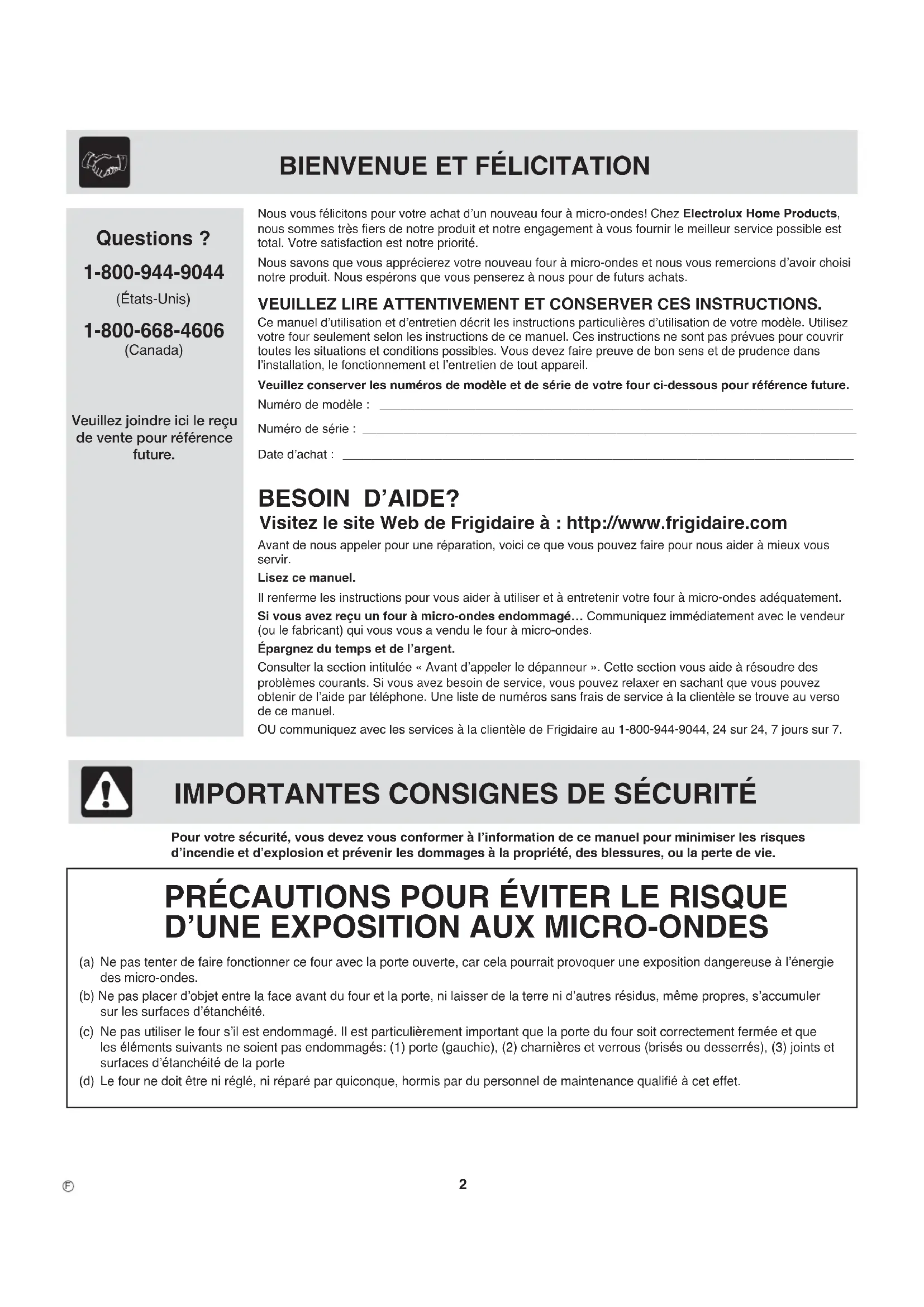 Avant de nous appeler pour une réparation, voici ce que vous pouvez faire pour nous aider à mieux vous servir.Lisez ce manuel.Il renferme les instructions pour vous aider à utiliser et à entretenir votre four à micro-ondes adéquatement.Si vous avez reçu un four à micro-ondes endommagé… Communiquez immédiatement avec le vendeur (ou le fabricant) qui vous vous a vendu le four à micro-ondes.Épargnez du temps et de l’argent.Consulter la section intitulée « Avant d’appeler le dépanneur ». Cette section vous aide à résoudre des problèmes courants. Si vous avez besoin de service, vous pouvez relaxer en sachant que vous pouvez obtenir de l’aide par téléphone. Une liste de numéros sans frais de service à la clientèle se trouve au verso de ce manuel.OU communiquez avec les services à la clientèle de Frigidaire au 1-800-944-9044, 24 sur 24, 7 jours sur 7. BESOIN D’AIDE? Visitez le site Web de Frigidaire à : http://www.frigidaire.com Nous vous félicitons pour votre achat d’un nouveau four à micro-ondes! Chez Electrolux Home Products, nous sommes très fi ers de notre produit et notre engagement à vous fournir le meilleur service possible est total. Votre satisfaction est notre priorité.Nous savons que vous apprécierez votre nouveau four à micro-ondes et nous vous remercions d’avoir choisi notre produit. Nous espérons que vous penserez à nous pour de futurs achats.VEUILLEZ LIRE ATTENTIVEMENT ET CONSERVER CES INSTRUCTIONS.Ce manuel d’utilisation et d’entretien décrit les instructions particulières d’utilisation de votre modèle. Utilisez votre four seulement selon les instructions de ce manuel. Ces instructions ne sont pas prévues pour couvrir toutes les situations et conditions possibles. Vous devez faire preuve de bon sens et de prudence dans l’installation, le fonctionnement et l’entretien de tout appareil. Veuillez conserver les numéros de modèle et de série de votre four ci-dessous pour référence future.Numéro de modèle : _____________________________________________________________________Numéro de série : ________________________________________________________________________Date d’achat : ________________________________________________________________________