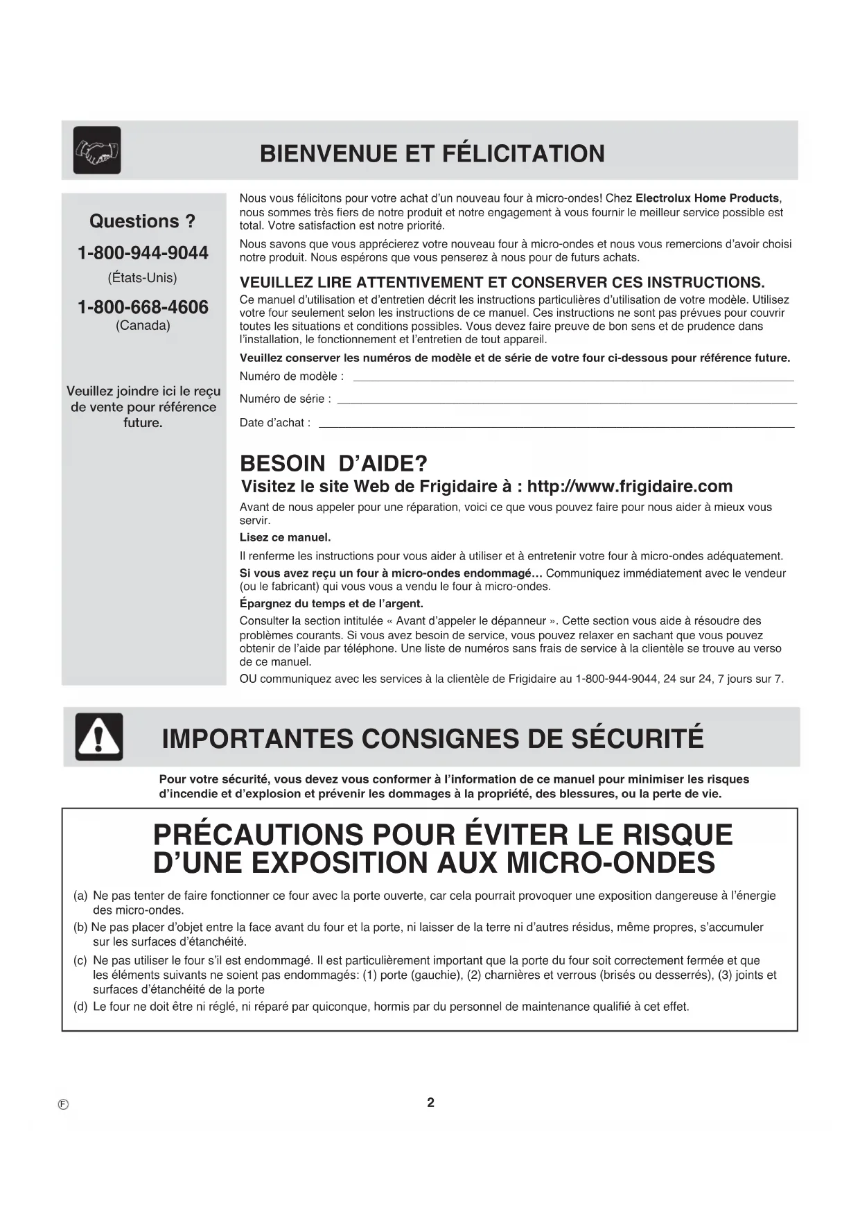 Avant de nous appeler pour une réparation, voici ce que vous pouvez faire pour nous aider à mieux vous servir.Lisez ce manuel.Il renferme les instructions pour vous aider à utiliser et à entretenir votre four à micro-ondes adéquatement.Si vous avez reçu un four à micro-ondes endommagé… Communiquez immédiatement avec le vendeur (ou le fabricant) qui vous vous a vendu le four à micro-ondes.Épargnez du temps et de l’argent.Consulter la section intitulée « Avant d’appeler le dépanneur ». Cette section vous aide à résoudre des problèmes courants. Si vous avez besoin de service, vous pouvez relaxer en sachant que vous pouvez obtenir de l’aide par téléphone. Une liste de numéros sans frais de service à la clientèle se trouve au verso de ce manuel.OU communiquez avec les services à la clientèle de Frigidaire au 1-800-944-9044, 24 sur 24, 7 jours sur 7. BESOIN D’AIDE? Visitez le site Web de Frigidaire à : http://www.frigidaire.com Nous vous félicitons pour votre achat d’un nouveau four à micro-ondes! Chez Electrolux Home Products, nous sommes très fi ers de notre produit et notre engagement à vous fournir le meilleur service possible est total. Votre satisfaction est notre priorité.Nous savons que vous apprécierez votre nouveau four à micro-ondes et nous vous remercions d’avoir choisi notre produit. Nous espérons que vous penserez à nous pour de futurs achats.VEUILLEZ LIRE ATTENTIVEMENT ET CONSERVER CES INSTRUCTIONS.Ce manuel d’utilisation et d’entretien décrit les instructions particulières d’utilisation de votre modèle. Utilisez votre four seulement selon les instructions de ce manuel. Ces instructions ne sont pas prévues pour couvrir toutes les situations et conditions possibles. Vous devez faire preuve de bon sens et de prudence dans l’installation, le fonctionnement et l’entretien de tout appareil. Veuillez conserver les numéros de modèle et de série de votre four ci-dessous pour référence future.Numéro de modèle : _____________________________________________________________________Numéro de série : ________________________________________________________________________Date d’achat : ________________________________________________________________________