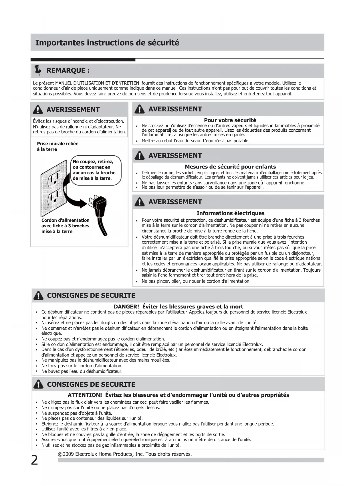 2009 Electrolux Home Products, Inc. Tous droits réservés. REMARQUE : Le présent MANUEL D’UTILISATION ET D’ENTRETIEN fournit des instructions de fonctionnement spécifiques à votre modèle. Utilisez le conditionneur d’air de pièce uniquement comme indiqué dans ce manuel. Ces instructions n’ont pas pour but de couvrir toutes les conditions et situations possibles. Vous devez faire preuve de bon sens et de prudence lorsque vous installez, utilisez et entretenez tout appareil. AVERISSEMENT Mesures de sécurité pour enfants Détruire le carton, les sachets en plastique, et tous les matériaux d'emballage immédiatement après le déballage du déshumidificateur. Les enfants ne doivent jamais utiliser ces articles pour le jeu.Ne pas laisser les enfants sans surveillance dans une zone où l'appareil fonctionne.Ne pas leur permettre de s’assoir ou de se tenir sur l'appareil.Cordon d'alimentation avec fiche à 3 broches mise à la terrePrise murale reliée à la terreNe coupez, retirez, ou contournez en aucun cas la broche de mise à la terre. AVERISSEMENT Évitez les risques d’incendie et d’électrocution. N’utilisez pas de rallonge ni d’adaptateur. Ne retirez pas de broche du cordon d’alimentation.Pour votre sécurité et protection, ce déshumidificateur est équipé d'une fiche à 3 fourchesmise à la terre sur le cordon d’alimentation. Ne pas couper ni ne retirer en aucune circonstance la broche de mise à la terre ronde de la fiche.Votre déshumidificateur doit être branché directement à une prise à trois fourchescorrectement mise à la terre et polarisé. Si la prise murale que vous avez l'intention d’utiliser n'acceptera pas une fiche à trois fourche, ou si vous n'êtes pas sûr que la prise est mise à la terre de manière appropriée ou protégée par un fusible ou un disjoncteur,faire installer par un électricien qualifié la prise appropriée selon le code électrique national et les codes et ordonnances locaux applicables. Ne pas utiliser de rallonge ou d'adaptateur.Ne jamais débrancher le déshumidificateur en tirant sur le cordon d’alimentation. Toujourssaisir la fiche fermement et tirer tout droit hors de la prise. AVERISSEMENT Informations électriques Ne pas pincer, plier, ou nouer le cordon d’alimentation. AVERISSEMENT Pour votre sécurité Ne stockez ni n’utilisez d’essence ou d’autres vapeurs et liquides inflammables à proximitéde cet appareil ou de tout autre appareil. Lisez les étiquettes des produits concernant l’inflammabilité, ainsi que les autres mises en garde.Mettre au rebut l'eau du seau. L'eau n'est pas potable.1. Le déshumidificateur doit être utilisé dans une zone fermée pour être le plus efficace. Fermez toutes les portes, fenêtres, et autres ouvertures extérieures à la pièce. L'efficacité du déshumidificateur dépend du taux auquel le nouvel air chargé d’humidité entre dans la pièce.