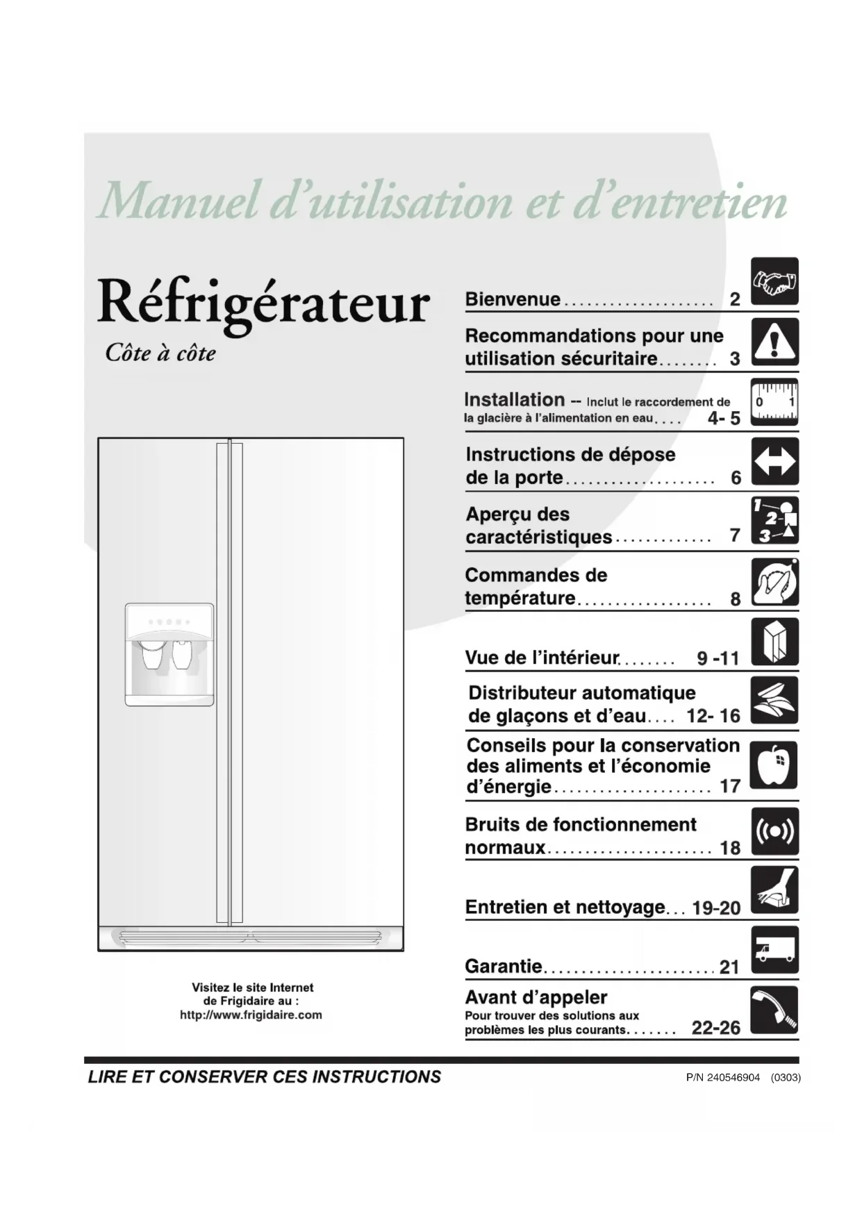 P/N 240546904 (0303)2 Bienvenue et félicitations Félicitations pour l’achat de votre nouveau réfrigérateur! Nous, de Electrolux Home Products, sommes très fiers de nos produits et nous sommes déterminés à vous offrir le meilleur service possible. Votre satisfaction est notre priorité. Veuillez lire attentivement ce manuel d’utilisation et d’entretien. Il contient de précieuses informations sur la meilleure façon d’entretenir votre nouveau réfrigérateur. Nous sommes certains que vous apprécierez votre nouveau réfrigérateur et merci d’avoir choisi un de nos produits. Nous souhaitons que vous nous soyez fidèles pour vos prochains achats.