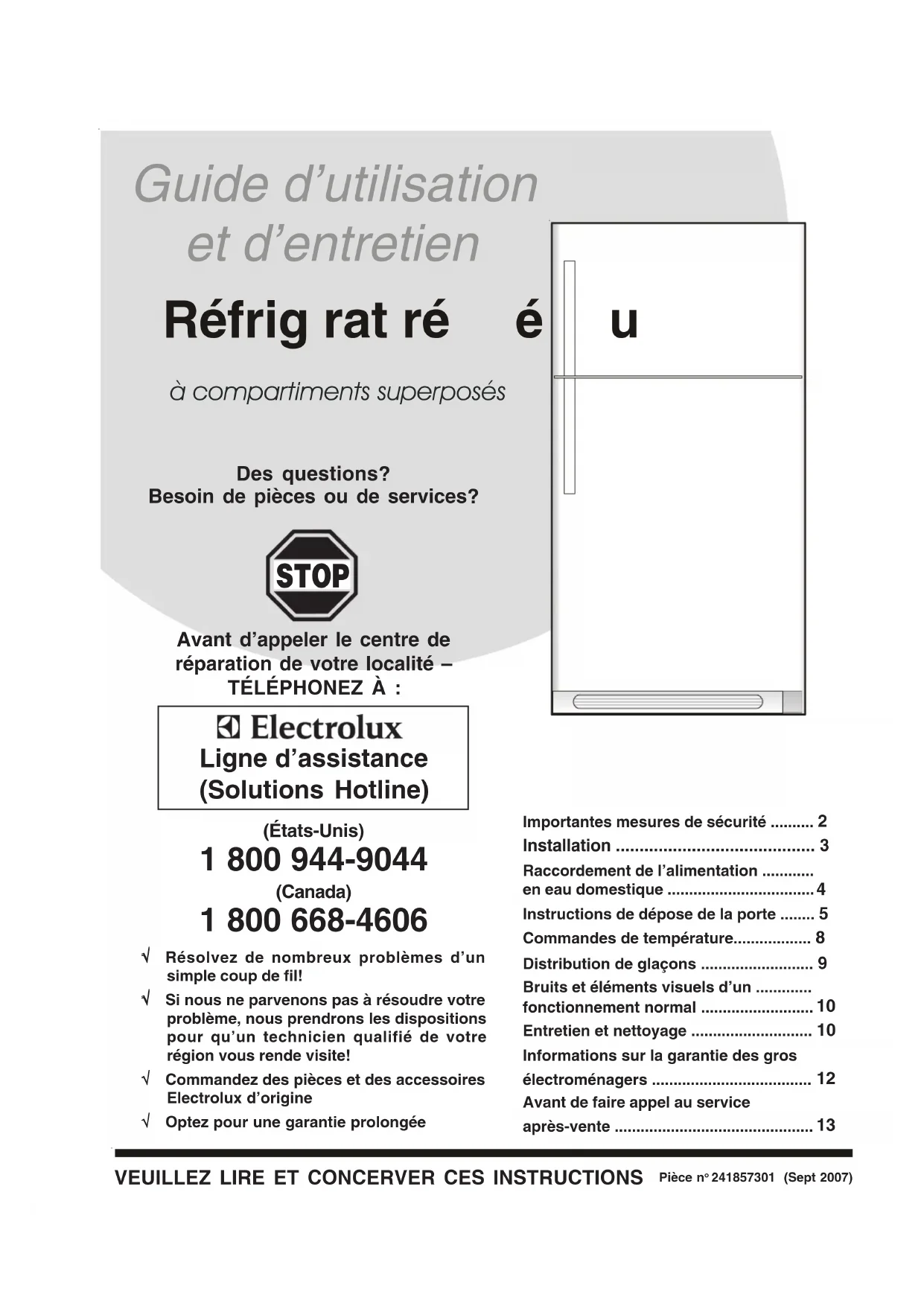TTENTIONTTENTION TTENTIONTTENTION TTENTION N’installez pas le réfrigérateur dans un endroit où la température descend en dessous de 13 °C (55 °F) ou monte au-dessus de 43 °C (110 °F). Le compresseur ne pourra maintenir la température appropriée à l’intérieur du réfrigérateur. N’obstruez pas la grille de protection située à l’avant de votre réfrigérateur. Une bonne circulation d’air est essentielle pour que votre réfrigérateur fonctionne REMARQUEREMARQUE REMARQUEREMARQUE REMARQUE Si l’arrière de votre réfrigérateur est muni de serpentins noirs/de tuyauterie (condenseur à refroidissement par air), laissez un espace de 7,6 cm (3 po) dans le haut du réfrigérateur. REMARQUEREMARQUE REMARQUEREMARQUE REMARQUE Si votre réfrigérateur est positionné contre un mur sur le côté des charnières, vous devrez peut-être le distancer du mur pour permettre une plus grande ouverture de la porte. IMPORTANT Si vous installez votre réfrigérateur dans un garage ou un endroit non chauffé, vous risquez d’avoir des difficultés avec la température du congélateur l’hiver, lorsque la température extérieure est de moins 12 °C (55 °F). Vous n’avez qu’à munir votre réfrigérateur d’un ensemble de garage qui diminuera la température minimale de fonctionnement de votre appareil pour la situer à 1 °C (34 °F). Vous pouvez commander cet ensemble par l’entremise de la Ligne d’assistance Electrolux (reportez-vous à la dernière de couverture). Relevez Relevez REMARQUEREMARQUE REMARQUEREMARQUE REMARQUE Élevez l’avant du refrigérateur suffisamment pour que les portes se ferment d’elles-mêmes lorsqu’elles sont à moitié ouvertes. L’inclinaison du réfrigérateur doit être de 0,6 à 1,3 cm (¼ à ½ po) de l’avant vers l’arrière. Ensuite, mettez les côtés du réfrigérateur à niveau. Ce guide d’utilisation et d’entretien contient des instructions d’utilisation spécifiques à votre modèle. Utilisez votre réfrigérateur en suivant les instructions présentées dans ce guide seulement. Avant de mettre le réfrigérateur en marche, suivez ces étapes initiales importantes. EMPLACEMENT