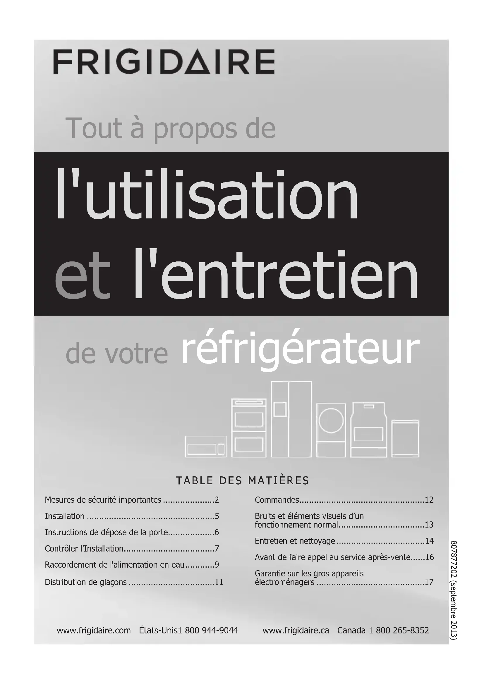 - www.frigidaire.com États-Unis1 800 944-9044 www.frigidaire.ca Canada 1 800 265-8352 Tout à propos de l'utilisation et l'entretien de votre réfrigérateur Mesures de sécurité importantes p. 2