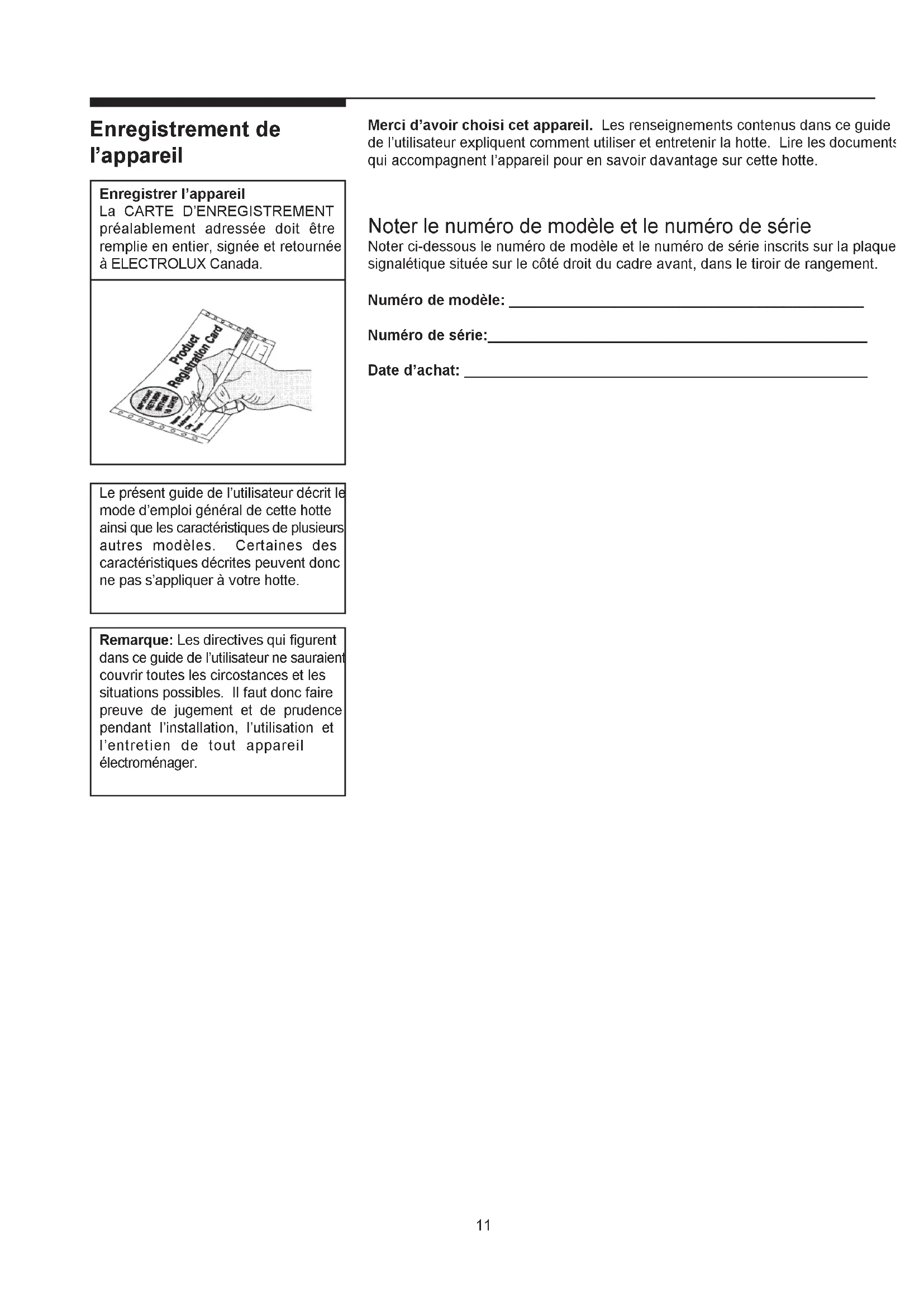 Your range hood is protected by this warranty 03-U-RH-02 USA 800•944•9044 Electrolux Home Products North America P.O. Box 212378 Augusta, GA 30917 Canada 866•213•9397 (English) 866•294•9911 (French) Electrolux Home Products North America 6150 McLaughlin Road Mississauga, Ontario, Canada L5R 4C211 Enregistrement de lappareil Enregistrer lappareil La CARTE DENREGISTREMENT préalablement adressée doit être remplie en entier, signée et retournée à ELECTROLUX Canada. Le présent guide de lutilisateur décrit le mode demploi général de cette hotte ainsi que les caractéristiques de plusieurs autres modèles. Certaines des caractéristiques décrites peuvent donc ne pas sappliquer à votre hotte. Remarque: Les directives qui figurent dans ce guide de lutilisateur ne sauraient couvrir toutes les circostances et les situations possibles. Il faut donc faire preuve de jugement et de prudence pendant linstallation, lutilisation et lentretien de tout appareil électroménager. Merci davoir choisi cet appareil. Les renseignements contenus dans ce guide de lutilisateur expliquent comment utiliser et entretenir la hotte. Lire les documents qui accompagnent lappareil pour en savoir davantage sur cette hotte. Noter le numéro de modèle et le numéro de série Noter ci-dessous le numéro de modèle et le numéro de série inscrits sur la plaque signalétique située sur le côté droit du cadre avant, dans le tiroir de rangement. Numéro de modèle: ____________________________________________ Numéro de série:_______________________________________________ Date dachat: __________________________________________________12 Informations importantes relatives à la sécurité LIRE ET CONSERVER LES PRÉSENTES INSTRUCTIONS Faire extrêmement attention lors de lemploi de substances nettoyantes ou détergentes. Aptitude à lemploi dans lenvironnement domestique/cuisine ATTENTION Afin de réduire le risque dincendies et de garantir une évacuation de lair appropriée il faut prévoir une conduite pour lévacuation de lair à lextérieur. Ne pas évacuer lair dans des espaces délimités par des parois/plafonds, attiques, passages ou garages. ATTENTION Uniquement pour la ventilation générale. Ne pas utiliser lappareil pour lévacuation de matériaux et vapeurs dangereux ou explosifs. AVERTISSEMENT AFIN DE RÉDUIRE LE RISQUE DINCENDIES, CHOCS ÉLECTRIQUES OU ACCIDENTS, RESPECTER LES PRESCRIPTIONS SUIVANTES: a. Utiliser lappareil sur la base des instructions fournies par le constructeur. En cas de doutes ou pour toute explication ultérieure, sadresser à la société constructrice. b. Avant deffectuer le nettoyage ou lentretien, couper lalimentation du panneau de commandes puis bloquer le dispositif de déconnexion du courant électrique afin déviter tout risque dactionnement involontaire. Sil devait se révéler impossible de bloquer le dispositif de déconnexion, appliquer un signal davertissement approprié (par exemple: un panneau), bien visible et en position stable, sur le panneau de commandes. AVERTISSEMENT POUR RÉDUIRE LES RISQUES DINCENDIES PROVOQUÉS PAR LE RENVERSEMENT DE GRAISSE SUR LE PLAN DE LA CUISINE: a. Ne jamais laisser sans surveillance les appareils de cuisson réglés au maximum. La cuisson à puissance élevée est susceptible de générer des fumées et de provoquer le renversement de graisse pouvant senflammer. Réchauffer lentement et à faible puissance lhuile ou la graisse. b. Allumer toujours la hotte (position ON) pendant le réchauffement à température élevée ou la cuisson à la flamme. c. Nettoyer fréquemment les rotors de ventilation. Ne pas laisser que la graisse saccumule sur le rotor de ventilation ou sur le filtre. d. Utiliser des poêles ou casseroles de dimensions appropriées. Choisir toujours des outils de cuisine appropriés en fonction des dimensions du plan. AVERTISSEMENT POUR RÉDUIRE LES RISQUES DACCIDENTS SUITE AUX INCENDIES PROVOQUÉS PAR LE RENVERSEMENT DE GRAISSE SUR LE PLAN DE LA CUISINE, SUIVRE LES INSTRUCTIONS SUIVANTES: a. Essayer dÉTOUFFER LES FLAMMES au moyen dun couvercle de petites dimensions, un plateau métallique ou une feuille de papier daluminium, puis éteindre le brûleur. EFFECTUER LES OPÉRATIONS NÉCESSAIRES AVEC PRÉCAUTIONS, AFIN DÉVITER TOUT RISQUE DE BRÛLURES. Si les flammes ne séteignent pas immédiatement, ÉVACUER LES LOCAUX PUIS CONTACTER LES SAPEURS-POMPIERS. b. NE JAMAIS SOULEVER UNE CASSEROLE EN FLAMMES: il y a le risque de se brûler. c. NE PAS UTILISER DE LEAU, des torchons ou serviettes mouillés: il existe le risque quune violente explosion de vapeur se produise. d. Utiliser un extincteur UNIQUEMENT à condition que: