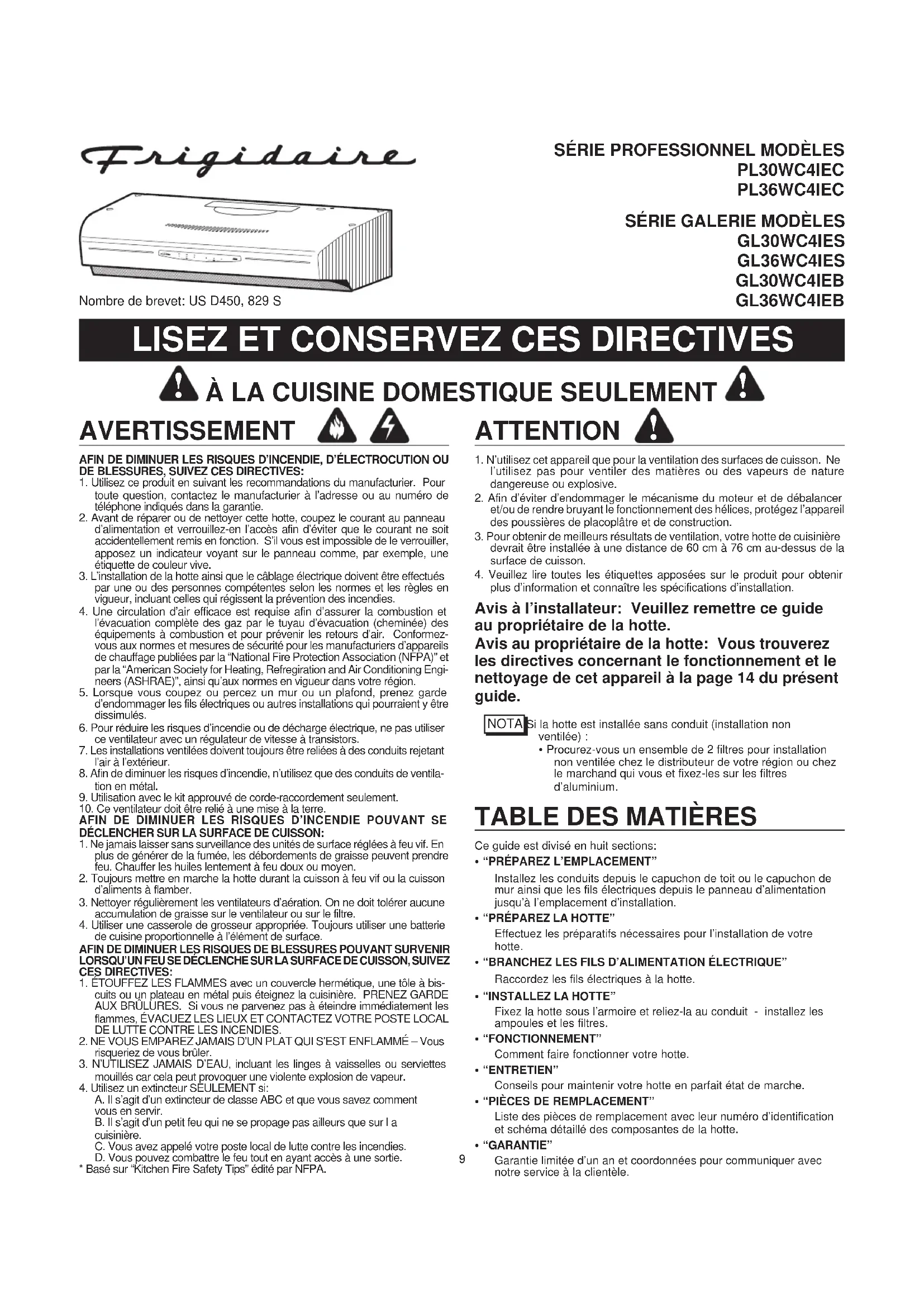 Avis à l’installateur: Veuillez remettre ce guideau propriétaire de la hotte.Avis au propriétaire de la hotte: Vous trouverezles directives concernant le fonctionnement et lenettoyage de cet appareil à la page 14 du présentguide. ATTENTION 1. N’utilisez cet appareil que pour la ventilation des surfaces de cuisson. Nel’utilisez pas pour ventiler des matières ou des vapeurs de naturedangereuse ou explosive.2. Afin d’éviter d’endommager le mécanisme du moteur et de débalanceret/ou de rendre bruyant le fonctionnement des hélices, protégez l’appareildes poussières de placoplâtre et de construction.3. Pour obtenir de meilleurs résultats de ventilation, votre hotte de cuisinièredevrait être installée à une distance de 60 cm à 76 cm au-dessus de lasurface de cuisson.4. Veuillez lire toutes les étiquettes apposées sur le produit pour obtenirplus d’information et connaître les spécifications d’installation.