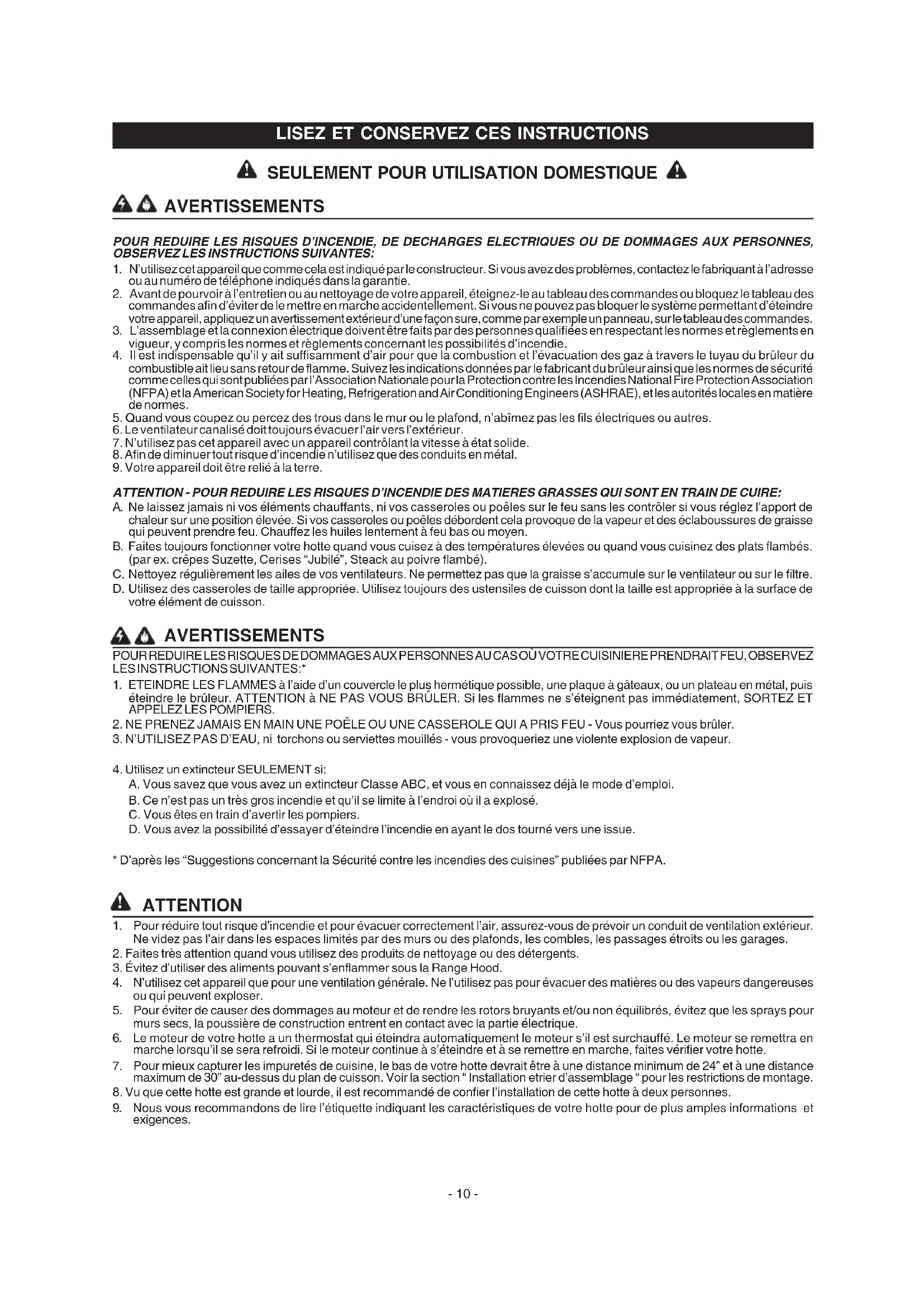 A. Ne laissez jamais ni vos éléments chauffants, ni vos casseroles ou poêles sur le feu sans les contrôler si vous régalez l'apport de chaleur sur une position élevée. Si vos casseroles ou poêles débordent, cela provoque de la vapeur et des éclaboussures de graisse qui peuvent prendre feu. Chauffez les huiles lentement à feu bas ou moyen. B. Faites toujours fonctionner toute hotte quand vous cuisez à des températures élevées ou quand vous cuisinez des plats flambés. (par ex. crêpes Suzette, Cerises "Jubilé", Steak au poivre flambé). C. Nettoyez régulièrement les ailes de vos ventilateurs. Ne permettez pas que la graisse s'accumule sur le ventilateur ou sur le filtre. D. Utilisez des casseroles de taille appropriée. Utilisez always des ustensiles de cuisson dont la taille est appropriée à la surface de votre élément de cuisson.