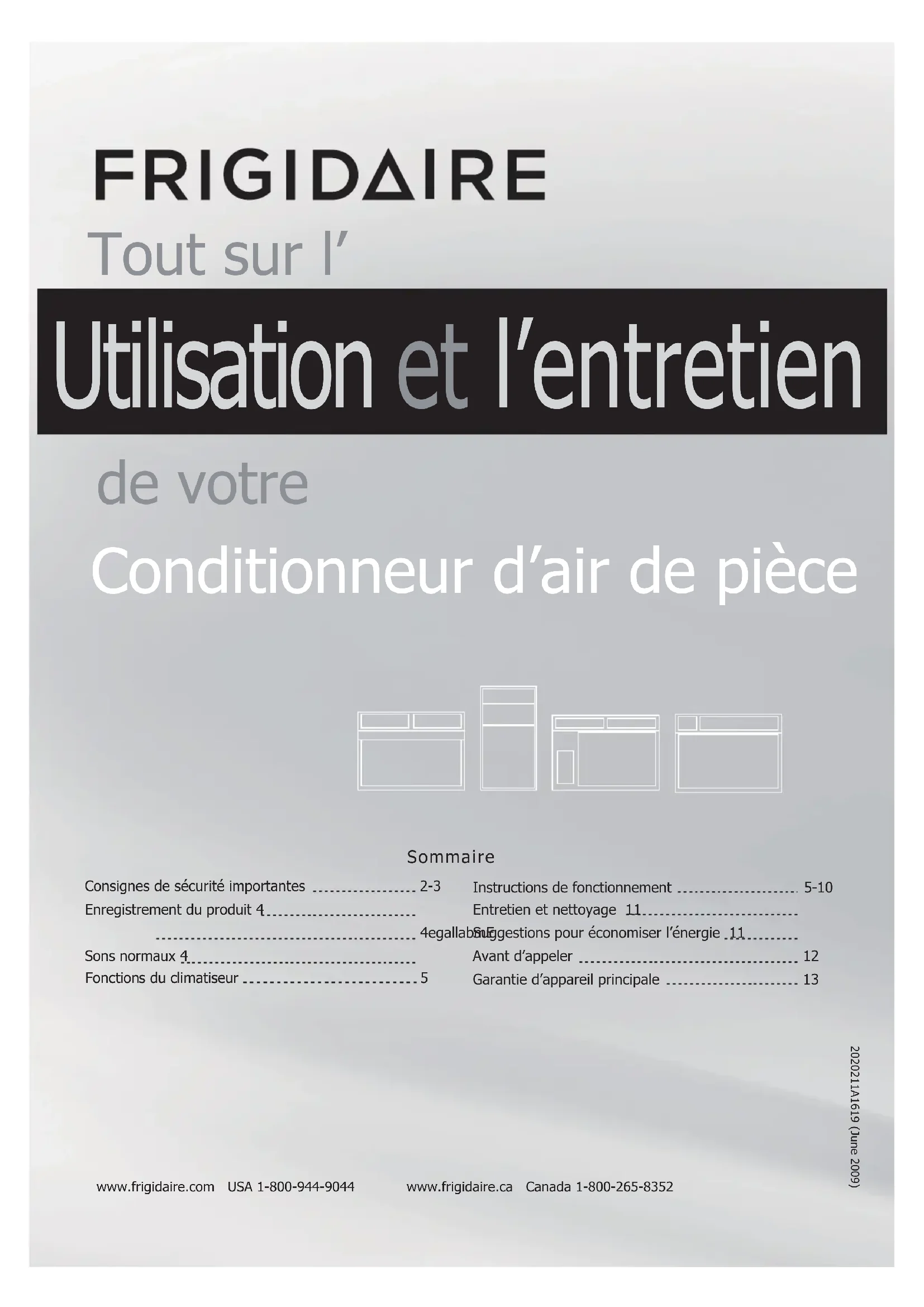 Sommaire www.frigidaire.com USA 1-800-944-9044 www.frigidaire.ca Canada 1-800-265-8352 Tout sur l’ Utilisation et l’entretien Entretien et nettoyage 11 Suggestions pour économiser l’énergie 11 2020211A1619 (June 2009) Enregistrement du produit 4 4egallabmE Sons normaux 4 5ruesitamilcudsnoitcnoF Consignes de sécurité importantes 2-3 de votre Conditionneur d’air de pièce Avant d’appeler 12 Garantie d’appareil principale 31 Instructions de fonctionnement 5-10CONSIGNES DE SECURITE Ce climatiseur ne contient pas de pièces réparables par l’utilisateur. Appelez toujours du personnel de service licencié Electrolux pour les réparations.N'insérez et ne placez pas les doigts ou des objets dans la zone d'évacuation d'air de l'unité. Ne démarrez et n'arrêtez pas le climatiseur en débranchant le cordon d'alimentation ou en éteignant l'alimentation dans la boîte électrique. Ne coupez pas et n'endommagez pas le cordon d'alimentation.Si le cordon d’alimentation est endommagé, il doit être remplacé par un personnel de service licencié Electrolux. Dans le cas d'un dysfonctionnement (étincelles, odeur de brûlé, etc.) arrêtez immédiatement le fonctionnement, débranchez le cordon d'alimentation et appelez un personnel de service licencié Electrolux.Ne manipulez pas les climatiseurs avec des mains mouillées.Ne tirez pas sur le cordon d'alimentation.Ne buvez pas l’eau drainée depuis les climatiseurs. DANGER! Éviter les blessures graves et la mort Consignes de sécurité importantes