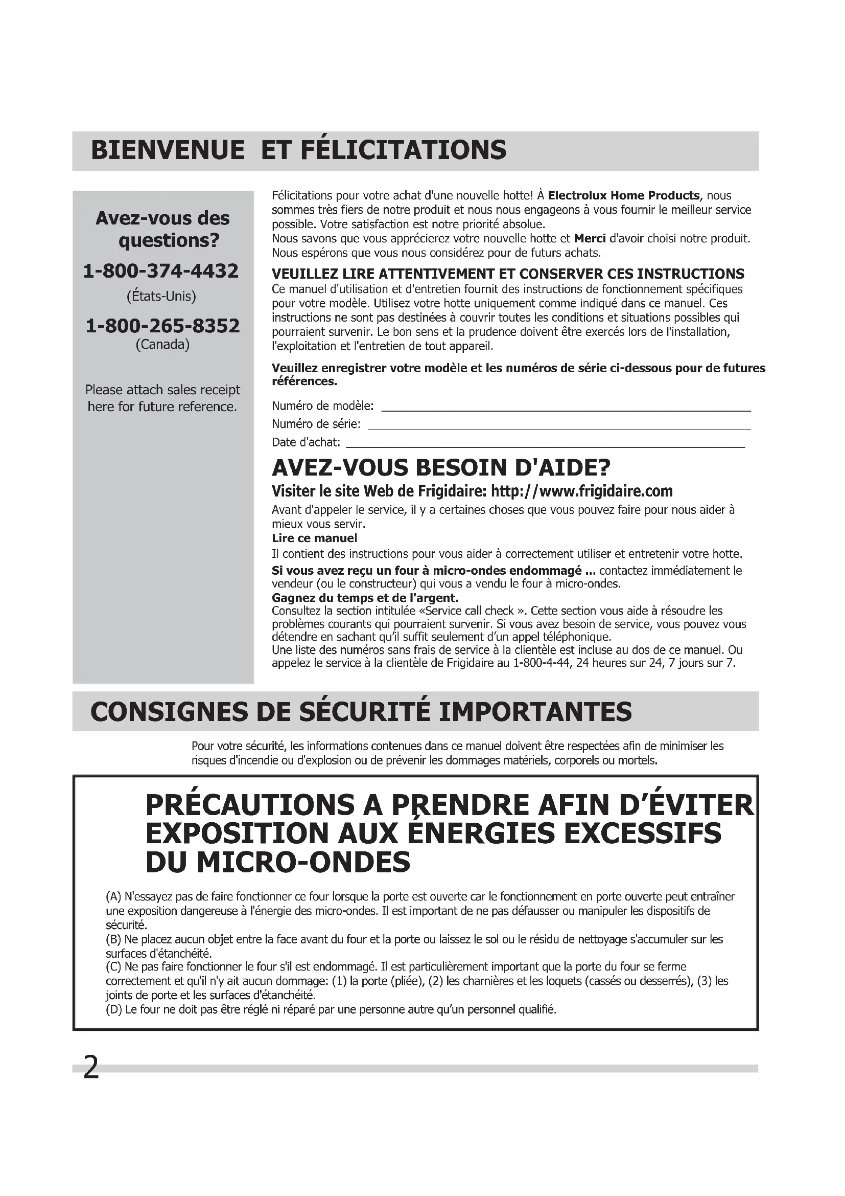 DU MICRO-ONDES Si vous avez reçu un four à micro-ondes endommagé ... contactez immédiatement le vendeur (ou le constructeur) qui vous a vendu le four à micro-ondes.Gagnez du temps et de l'argent.Consultez la section intitulée «Service call check ». Cette section vous aide à résoudre les problèmes courants qui pourraient survenir. Si vous avez besoin de service, vous pouvez vous détendre en sachant qu’il suffit seulement d’un appel téléphonique.Une liste des numéros sans frais de service à la clientèle est incluse au dos de ce manuel. Ou appelez le service à la clientèle de Frigidaire au 1-800-4-44, 24 heures sur 24, 7 jours sur 7. (A) N'essayez pas de faire fonctionner ce four lorsque la porte est ouverte car le fonctionnement en porte ouverte peut entraîner une exposition dangereuse à l'énergie des micro-ondes. Il est important de ne pas défausser ou manipuler les dispositifs de sécurité. (B) Ne placez aucun objet entre la face avant du four et la porte ou laissez le sol ou le résidu de nettoyage s'accumuler sur les surfaces d'étanchéité. (C) Ne pas faire fonctionner le four s'il est endommagé. Il est particulièrement important que la porte du four se ferme correctement et qu'il n'y ait aucun dommage: (1) la porte (pliée), (2) les charnières et les loquets (cassés ou desserrés), (3) les joints de porte et les surfaces d'étanchéité.(D) Le four ne doit pas être réglé ni réparé par une personne autre qu’un personnel qualifié.Avez-vous des questions?(États-Unis)1-800-265-8352(Canada)Please attach sales receipthere for future reference. 1-800-374-4432 Avant d'appeler le service, il y a certaines choses que vous pouvez faire pour nous aider à mieux vous servir.Lire ce manuelIl contient des instructions pour vous aider à correctement utiliser et entretenir votre hotte. AVEZ-VOUS BESOIN D'AIDE? Visiter le site Web de Frigidaire: http://www.frigidaire.comVEUILLEZ LIRE ATTENTIVEMENT ET CONSERVER CES INSTRUCTIONSVeuillez enregistrer votre modèle et les numéros de série ci-dessous pour de futures références.Numéro de modèle: __________________________________________________________Numéro de série: ____________________________________________________________Date d'achat: ___________________________________________________________Félicitations pour votre achat d'une nouvelle hotte! À Electrolux Home Products, nous sommes très fiers de notre produit et nous nous engageons à vous fournir le meilleur service possible. Votre satisfaction est notre priorité absolue. Nous savons que vous apprécierez votre nouvelle hotte et Merci d'avoir choisi notre produit. Nous espérons que vous nous considérez pour de futurs achats.Ce manuel d'utilisation et d'entretien fournit des instructions de fonctionnement spécifiques pour votre modèle. Utilisez votre hotte uniquement comme indiqué dans ce manuel. Ces instructions ne sont pas destinées à couvrir toutes les conditions et situations possibles qui pourraient survenir. Le bon sens et la prudence doivent être exercés lors de l'installation, l'exploitation et l'entretien de tout appareil.3