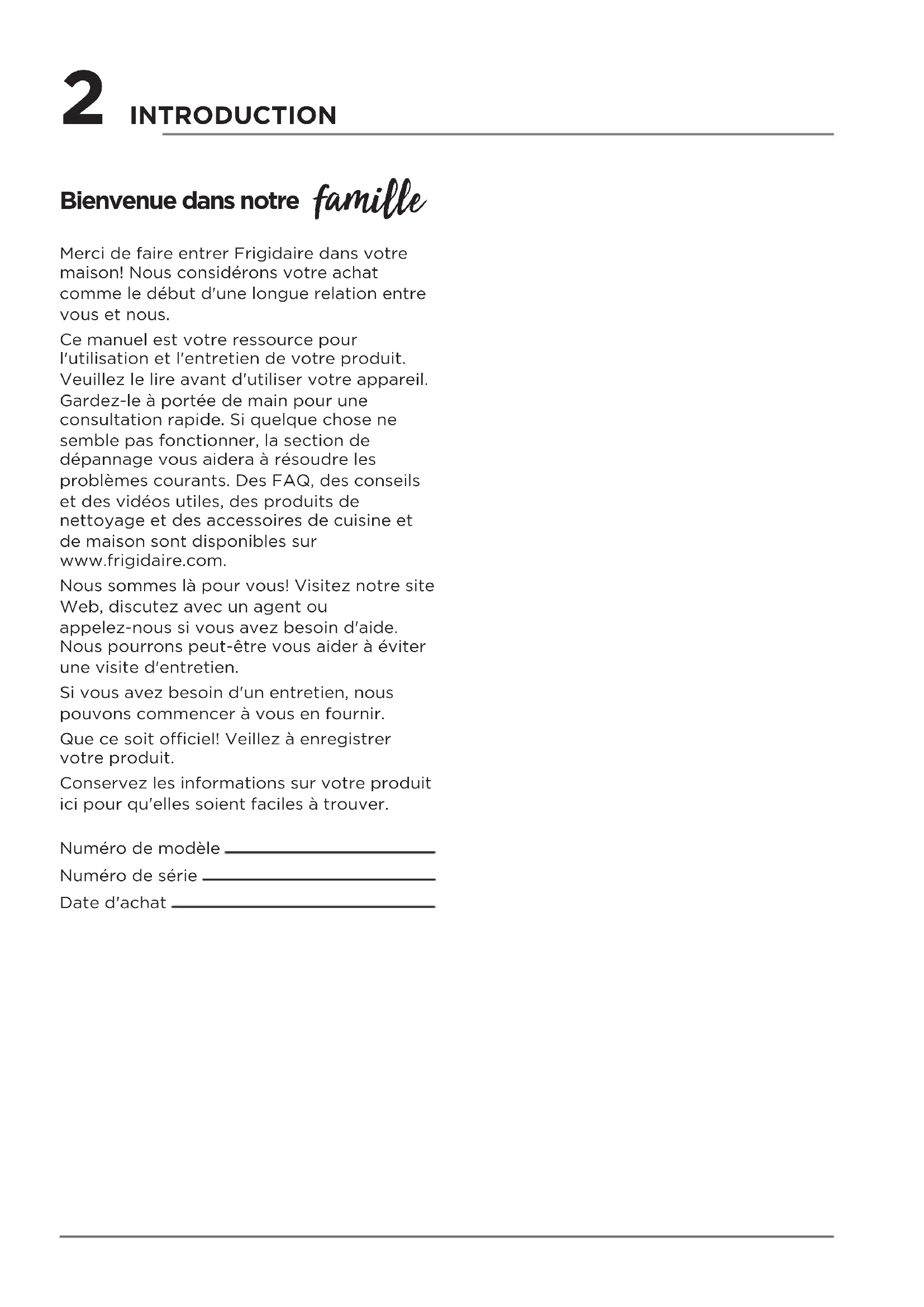 Instructions de fonctionnement............... 92 INTRODUCTION Bienvenue dans notre famie Numéro de modèle Numéro de série Date d'achat Merci de faire entrer Frigidaire dans votre maison! Nous considérons votre achat comme le début d'une longue relation entre vous et nous. Ce manuel est votre ressource pour l'utilisation et l'entretien de votre produit. Veuillez le lire avant d'utiliser votre appareil. Gardez-le à portée de main pour une consultation rapide. Si quelque chose ne semble pas fonctionner, la section de dépannage vous aidera à résoudre les problèmes courants. Des FAQ, des conseils et des vidéos utiles, des produits de nettoyage et des accessoires de cuisine et de maison sont disponibles sur www.frigidaire.com. Nous sommes là pour vous! Visitez notre site Web, discutez avec un agent ou appelez-nous si vous avez besoin d'aide. Nous pourrons peut-être vous aider à éviter une visite d'entretien. Si vous avez besoin d'un entretien, nous pouvons commencer à vous en fournir. Que ce soit ociel! Veillez à enregistrer votre produit. Conservez les informations sur votre produit ici pour qu'elles soient faciles à trouver.3 Pour votre sécurité
