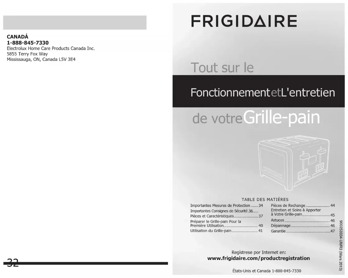 - Après chaque utilisation, débranchez le grille-pain de la prise électrique. Dépannage Si votre grille-pain ne fonctionne pas, assurez-vous que celui- ci est bien branché dans une prise électrique murale reliée à la terre. Si c’est le cas, débranchez l’appareil pendant une minute et rebranchez-le. Si l’appareil ne fonctionne toujours pas, débranchez le grille-pain et vériez le fusible ou le disjoncteur de la prise électrique. Si le problème n’est toujours pas résolu, cessez immédiatement l’utilisation du grille-pain. Se reporter à la section Garantie Frigidaire de ce guide pour obtenir plus de détails. GARANTIE Votre appareil est couvert par une garantie limitée de un (1) an. Pendant un (1) an, à compter de la date d’achat originale, Electrolux réparera ou remplacera l’appareil ou les pièces, à la discrétion d’Electrolux, prouvée comme étant défectueux (se) en matériel ou main-d’oeuvre, lorsque l’appareil est installé, utilisé et entretenu conformément aux instructions fournies. Tous les frais de main d’œuvre et autres associés au retour de l’appareil ou des pièces à nos bureaux et les frais de retour de l’appareil ou des pièces à votre adresse sont exclus de cette garantie. Au titre de la politique de garantie, Electrolux ne remboursera pas le prix d’achat du client. Si un produit ou une pièce couvert par cette garantie n’est plus disponible, Electrolux remplacera le produit par un autre de valeur équivalente ou supérieure. Exclusions : cette garantie ne couvre pas : 1 Les produits dont le numéro de série original a été retiré, altéré ou est rendu illisible. 2 Les produits ayant été transférés du propriétaire original à un autre tiers ou sorti du Canada ou des États-Unis. 3 La rouille sur l’intérieur ou l’extérieur de l’appareil. 4 Les produits achetés tels quels. 5 La perte d’aliments dus à une défaillance du produit. 6 Les produits utilisés pour un but commercial ou tout autre sauf pour une utilisation résidentielle. 7 La main d’œuvre et les visites d’entretien, peu importe les circonstances. 8 Les pièces de vitre ou les contenants, ltres, surface non- adhérente. 9 L’usure normale et déchirure. 10 Les dommages causés par une utilisation, une installation ou un entretien inadéquat; l’utilisation de pièces autres que des pièces d’origine Electrolux; la négligence; l’abus; la mauvaise utilisation; une alimentation électrique inadéquate ou excessive; des accidents; des incendies; ou des cas de forces majeures. Conservez votre reçu ou toute autre preuve de paiement appropriée permettant d’établir la période de garantie. Si un service sous garantie était nécessaire, une preuve d’achat devrait être fournie.48