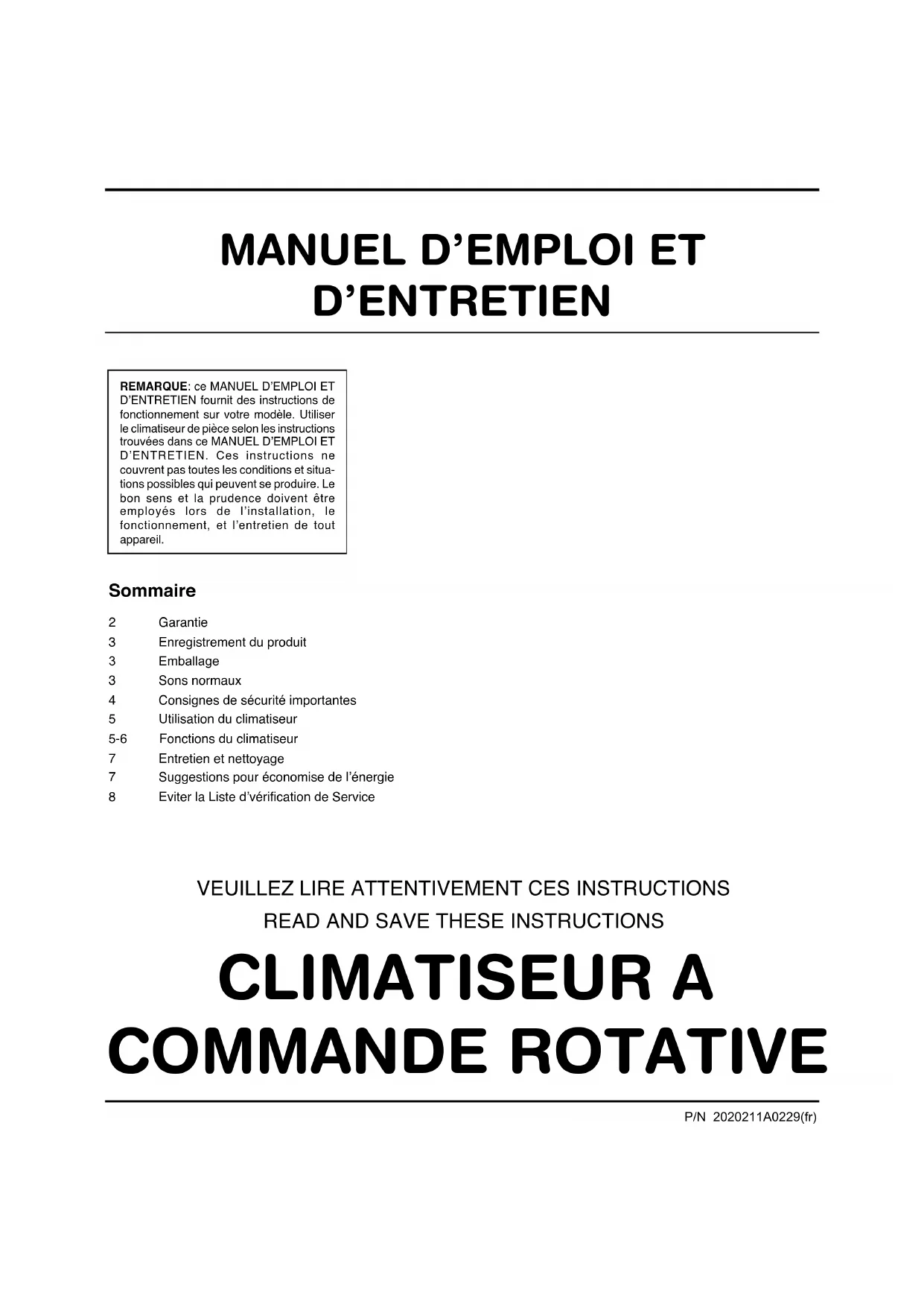 Sommaire 2 Garantie3 Enregistrement du produit3 Sons normaux4 Consignes de sécurité importantes5 Utilisation du climatiseur5-6 Fonctions du climatiseur7 Entretien et nettoyage7 Suggestions pour économise de l’énergie8 Eviter la Liste d’vérification de ServiceREMARQUE: ce MANUEL D’EMPLOI ETD’ENTRETIEN fournit des instructions defonctionnement sur votre modèle. Utiliserle climatiseur de pièce selon les instructionstrouvées dans ce MANUEL D’EMPLOI ETD’ENTRETIEN. Ces instructions necouvrent pas toutes les conditions et situa-tions possibles qui peuvent se produire. Lebon sens et la prudence doivent êtreemployés lors de l’installation, lefonctionnement, et l’entretien de toutappareil.3 Emballage P/N 2020211A0229(fr)