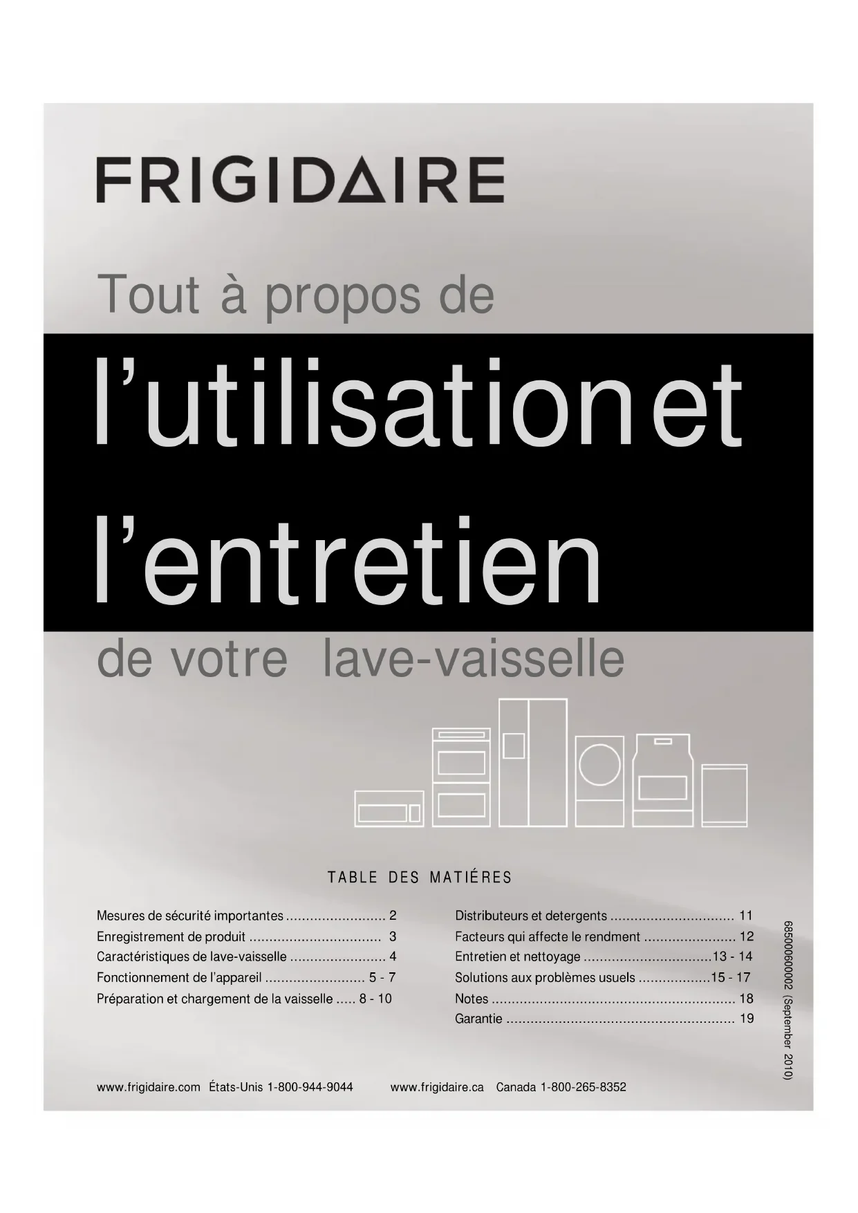 Tout à propos de l’utilisation et l’entretien de votre lave-vaisselle www.frigidaire.com États-Unis 1-800-944-9044 www.frigidaire.ca Canada 1-800-265-8352 685000600002 (September 2010)