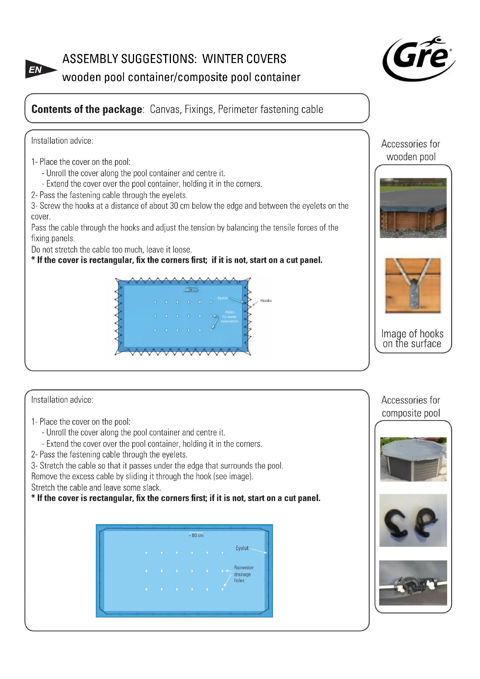 couverture. Passer le sandow sous les crochets et ajuster la tension en équilibrant les forces de traction entre les pans de fixation. Ne pas tendre trop fortement, laisser du jeu dans la tension du sandow. *Si la couverture est rectangulaire, fixer les coins de la couverture en premier, si elle n’est pas rectangulaire commencer par un pan coupé. Conseil de pose: