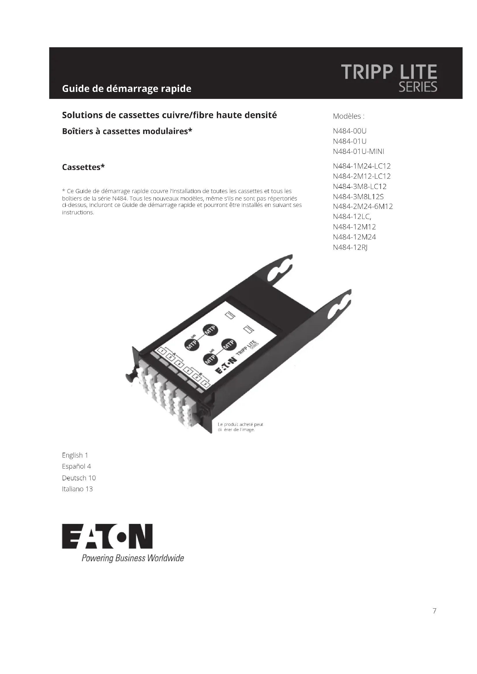 - Renvoyer le nouvel équipement pour recyclage lorsqu'il devient un déchet en n de vie L'utilisation de ce produit avec des dispositifs de maintien en vie n'est pas recommandée dans les cas où une panne de ce produit serait susceptible d'entraîner une panne du dispositif de maintien en vie ou de nuire considérablement à sa sécurité ou à son ecacité. Eaton mène une politique d'amélioration constante. Les caractéristiques peuvent être modiées sans préavis. Les photos et illustrations peuvent légèrement diérer des produits réels. Eaton 1000 Eaton Boulevard Cleveland, OH 44122 États-Unis Eaton.com © 2023 Eaton Tous droits réservés. Publication n° 23-08-374 / 93-341E_RevF Septembre 2023 Eaton est une marque déposée. Toutes les marques commerciales appartiennent à leurs propriétaires respectifs. Installation Garantie10 Kurzanleitung English 1 Español4 Français7 Italiano 13 Das gekaufte Produkt kann von der Abbildung abweichen. Modelle: N484-00Ul N484-01Ul N484-01U-MINIl N484-1M24-LC12l N484-2M12-LC12l N484-3M8-LC12l N484-3M8L12Sl N484-2M24-6M12l N484-12LCl N484-12M12l N484-12M24l N484-12RJl High-Density Kupfer/Glasfaser-Kassettenlösungen Modulare Kassettengehäuse* Kassetten*