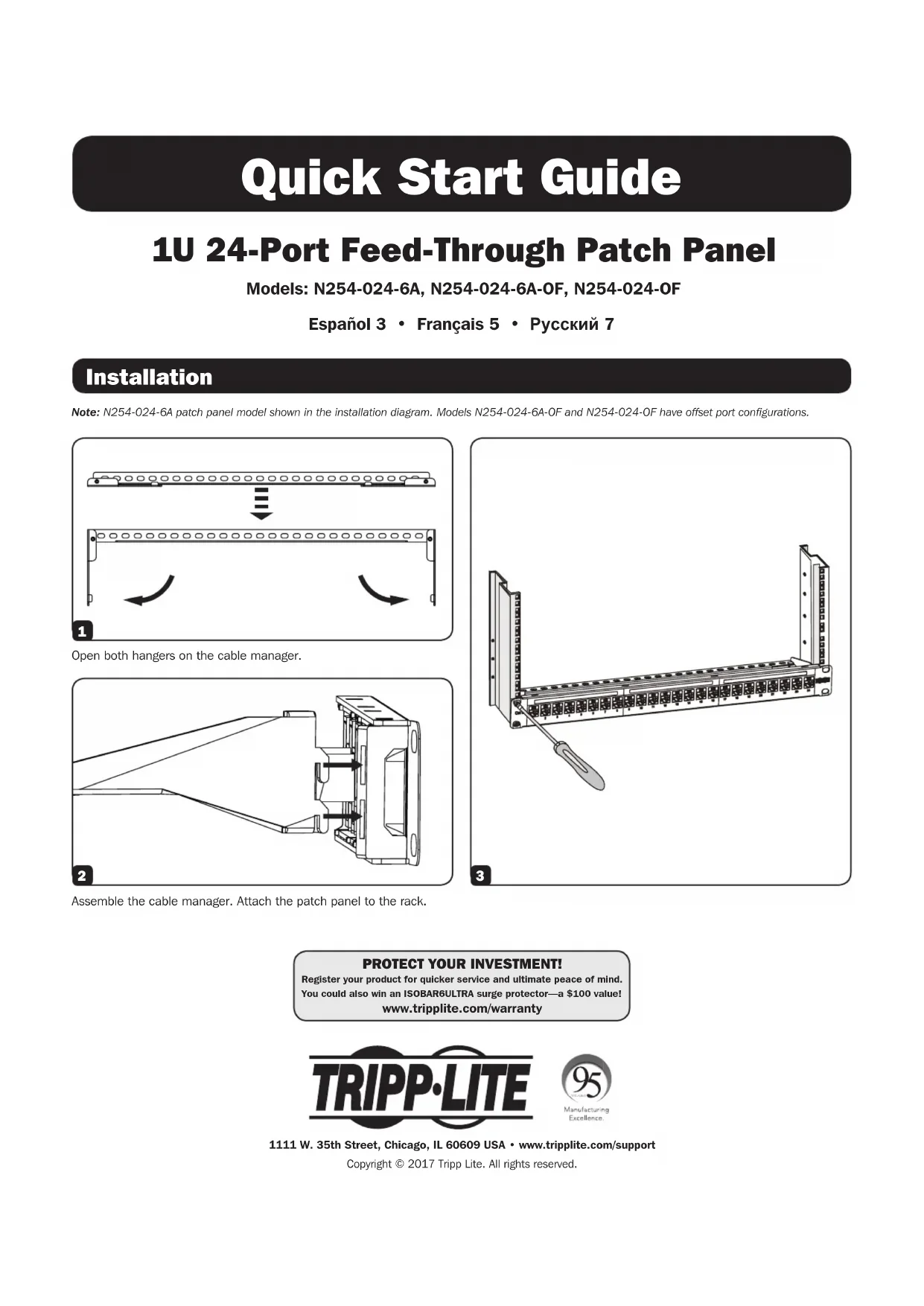 Panneau de câblage avec espace pour passer les fils avec 24 ports 1U Modèles : N254-024-6A, N254-024-6A-OF, N254-024-OF English 1 • Español 3 • Русский 7 1111 W. 35th Street, Chicago, IL 60609 Etats-Unis • www.tripplite.com/supportDroits d’auteur © 2017 Tripp Lite. Tous droits réservés.Ouvrir les deux crochets sur le gestionnaire de câbles.Assembler le gestionnaire de câbles. Fixer le panneau de câblage au bâti. Remarque : Le panneau de câblage illustré dans le diagramme d’installation est le modèle N254-024-6A. Les configurations des ports pour les modèles N254-0246A-OF et N254-024-OF sont décalées.6 Garantie 1111 W. 35th Street, Chicago, IL 60609 Etats-Unis • www.tripplite.com/support Garantie à vie limitée TRIPP LITE garantit que ses produits sont dépourvus de vices de matériaux et de fabrication pendant leur durée de vie. La responsabilité de TRIPP LITE, en vertu de la présente garantie, se limite à la réparation ou au remplacement (à sa seule discrétion) de ces produits défectueux. Pour obtenir réparation sous cette garantie, vous devez obtenir un numéro d’autorisation de retour de matériel (« RMA ») auprès de TRIPP LITE ou d’un centre de réparation autorisé par TRIPP LITE. Les produits doivent être retournés à TRIPP LITE ou à un centre de réparation autorisé par TRIPP LITE en port prépayé et être accompagnés d’une brève description du problème et d’un justificatif de la date et du lieu d’achat. Cette garantie ne s’applique pas au matériel ayant été endommagé suite à un accident, à une négligence ou à un application abusive, ou ayant été altéré ou modifié d’une façon quelconque. SAUF INDICATION CONTRAIRE DANS LES PRÉSENTES, TRIPP LITE N’ÉMET AUCUNE GARANTIE, EXPRESSE OU TACITE, Y COMPRIS DES GARANTIES DE QUALITÉ COMMERCIALE ET D’ADÉQUATION À UN USAGE PARTICULIER. Certains États n’autorisant pas la limitation ni l’exclusion de garanties tacites, les limitations ou exclusions susmentionnées peuvent ne pas s’appliquer à l’acheteur. À L’EXCEPTION DES DISPOSITIONS CI-DESSUS, TRIPP LITE NE POURRA EN AUCUN CAS ÊTRE TENUE RESPONSABLE DE DOMMAGES DIRECTS, INDIRECTS, SPÉCIAUX, FORTUITS OU CONSÉCUTIFS RÉSULTANT DE L’UTILISATION DE CE PRODUIT, MÊME SI AYANT ÉTÉ AVISÉE DE L’ÉVENTUALITÉ DE TELS DOMMAGES. Plus précisément, TRIPP LITE ne pourra être tenue responsable de coûts, tels que perte de bénéfices ou de recettes, perte de matériel, impossibilité d’utilisation du matériel, perte de logiciel, perte de données, frais de produits de remplacement, réclamations d’un tiers ou autres. La politique de Tripp Lite en est une d’amélioration continue. Les spécifications sont sujettes à changement sans préavis.7 Краткое руководство пользователя