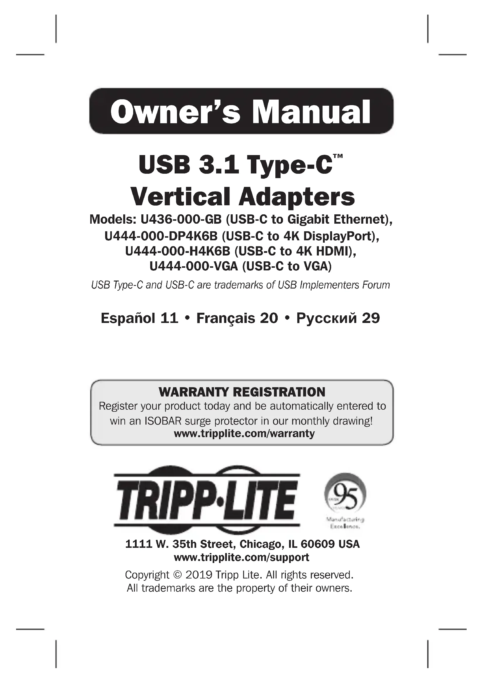 Modèles : U436-000-GB (USB-C à Gigabit Ethernet), U444-000-DP4K6B (USB-C à 4K DisplayPort), U444-000-H4K6B (USB-C à 4K HDMI), U444-000-VGA (USB-C à VGA) USB Type-C et USB-C sont des marques de commerce d'USB Implementers Forum.1111 W. 35th Street, Chicago, IL 60609 USA www.tripplite.com/supportDroits d'auteur © 2019 Tripp Lite. Tous droits réservés. Toutes les marques de commerce sont la propriété de leurs propriétaires respectifs. English 1 • Español 11 • Русский 2921 Caractéristiques du produit