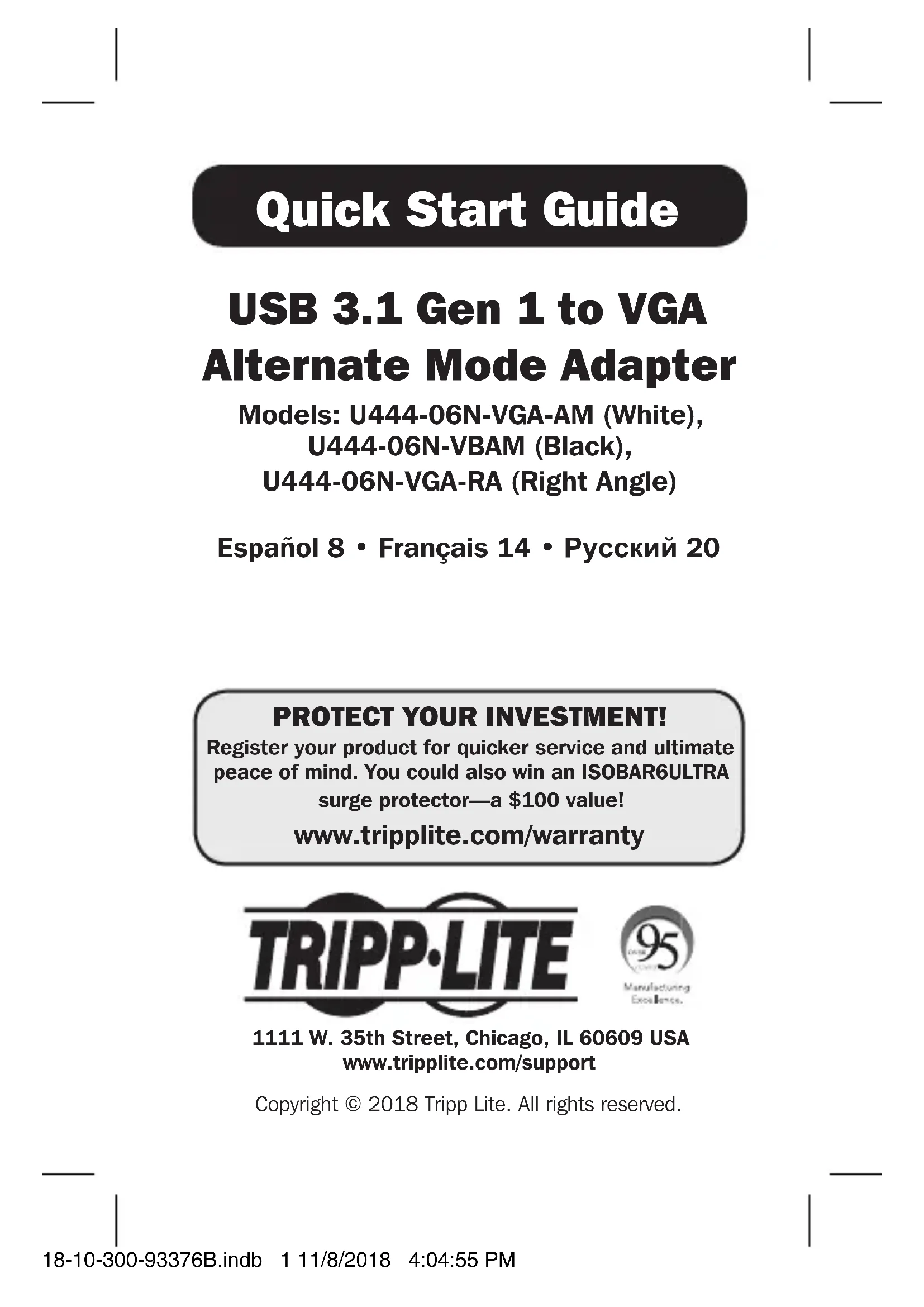 TRIPP LITE garantit que ses produits sont exempts de vices de matériaux et de fabrication pendant une période de trois (3) ans à partir de la date d’achat initiale. La responsabilité de TRIPP LITE, en vertu de la présente garantie, se limite à la réparation ou au remplacement (à sa seule discrétion) de ces produits défectueux. Pour obtenir réparation sous cette garantie, vous devez obtenir un numéro d’autorisation de retour de matériel (« RMA ») auprès de TRIPP LITE ou d’un centre de réparation autorisé par TRIPP LITE. Les produits doivent être retournés à TRIPP LITE ou à un centre de réparation autorisé par TRIPP LITE en port prépayé et être accompagnés d’une brève description du problème et d’un justificatif de la date et du lieu d’achat. Cette garantie ne s’applique pas au matériel ayant été endommagé suite à un accident, à une négligence ou à une application abusive, ou ayant été altéré ou modifié d’une façon quelconque. SAUF INDICATION CONTRAIRE DANS LES PRÉSENTES, TRIPP LITE N’ÉMET AUCUNE GARANTIE, EXPRESSE OU TACITE, Y COMPRIS DES GARANTIES DE QUALITÉ COMMERCIALE ET D’ADÉQUATION À UN USAGE PARTICULIER. Certains États n’autorisant pas la limitation ni l’exclusion de garanties tacites, les limitations ou exclusions susmentionnées peuvent ne pas s’appliquer à l’acheteur. À L’EXCEPTION DES DISPOSITIONS CI-DESSUS, TRIPP LITE NE POURRA EN AUCUN CAS ÊTRE TENUE RESPONSABLE DE DOMMAGES DIRECTS, INDIRECTS, SPÉCIAUX, FORTUITS OU CONSÉCUTIFS RÉSULTANT DE L’UTILISATION DE CE PRODUIT, MÊME SI AYANT ÉTÉ AVISÉE DE L’ÉVENTUALITÉ DE TELS DOMMAGES. Plus précisément, TRIPP LITE ne pourra être tenue responsable de coûts, tels que perte de bénéfices ou de recettes, perte de matériel, impossibilité d’utilisation du matériel, perte de logiciel, perte de données, frais de produits de remplacement, réclamations d’un tiers ou autres. 18-10-300-93376B.indb 18 11/8/2018 4:04:56 PM19 Garantie La politique de Tripp Lite en est une d’amélioration continue. Les caractéristiques techniques sont sujettes à changement sans préavis. 1111 W. 35th Street, Chicago, IL 60609 USA www.tripplite.com/support 18-10-300-93376B.indb 19 11/8/2018 4:04:57 PM20 Краткое руководство пользователя Переходник USB 3.1 Gen 1 ― VGA Alternate Mode Модели: U444-06N-VGA-AM (белый), U444-06N-VBAM (Черный), U444-06N-VGA-RA (Прямоугольный) English 1 • Español 8 • Français 14 1111 W. 35th Street, Chicago, IL 60609 USA www.tripplite.com/support Охраняется авторским правом © 2018 Tripp Lite. Перепечатка запрещается. 18-10-300-93376B.indb 20 11/8/2018 4:04:57 PM21 Характеристики продукта