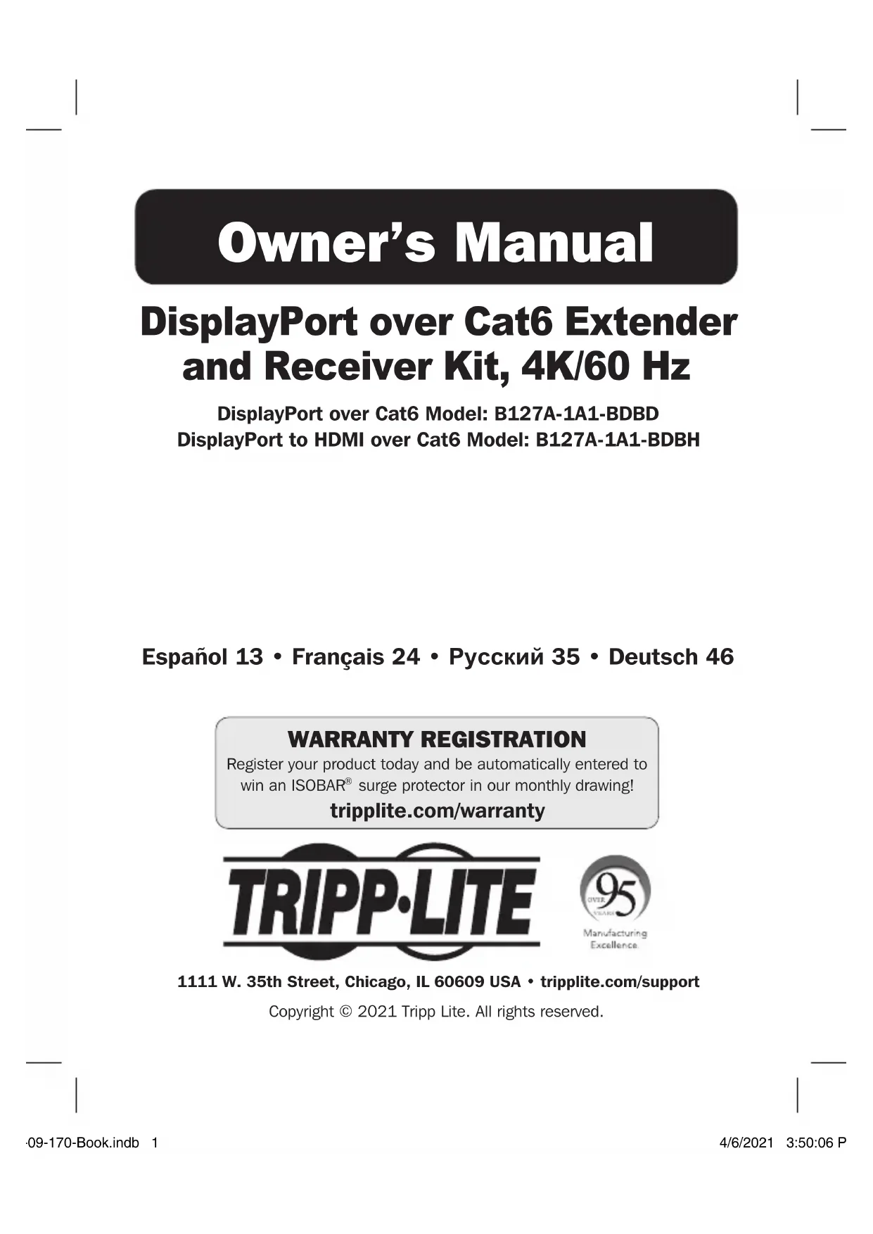 - De retourner le nouvel équipement afin qu'il soit recyclé à la fin de sa vie utile. AVERTISSEMENT Il n'est pas recommandé d'utiliser cet équipement pour des appareils de survie où une défaillance de cet équipement peut, selon toute vraisemblance, entraîner la défaillance de l’appareil de maintien de la vie ou nuire de façon majeure à sa sécurité ou à son efficacité. La politique de Tripp Lite en est une d'amélioration continue. Les caractéristiques techniques sont modifiables sans préavis. Les produits réels peuvent différer légèrement des photos et des illustrations. Garantie Garantie limitée de 1 an TRIPP LITE garantit que ses produits sont exempts de vices de matériaux et de fabrication pendant une période d'un (1) an à partir de la date d'achat initiale. La responsabilité de TRIPP LITE, en vertu de la présente garantie, se limite à la réparation ou au remplacement (à sa seule discrétion) de ces produits défectueux. Pour obtenir une réparation sous la présente garantie, vous devez obtenir un numéro d'autorisation de retour de matériel (RMA) auprès de TRIPP LITE ou d'un centre de réparation reconnu par TRIPP LITE. Les produits doivent être retournés à TRIPP LITE ou à un centre de réparation reconnu par TRIPP LITE en port prépayé et être accompagnés d'une brève description du problème et d'un justificatif de la date et du lieu d'achat. Cette garantie ne s'applique pas au matériel ayant été endommagé suite à un accident, à une négligence ou à une application abusive, ou ayant été altéré ou modifié d'une façon quelconque. SAUF INDICATION CONTRAIRE DANS LES PRÉSENTES, TRIPP LITE N'ÉMET AUCUNE GARANTIE, EXPRESSE OU TACITE, Y COMPRIS DES GARANTIES DE QUALITÉ COMMERCIALE ET D'ADAPTATION À UN USAGE PARTICULIER. Certains États n'autorisant pas la limitation ni l'exclusion de garanties tacites, les limitations ou exclusions susmentionnées peuvent ne pas s'appliquer à l'acheteur. À L'EXCEPTION DES DISPOSITIONS CI-DESSUS, TRIPP LITE NE POURRA EN AUCUN CAS ÊTRE TENUE RESPONSABLE DE DOMMAGES DIRECTS, INDIRECTS, SPÉCIAUX, FORTUITS OU CONSÉCUTIFS RÉSULTANT DE L'UTILISATION DE CE PRODUIT, MÊME SI AYANT ÉTÉ AVISÉE DE L'ÉVENTUALITÉ DE TELS DOMMAGES. Plus précisément, TRIPP LITE ne pourra être tenue responsable de coûts, tels que perte de bénéfices ou de recettes, perte de matériel, impossibilité d'utilisation du matériel, perte de logiciel, perte de données, frais de produits de remplacement, réclamations d'un tiers ou autres. 20-09-170-Book.indb 3420-09-170-Book.indb 34 4/6/2021 3:50:09 PM4/6/2021 3:50:09 PMРуководcтво пользoвателя 1111 W. 35th Street, Chicago, IL 60609 USA • tripplite.com/support Охраняется авторским правом © 2021 Tripp Lite. Перепечатка запрещается. Ретранслятор и приемник DisplayPort через Cat6 в комплекте (4К / 60 Гц) DisplayPort через Cat6: модель B127A-1A1-BDBD DisplayPort — HDMI через Cat6: модель B127A-1A1-BDBH English 1 • Español 13 • Français 24 • Deutsch 46 20-09-170-Book.indb 3520-09-170-Book.indb 35 4/6/2021 3:50:10 PM4/6/2021 3:50:10 PMCoдержимое упакoвки Характеристики изделия