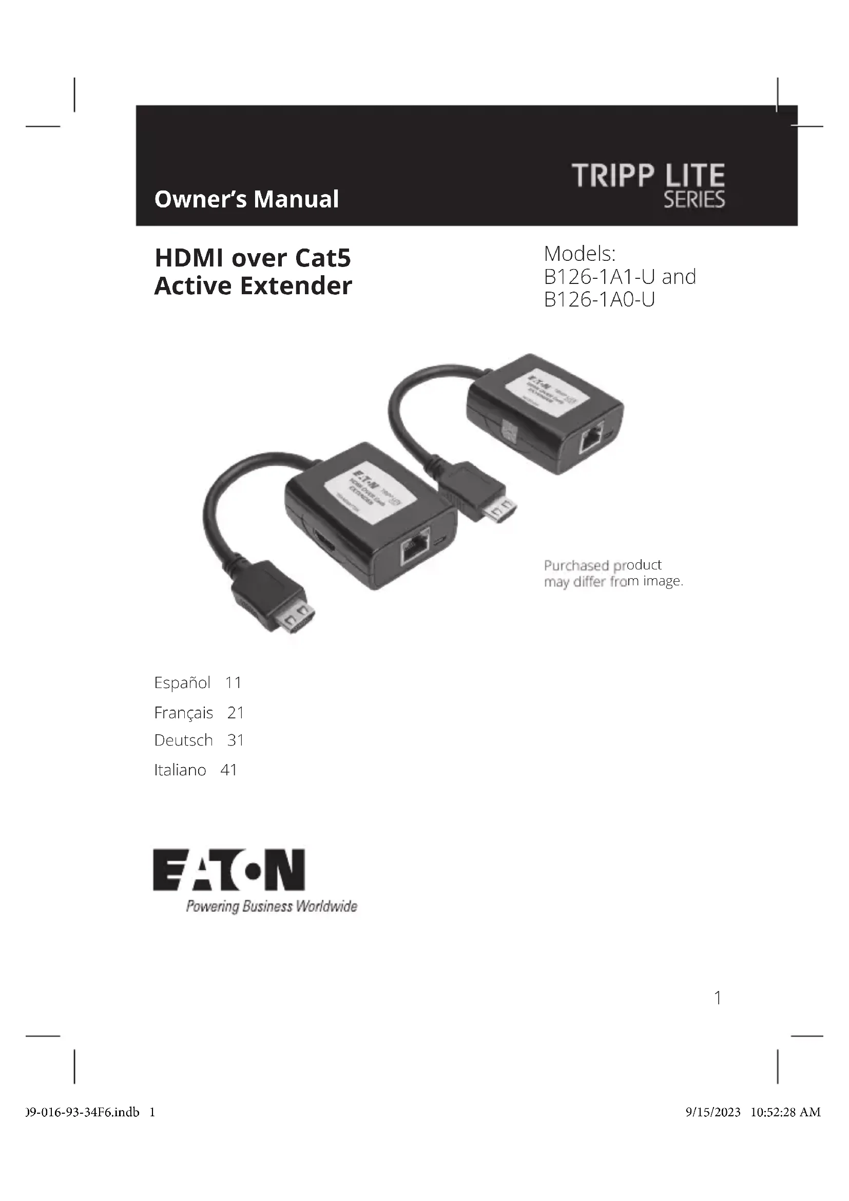 - Renvoyer le nouvel équipement pour recyclage lorsqu'il devient un déchet en fin de vie L'utilisation de cet équipement dans des applications de soutien à la vie où l'on peut raisonnablement s'attendre à ce qu'une défaillance de cet équipement entraînerait une défaillance de l'équipement de soutien à la vie ou affecterait de manière significative sa sécurité ou son efficacité n'est pas recommandée. Eaton mène une politique d'amélioration continue. Les caractéristiques peuvent être modifiées sans préavis. 23-09-016-93-34F6.indb 3023-09-016-93-34F6.indb 30 9/15/2023 10:52:34 AM9/15/2023 10:52:34 AM31 Benutzerhandbuch Spanisch 11 Französisch 21 Deutsch 31 Italienisch 41 Das gekaufte Produkt kann vom Bild abweichen. Modelle: B126-1A1-U und B126-1A0-U HDMI über Cat5 Active Extender 23-09-016-93-34F6.indb 3123-09-016-93-34F6.indb 31 9/15/2023 10:52:34 AM9/15/2023 10:52:34 AM32 Produktmerkmale