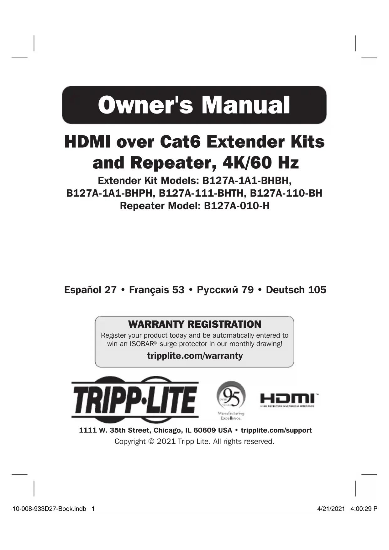 - De retourner le nouvel équipement afin qu'il soit recyclé à la fin de sa vie utile. AVERTISSEMENT Il n'est pas recommandé d'utiliser cet équipement pour des appareils de survie où une défaillance de cet équipement peut, selon toute vraisemblance, entraîner la défaillance de l’appareil de maintien de la vie ou nuire de façon majeure à sa sécurité ou à son efficacité. La politique de Tripp Lite en est une d'amélioration continue. Les caractéristiques techniques sont modifiables sans préavis. Les produits réels peuvent différer légèrement des photos et des illustrations. 1111 W. 35th Street, Chicago, IL 60609 USA • tripplite.com/support 20-10-008 93-3D27_RevA 20-10-008-933D27-Book.indb 7820-10-008-933D27-Book.indb 78 4/21/2021 4:00:33 PM4/21/2021 4:00:33 PM79 Комплекты ретрансляторов HDMI через Cat6 и ретранслятор (4K/60 Гц) Модели комплектов ретрансляторов: B127A-1A1-BHBH, B127A-1A1-BHPH, B127A-111-BHTH, B127A-110-BH Модель ретранслятора: B127A-010-H 1111 W. 35th Street, Chicago, IL 60609 USA • tripplite.com/support Охраняется авторским правом © 2021 Tripp Lite. Перепечатка запрещается. Руководство пользователя English 1 • Español 26 • Français 53 • Deutsch 105 20-10-008-933D27-Book.indb 7920-10-008-933D27-Book.indb 79 4/21/2021 4:00:33 PM4/21/2021 4:00:33 PM80