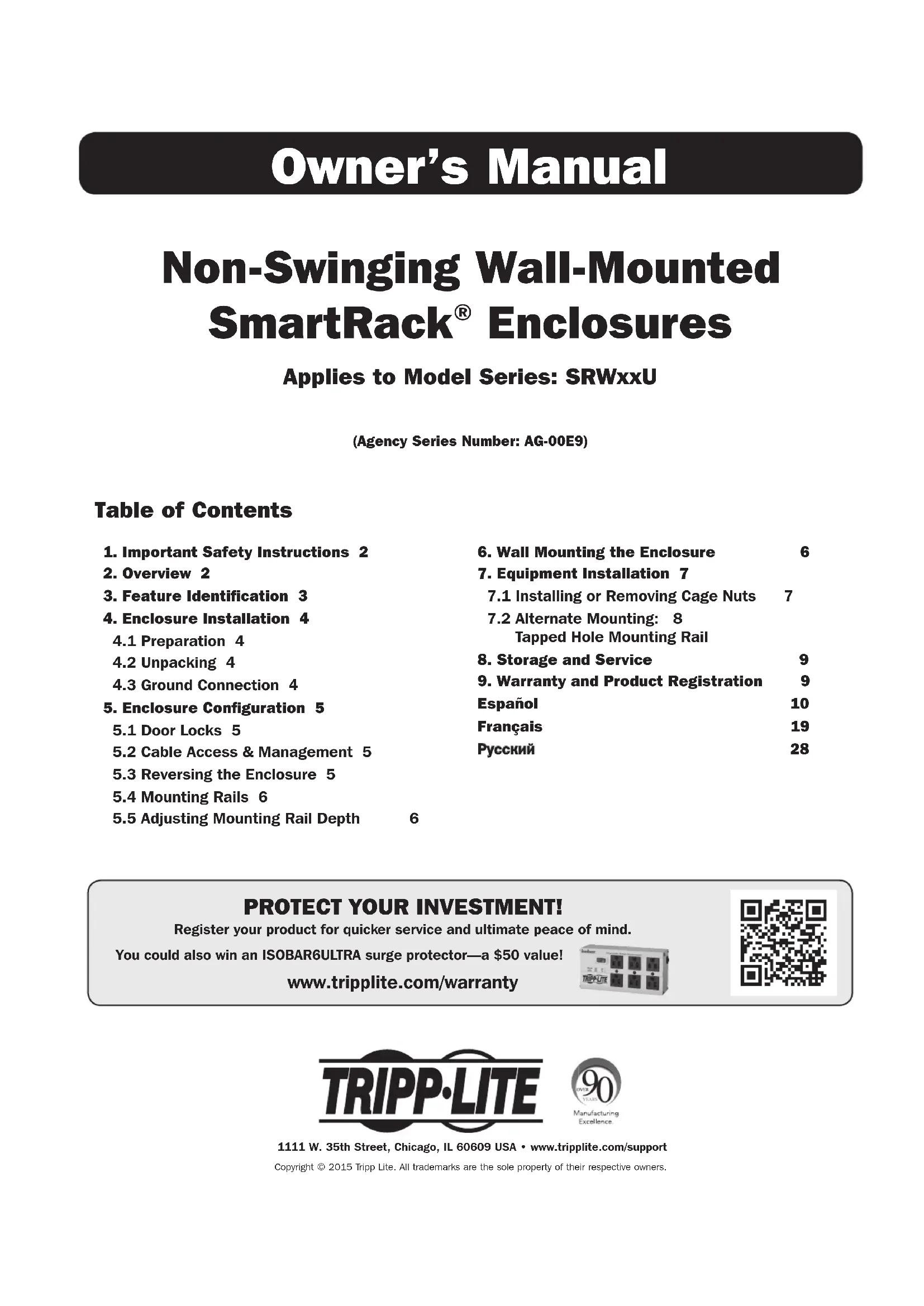 S'applique à la gamme : SRWxxU (Numéro de série de l'agence : AG-00E9) Manuel d'utilisation 1111 W. 35th Street, Chicago, IL 60609 USA • www.tripplite.com/support Copyright © 2015 Tripp Lite. Toutes les marques de commerce appartiennent à leurs propriétaires respectifs.20