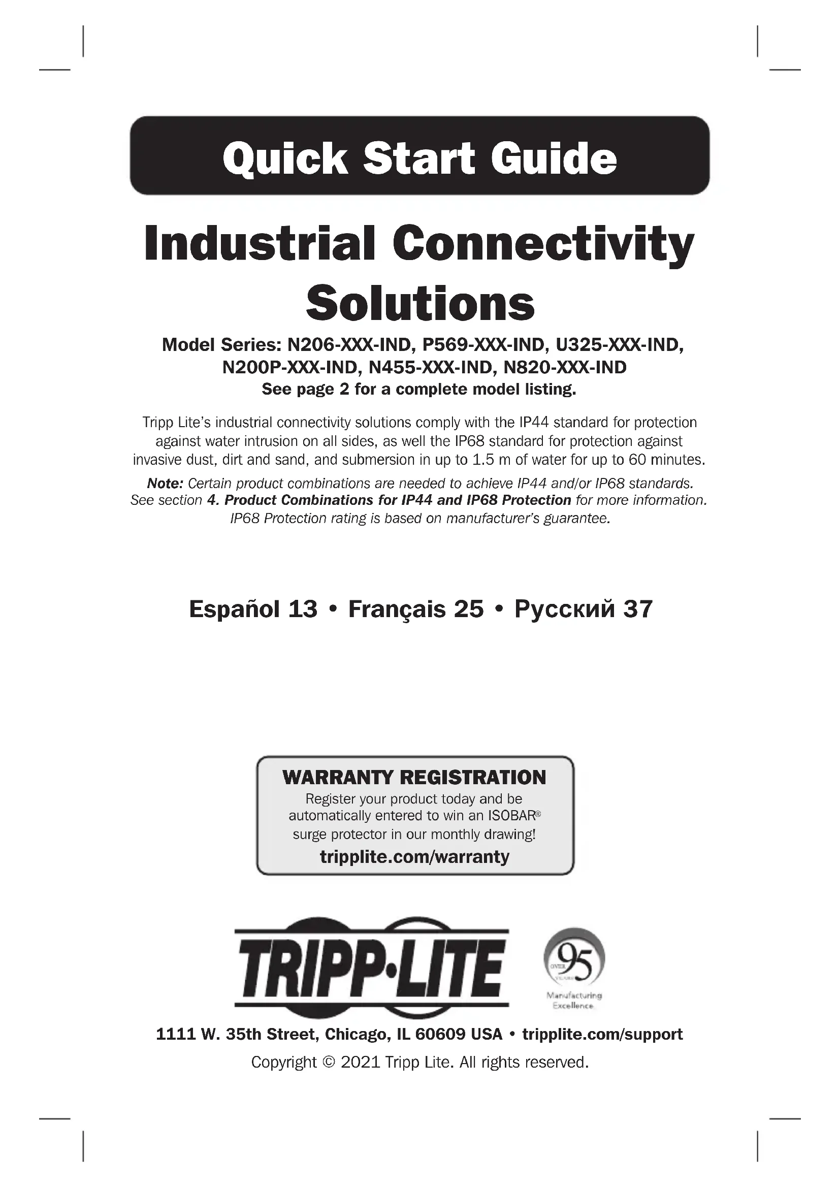 - De retourner le nouvel équipement afin qu'il soit recyclé à la fin de sa vie utile Il n'est pas recommandé d'utiliser cet équipement pour des appareils de survie où une défaillance de cet équipement peut, selon toute vraisemblance, entraîner la défaillance de l’appareil de maintien de la vie ou affecter de façon majeure sa sécurité ou son efficacité. La politique de Tripp Lite en est une d'amélioration continue. Les caractéristiques techniques sont modifiables sans préavis. Les produits réels peuvent différer légèrement des photos et des illustrations.36 1111 W. 35th Street, Chicago, IL 60609 USA • tripplite.com/support 20-01-193 93-3774_RevB37 Краткое руководство пользователя Промышленные средства подключения Серии моделей: N206-XXX-IND, P569-XXX-IND, U325-XXX-IND, N200P-XXX-IND, N455-XXX-