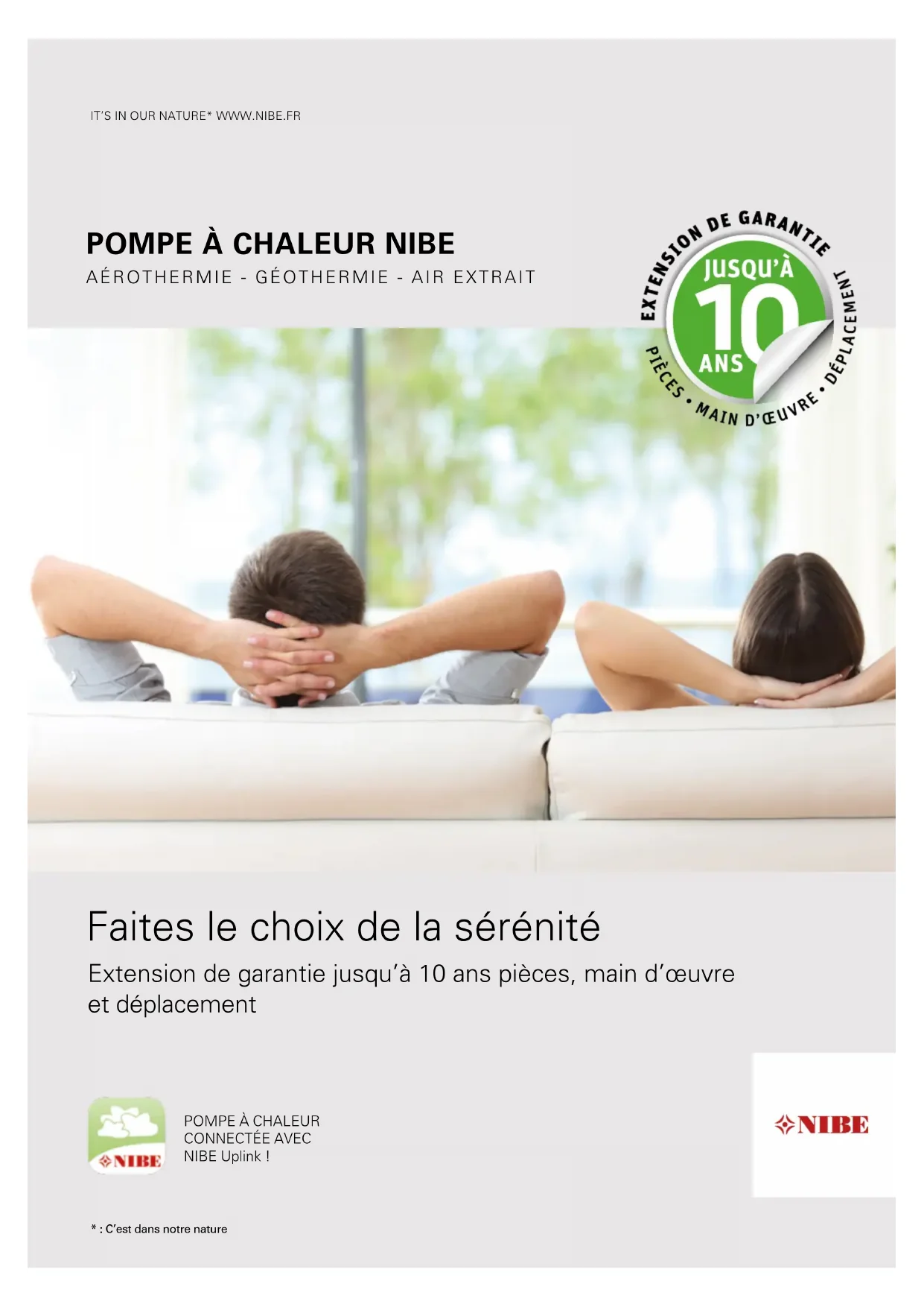 AÉROTHERMIE - GÉOTHERMIE - AIR EXTRAIT Faites le choix de la sérénité Extension de garantie jusqu’à 10 ans pièces, main d’œuvre et déplacement IT’S IN OUR NATURE* WWW.NIBE.FR POMPE À CHALEUR
