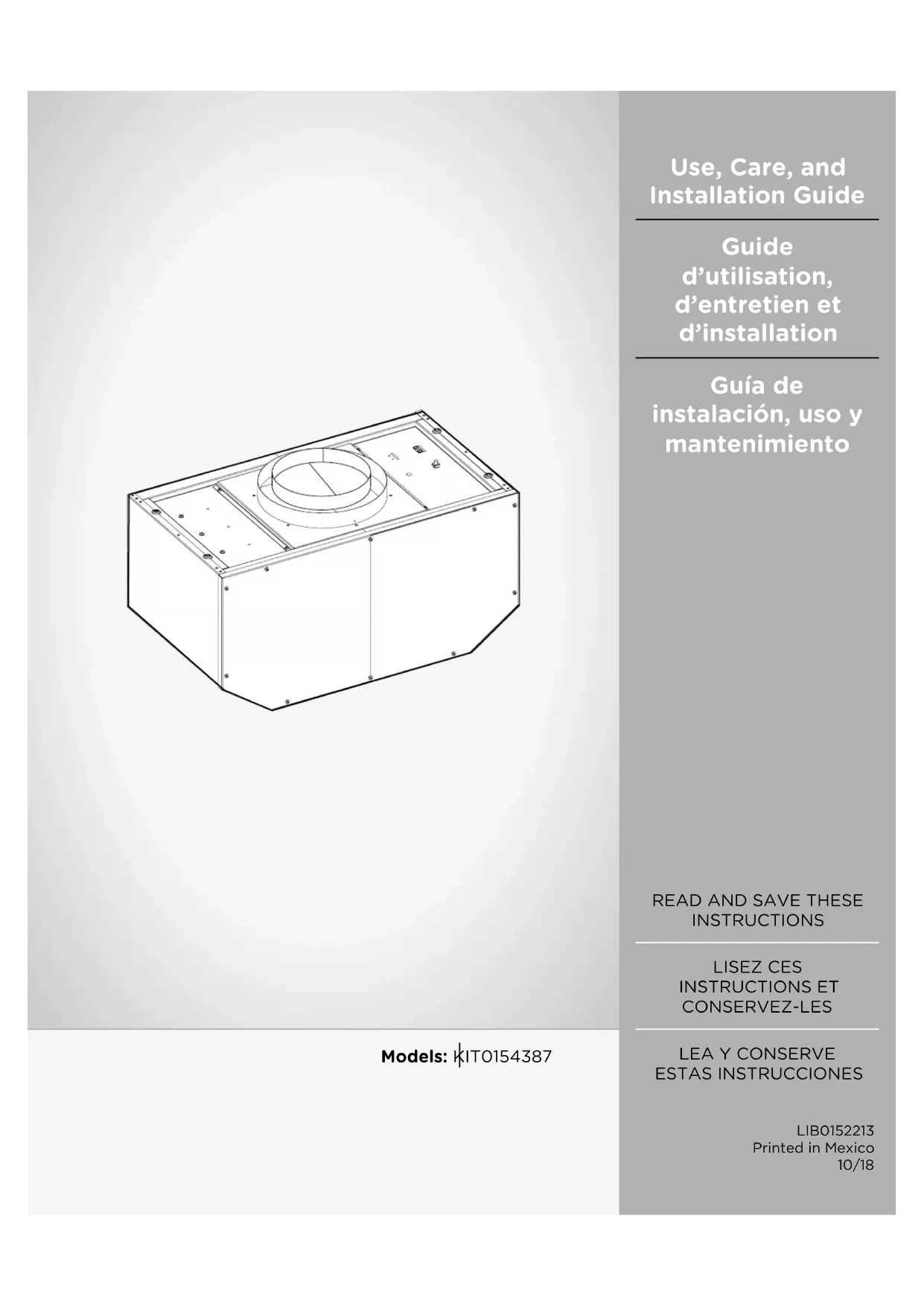 I ATTENTION UTILISER CET APPAREIL À DES FINS DE VENTILATIONGÉNÉRALE SEULEMENT. NE PAS UTILISER CET APPAREIL POUR ÉVACUER DES MATÉRIAUX OU DES VAPEURS DANGEREUX OU EXPLOSIFS. I AVERTISSEMENT POUR RÉDUIRE LES RISQUES D’INCENDIE, DE CHOC ÉLECTRIQUE ET DE BLESSURE, RESPECTER LES DIRECTIVES SUIVANTES:A. Utiliser cet appareil uniquement aux fins prévues par le fabricant. Si vous avez des questions à propos de l’appareil, communiquez avec le fabricant.B. Avant de faire l’entretien de l’appareil ou de le nettoyer, coupez l’alimentation dans le panneau électrique et verrouillez le panneau en bloquant le dispositif permettant d’empêcher d’activer l’alimentation accidentellement. S’il n’est pas possible de verrouiller l’accès au panneau, fixez une étiquette très voyante au panneau électrique.C. Une personne qualifiée doit eectuer l’installation et le câblage des fils électriques en conformité avec tous les codes et toutes les normes, y compris la cote de résistance au feu.D. Il est important de prévoir susamment d’air pour assurer une bonne combustion de l’équipement de chaue et l’éva-cuation adéquates des gaz par le conduit de cheminé afin de prévenir les refoulements d’air. Respectez les directives et les normes de sécurité des fabricants de l’équipement de chauage, comme celles publiées par la National Fire Protection Association (NFPA), la American Society for Heating, Refrigeration and Air Conditioning Engineers (AS-HRAE) et le code des autorités de votre région.E. Au moment de couper ou de percer un mur ou un plafond, assurez-vous de ne pas endommager la filerie électrique ou tout autre accès à un service publique.F. Il faut toujours évacuer à l’extérieur les systèmes conduit. I ATTENTION Pour réduire les risques d’incendie et évacuer l’air correctement, assurez-vous que le conduit mène à l’extérieur; il ne faut pas évacuer l’air dans l’espace entre les murs, dans les plafonds, dans les greniers, les vides sanitaires ou les garages. I AVERTISSEMENT POUR RÉDUIRE DES RISQUES D’INCENDIE, UTILISEZ UNIQUEMENT DES CONDUITS EN MÉTAL.Installez cette hotte en respectant toutes les exigencesmentionnées. I AVERTISSEMENT Pour réduire les risques d’incendie et de choc électrique, n’utilisez pas cette hotte avec un contrôleur de vitesse à semi-conducteurs. I AVERTISSEMENT POUR RÉDUIRE LES RISQUES D’INCENDIE DE GRAISSE SUR LES CUISINIÈRES.a) Ne laissez jamais la cuisinière sans surveillance lorsqu’elle est réglée à une haute température. Les débordements par bouillonnement causent de la fumée et des débordements de gras qui peuvent s’enflammer. Faites chauer l’huile lentement, à une température basse ou moyenne. b) Faites toujours fonctionner la hotte lorsque vous utilisez la cuisinière à une haute température ou que vous faites flamber des aliments (P. ex.: crêpes Suzette, cerises jubilées, boeuf au poivre flambé). c) Nettoyez les hélices de ventilation fréquemment. Il ne faut pas que la graisse s’accumule sur les filres ou les hélices.d) Utilisez le bon format de casserole. Utilisez toujours un chaudron de taille approprié à l’élément de la cuisinière.e) Convient pour utilisation dans la zone de cuisson domestique. I AVERTISSEMENT POUR ÉVITER DE BLESSER QUELQU’UN LORS D’UN INCENDIE DE GRAISSE SUR LA CUISINIÈRE, SUIVRE LES CONSEILS SUIVANTS: a) ÉTOUFFER LES FLAMMES avec un couvercle aux dimensions de la taque de cuisson, une tôle à biscuit ou tout autre plateau métallique, puis couper le gaz ou l’alimentation électrique de la cuisinière. FAIRE ATTENTION A NE PAS SE BRÛLER. Si les flammes ne s’éteignent pas immédiatement, QUITTER LA PIÈCE ET APPELER LES POMPIERS.b) NE JAMAIS PRENDRE EN MAIN UNE CASSEROLE N FEU, vous pourriez vous blesser.c) NE PAS UTILISER D’EAU, y compris les essuies de vaisselle ou les serviettes humides – une violente explosion due à la vapeur formée pourrait survenir.d) Utiliser un extincteur SEULEMENT si:1) Vous êtes sûr d’avoir un extincteur de classe ABC que vous savez utiliser.2) Le feu est petit et confiné à la zone où il s’est formé.3) Les pompiers ont été appelés.4) Vous pouvez lutter contre le feu avec une sortie derrière vous.a Recommandations tirées des conseils de sécurité en cas d’incendie de cuisine publiés par la NFPA. I AVERTISSEMENT Pour réduire les risques d’incendie, de choc électrique et de blessure des personnes, le kit, modèle KIT0154387, doit être installé avec les hottes de cuisinières suivantes. Les autres fourchettes ne peuvent pas être substituées: ECL630S4, ECL136S4, ECL142S4, ECL148S4, EVV636S1EVV648S1, EVI642S1, EVI648S1, ELN630S2, ELN136S2, ELN142S2, ELN148S1, ELI142S2, ELI136S2, ETR134S1,EAR140S4, EAR146S4, EAR628S4, EAR134S4.18