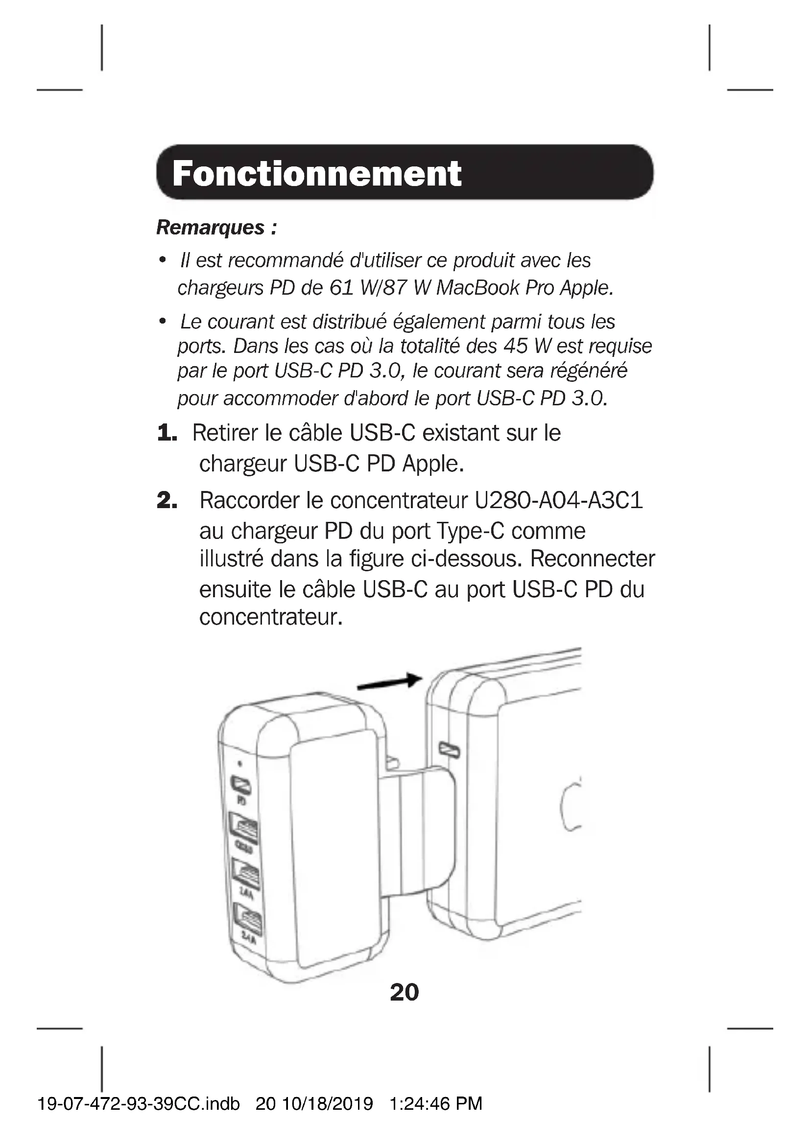 - Câble USB 2.0 A robuste à Micro-B U050- 003-GY-MAX, (0,9 m/3 pi) PD 3.0 USB-C (45 W) QC 3.0 USB-A USB-A 2,4 A 19-07-472-93-39CC.indb 19 10/18/2019 1:24:46 PM20 Fonctionnement Remarques :