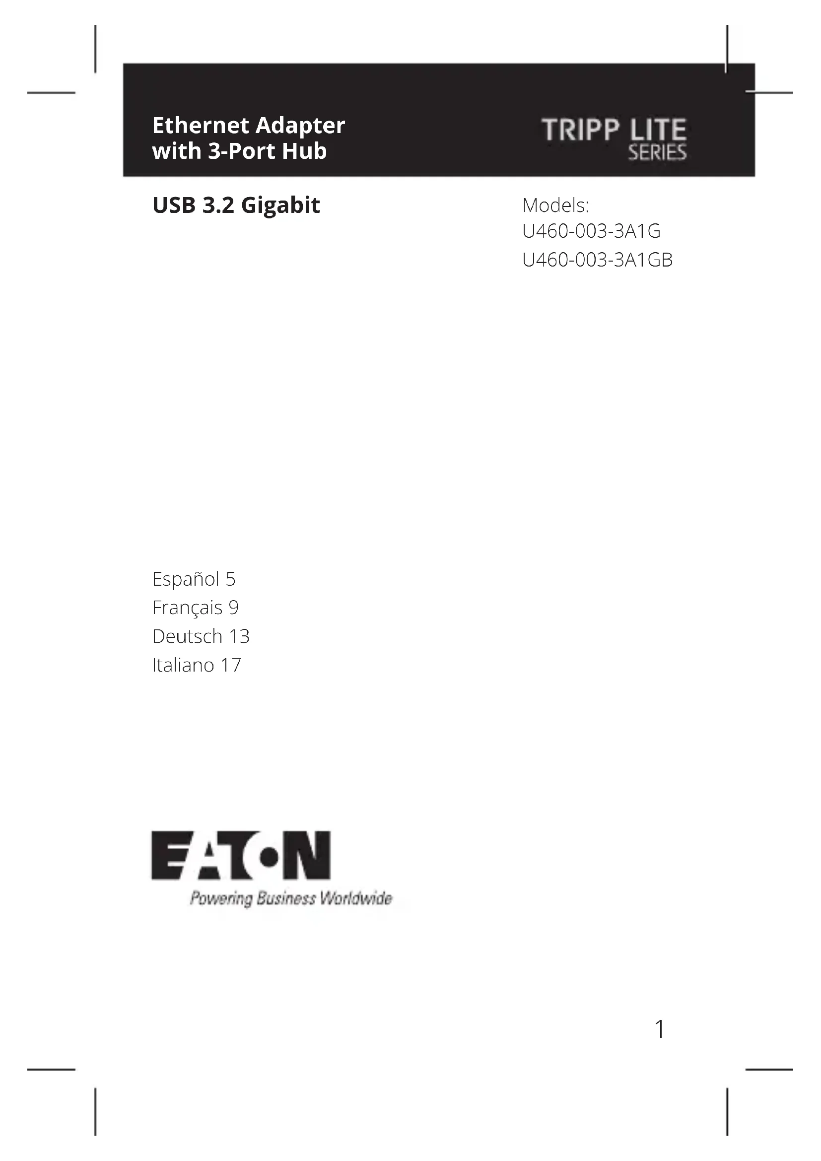- D'envoyer le vieil équipement au recyclage en autant qu'il remplace un équipement équivalent (cela varie selon les pays) Numéros d'identication à la conformité réglementaire À des ns de certication de conformité réglementaire et d'identication, un numéro de série unique a été attribué au produit. Le numéro de série, ainsi que toutes les marques d'homologation et les renseignements requis, se trouvent sur la plaque signalétique du produit. Lorsque des renseignements sont demandés concernant la conformité de ce produit, toujours se reporter au numéro de série. Le numéro de série ne doit pas être confondu avec le nom de la marque ou le numéro de modèle du produit. La politique d'Eaton en est une d'amélioration continue. Les caractéristiques techniques sont modiables sans préavis.13 Ethernet-Adapter mit 3-Port-Nabe Modelle: U460-003-3A1G U460-003-3A1GB USB 3.2 Gigabit English 1 Español 5 Français 9 Italiano 1714 Produktmerkmale Paketinhalt Optionales Zubehör