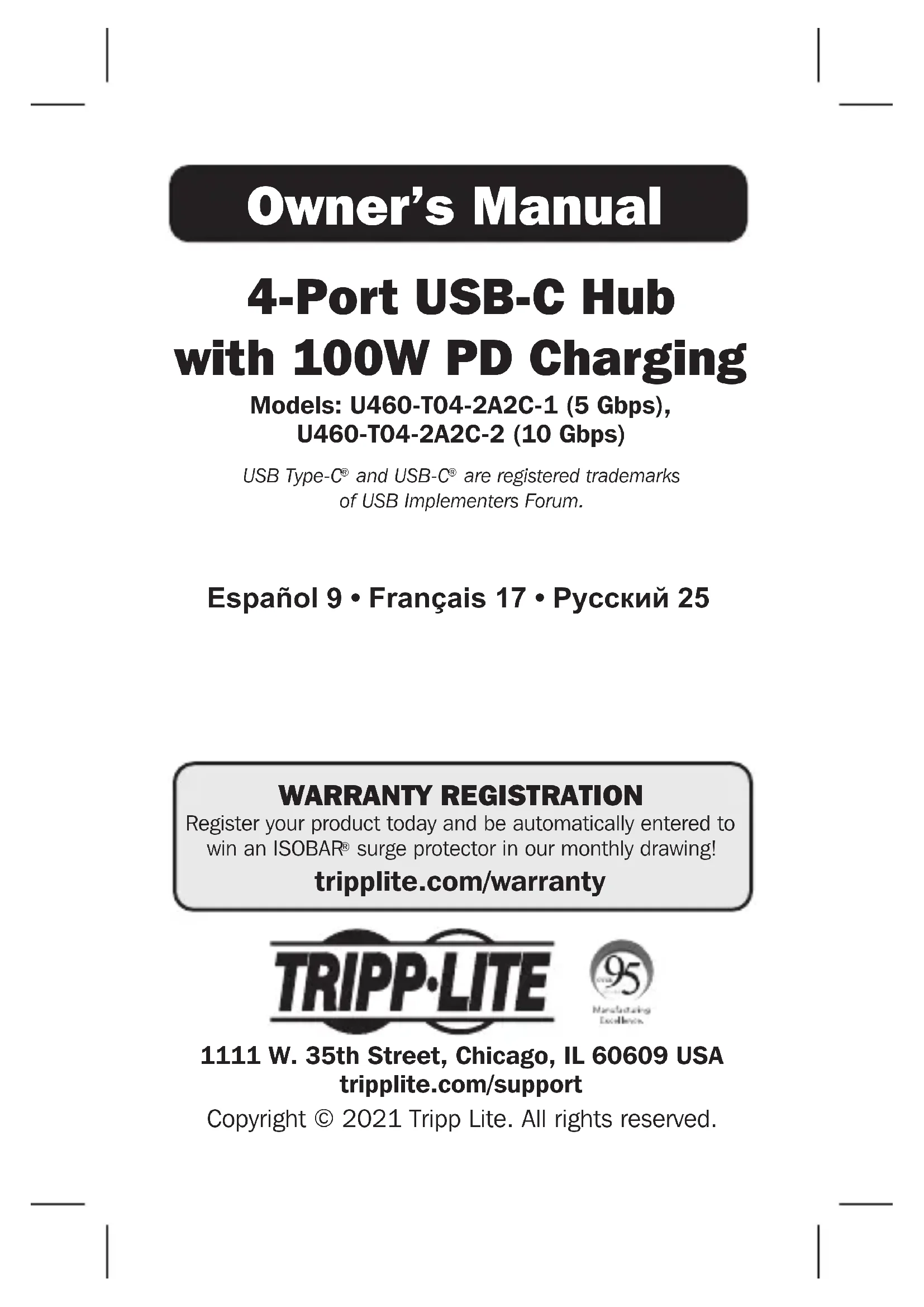 - Consulter le fournisseur ou un technicien radio/télévision pour obtenir de l'aide.24 1111 W. 35th Street, Chicago, IL 60609 USA tripplite.com/support Tout changement ou modification apportés à ce matériel sans l'autorisation expresse de Tripp Lite peuvent annuler le droit de l'utilisateur d'utiliser cet équipement. Il n'est pas recommandé d'utiliser cet équipement pour des appareils de survie où une défaillance de cet équipement peut, selon toute vraisemblance, entraîner la défaillance de l’appareil de maintien de la vie ou affecter de façon majeure sa sécurité ou son efficacité. La politique de Tripp Lite en est une d'amélioration continue. Les caractéristiques techniques sont modifiables sans préavis. Les produits réels peuvent différer légèrement des photos et des illustrations. Garantie 21-09-260 9338A5_RevB25 1111 W. 35th Street, Chicago, IL 60609 USA tripplite.com/support Охраняется авторским правом © 2022 Tripp Lite. Все торговые знаки являются исключительной собственностью своих соответствующих владельцев. 4-портовый концентратор USB-C с зарядкой PD Charging мощностью 100 Вт Модели: U460-T04-2A2C-1 (5 Гбит/с), U460-T04-2A2C-2 (10 Гбит/с) USB Type-C® и USB-C® являются зарегистрированными товарными знаками компании USB Implementers Forum. Руководство пользователя English 1 • Español 9 • Français 1726 Содержимое упаковки Опциональные комплектующие