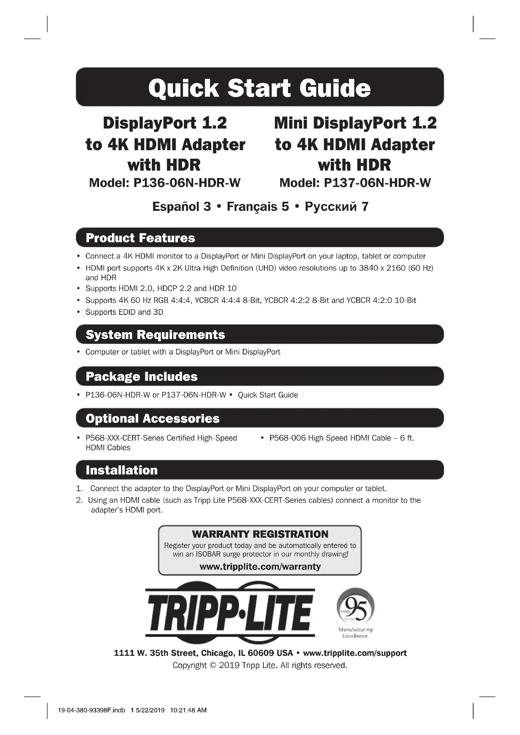 2. À l'aide d'un câble HDMI (comme les câbles de la série P568-XXX-CERT de Tripp Lite) raccorder un moniteur au port HDMI de l'adaptateur. English 1 • Español 3 • Русский 7 19-04-380-93398F.indb 5 5/22/2019 10:21:49 AM6 Caractéristiques techniques Garantie Signal d'entrée DisplayPort 1.2 ou Mini DisplayPort 1.2 Signal de sortie HDMI Plage de fréquence verticale 60 Hz Résolution HDMI maximale 4K x 2K, 3 840 x 2 160 (60 Hz) Température de fonctionnement 0 à 45 °C (32 à 113 °F) Humidité de fonctionnement 10 à 85 % HR, sans condensation Température d'entreposage -10 à 70 °C (14 à 158 °F) Humidité d'entreposage 5 à 90 % HR, sans condensation Garantie limitée de 3 ans Tripp Lite garantit que ses produits sont exempts de vices de matériaux et de fabrication pendant une période de trois (3) ans à partir de la date d'achat initiale. La responsabilité de Tripp Lite, en vertu de la présente garantie, se limite à la réparation ou au remplacement (à sa seule discrétion) de ces produits défectueux. Pour obtenir réparation sous cette garantie, vous devez obtenir un numéro d'autorisation de retour de matériel (« RMA ») auprès de Tripp Lite ou d'un centre de réparation autorisé par Tripp Lite. Les produits doivent être retournés à Tripp Lite ou à un centre de réparation autorisé par Tripp Lite en port prépayé et être accompagnés d'une brève description du problème et d'un justificatif de la date et du lieu d'achat. Cette garantie ne s'applique pas au matériel ayant été endommagé suite à un accident, à une négligence ou à une application abusive, ou ayant été altéré ou modifié d'une façon quelconque. SAUF INDICATION CONTRAIRE DANS LES PRÉSENTES, Tripp Lite N'ÉMET AUCUNE GARANTIE, EXPRESSE OU TACITE, Y COMPRIS DES GARANTIES DE QUALITÉ COMMERCIALE ET D'ADÉQUATION À UN USAGE PARTICULIER. Certains États n'autorisant pas la limitation ni l'exclusion de garanties tacites, les limitations ou exclusions susmentionnées peuvent ne pas s'appliquer à l'acheteur. À L'EXCEPTION DES DISPOSITIONS CI-DESSUS, Tripp Lite NE POURRA EN AUCUN CAS ÊTRE TENUE RESPONSABLE DE DOMMAGES DIRECTS, INDIRECTS, SPÉCIAUX, FORTUITS OU CONSÉCUTIFS RÉSULTANT DE L'UTILISATION DE CE PRODUIT, MÊME SI AYANT ÉTÉ AVISÉE DE L'ÉVENTUALITÉ DE TELS DOMMAGES. Plus précisément, Tripp Lite ne pourra être tenue responsable de coûts, tels que perte de bénéfices ou de recettes, perte de matériel, impossibilité d'utilisation du matériel, perte de logiciel, perte de données, frais de produits de remplacement, réclamations d'un tiers ou autres. Renseignements sur la conformité à la directive DEEE pour les clients de Tripp Lite et les recycleurs (Union européenne) En vertu de la directive et des règlements d'application relatifs aux déchets d'équipements électriques et électroniques (DEEE), lorsque des clients achètent de l'équipement électrique et électronique neuf de Tripp Lite, ils ont droit :