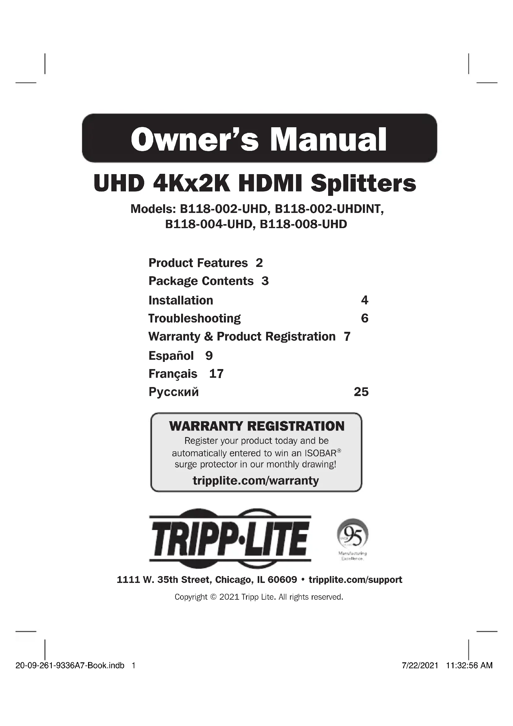 - Renvoyer le matériel neuf pour recyclage quand ceci devient éventuellement un rebut AVERTISSEMENT Il est déconseillé d’utiliser cet équipement dans des applications médicales où une panne de cet équipement pourrait normalement provoquer la panne de l’équipement de survie ou altérer notablement sa sécurité ou son efficacité. La politique de Tripp Lite en est une d’amélioration continue. Les spécifications sont sujettes à changement sans préavis. 1111 W. 35th Street, Chicago, IL 60609 • tripplite.com/support Garantie 20-09-261 93-36A7_RevF 20-09-261-9336A7-Book.indb 2420-09-261-9336A7-Book.indb 24 7/22/2021 11:32:59 AM7/22/2021 11:32:59 AM25 Руководство пользователя Разветвители UHD 4Kx2K HDMI Модели: B118-002-UHD, B118-002-UHDINT
